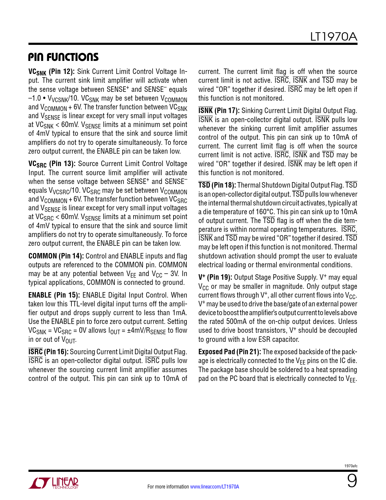 LT1970A pin FuncTionsVCSNK (Pin 12): Sink Current Limit Control Voltage In- current. The current limit flag is off when the source put. The current sink limit amplifier will activate when current limit is not active. ISRC, ISNK and TSD may be the sense voltage between SENSE+ and SENSE– equals wired “OR” together if desired. ISRC may be left open if –1.0 • VVCSNK/10. VCSNK may be set between VCOMMON this function is not monitored. and VCOMMON + 6V. The transfer function between VCSNK ISNK (Pin 17): Sinking Current Limit Digital Output Flag. and VSENSE is linear except for very small input voltages ISNK is an open-collector digital output. ISNK pulls low at VCSNK < 60mV. VSENSE limits at a minimum set point whenever the sinking current limit amplifier assumes of 4mV typical to ensure that the sink and source limit control of the output. This pin can sink up to 10mA of amplifiers do not try to operate simultaneously. To force current. The current limit flag is off when the source zero output current, the ENABLE pin can be taken low. current limit is not active. ISRC, ISNK and TSD may be VCSRC (Pin 13): Source Current Limit Control Voltage wired “OR” together if desired. ISNK may be left open if Input. The current source limit amplifier will activate this function is not monitored. when the sense voltage between SENSE+ and SENSE– TSD (Pin 18): Thermal Shutdown Digital Output Flag. TSD equals VVCSRC/10. VCSRC may be set between VCOMMON is an open-collector digital output. TSD pulls low whenever and VCOMMON + 6V. The transfer function between VCSRC the internal thermal shutdown circuit activates, typically at and VSENSE is linear except for very small input voltages a die temperature of 160°C. This pin can sink up to 10mA at VCSRC < 60mV. VSENSE limits at a minimum set point of output current. The TSD flag is off when the die tem- of 4mV typical to ensure that the sink and source limit perature is within normal operating temperatures. ISRC, amplifiers do not try to operate simultaneously. To force ISNK and TSD may be wired “OR” together if desired. TSD zero output current, the ENABLE pin can be taken low. may be left open if this function is not monitored. Thermal COMMON (Pin 14): Control and ENABLE inputs and flag shutdown activation should prompt the user to evaluate outputs are referenced to the COMMON pin. COMMON electrical loading or thermal environmental conditions. may be at any potential between VEE and VCC – 3V. In V+ (Pin 19): Output Stage Positive Supply. V+ may equal typical applications, COMMON is connected to ground. VCC or may be smaller in magnitude. Only output stage ENABLE (Pin 15): ENABLE Digital Input Control. When current flows through V+, all other current flows into VCC. taken low this TTL-level digital input turns off the ampli- V+ may be used to drive the base/gate of an external power fier output and drops supply current to less than 1mA. device to boost the amplifier’s output current to levels above Use the ENABLE pin to force zero output current. Setting the rated 500mA of the on-chip output devices. Unless VCSNK = VCSRC = 0V allows IOUT = ±4mV/RSENSE to flow used to drive boost transistors, V+ should be decoupled in or out of VOUT. to ground with a low ESR capacitor. ISRC (Pin 16): Sourcing Current Limit Digital Output Flag. Exposed Pad (Pin 21): The exposed backside of the pack- ISRC is an open-collector digital output. ISRC pulls low age is electrically connected to the VEE pins on the IC die. whenever the sourcing current limit amplifier assumes The package base should be soldered to a heat spreading control of the output. This pin can sink up to 10mA of pad on the PC board that is electrically connected to VEE. 1970afc For more information www.linear.com/LT1970A 9 Document Outline Features Applications Description Typical Application Absolute Maximum Ratings Pin Configuration Order Information Electrical Characteristics Typical Performance Characteristics Pin Functions Block Diagram And Test Circuit Applications Information Package Description Applications Information Related Parts