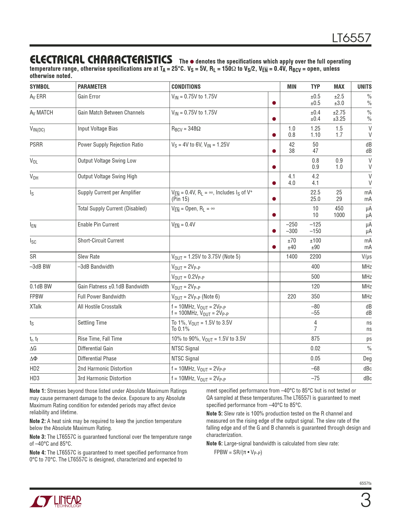 LT6557 TheELECTRICAL CHARACTERISTICS ● denotes the specifi cations which apply over the full operatingtemperature range, otherwise specifi cations are at TA = 25°C. VS = 5V, RL = 150 Ω to VS/2, VEN = 0.4V, RBCV = open, unless otherwise noted.SYMBOLPARAMETERCONDITIONSMINTYPMAXUNITS AV ERR Gain Error VIN = 0.75V to 1.75V ±0.5 ±2.5 % ● ±0.5 ±3.0 % AV MATCH Gain Match Between Channels VIN = 0.75V to 1.75V ±0.4 ±2.75 % ● ±0.4 ±3.25 % VIN(DC) Input Voltage Bias RBCV = 348Ω 1.0 1.25 1.5 V ● 0.8 1.10 1.7 V PSRR Power Supply Rejection Ratio VS = 4V to 6V, VIN = 1.25V 42 50 dB ● 38 47 dB VOL Output Voltage Swing Low 0.8 0.9 V ● 0.9 1.0 V VOH Output Voltage Swing High 4.1 4.2 V ● 4.0 4.1 V IS Supply Current per Amplifi er VEN = 0.4V, RL = ∞, Includes IS of V+ 22.5 25 mA (Pin 15) ● 25.0 29 mA Total Supply Current (Disabled) VEN = Open, RL = ∞ 10 450 µA ● 10 1000 µA IEN Enable Pin Current VEN = 0.4V –250 –125 µA ● –300 –150 µA ISC Short-Circuit Current ±70 ±100 mA ● ±40 ±90 mA SR Slew Rate VOUT = 1.25V to 3.75V (Note 5) 1400 2200 V/µs –3dB BW –3dB Bandwidth VOUT = 2VP-P 400 MHz VOUT = 0.2VP-P 500 MHz 0.1dB BW Gain Flatness ±0.1dB Bandwidth VOUT = 2VP-P 120 MHz FPBW Full Power Bandwidth VOUT = 2VP-P (Note 6) 220 350 MHz XTalk All Hostile Crosstalk f = 10MHz, VOUT = 2VP-P –80 dB f = 100MHz, VOUT = 2VP-P –55 dB tS Settling Time To 1%, VOUT = 1.5V to 3.5V 4 ns To 0.1% 7 ns tr, tf Rise Time, Fall Time 10% to 90%, VOUT = 1.5V to 3.5V 875 ps ΔG Differential Gain NTSC Signal 0.02 % ΔΦ Differential Phase NTSC Signal 0.05 Deg HD2 2nd Harmonic Distortion f = 10MHz, VOUT = 2VP-P –68 dBc HD3 3rd Harmonic Distortion f = 10MHz, VOUT = 2VP-P –75 dBc Note 1: Stresses beyond those listed under Absolute Maximum Ratings meet specifi ed performance from –40°C to 85°C but is not tested or may cause permanent damage to the device. Exposure to any Absolute QA sampled at these temperatures.The LT6557I is guaranteed to meet Maximum Rating condition for extended periods may affect device specifi ed performance from –40°C to 85°C. reliability and lifetime. Note 5: Slew rate is 100% production tested on the R channel and Note 2: A heat sink may be required to keep the junction temperature measured on the rising edge of the output signal. The slew rate of the below the Absolute Maximum Rating. falling edge and of the G and B channels is guaranteed through design and Note 3: The LT6557C is guaranteed functional over the temperature range characterization. of –40°C and 85°C. Note 6: Large-signal bandwidth is calculated from slew rate: Note 4: The LT6557C is guaranteed to meet specifi ed performance from FPBW = SR/(π • VP-P) 0°C to 70°C. The LT6557C is designed, characterized and expected to 6557fa 3