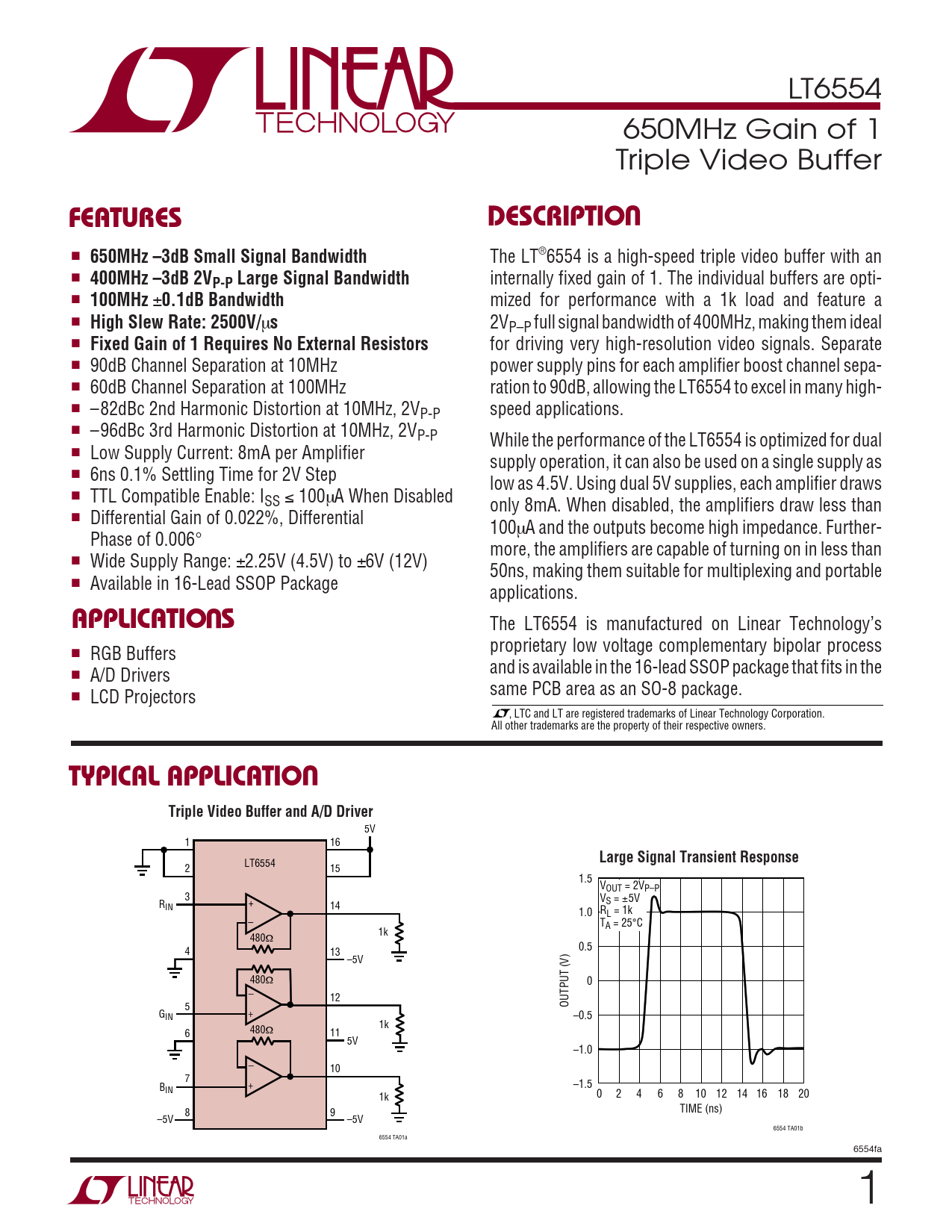 LT6554 650MHz Gain of 1 Triple Video Buffer UFEATURESDESCRIPTIO ■ 650MHz –3dB Small Signal Bandwidth The LT®6554 is a high-speed triple video buffer with an ■ 400MHz –3dB 2V internally fixed gain of 1. The individual buffers are opti- P-P Large Signal Bandwidth ■ 100MHz ± 0.1dB Bandwidth mized for performance with a 1k load and feature a ■ High Slew Rate: 2500V/ µ s 2VP–P full signal bandwidth of 400MHz, making them ideal ■ Fixed Gain of 1 Requires No External Resistors for driving very high-resolution video signals. Separate ■ 90dB Channel Separation at 10MHz power supply pins for each amplifier boost channel sepa- ■ 60dB Channel Separation at 100MHz ration to 90dB, allowing the LT6554 to excel in many high- ■ –82dBc 2nd Harmonic Distortion at 10MHz, 2V speed applications. P-P ■ –96dBc 3rd Harmonic Distortion at 10MHz, 2VP-P While the performance of the LT6554 is optimized for dual ■ Low Supply Current: 8mA per Amplifier supply operation, it can also be used on a single supply as ■ 6ns 0.1% Settling Time for 2V Step low as 4.5V. Using dual 5V supplies, each amplifier draws ■ TTL Compatible Enable: ISS ≤ 100µA When Disabled only 8mA. When disabled, the amplifiers draw less than ■ Differential Gain of 0.022%, Differential 100µA and the outputs become high impedance. Further- Phase of 0.006° more, the amplifiers are capable of turning on in less than ■ Wide Supply Range: ±2.25V (4.5V) to ±6V (12V) 50ns, making them suitable for multiplexing and portable ■ Available in 16-Lead SSOP Package U applications. APPLICATIO S The LT6554 is manufactured on Linear Technology’s proprietary low voltage complementary bipolar process ■ RGB Buffers and is available in the 16-lead SSOP package that fits in the ■ A/D Drivers same PCB area as an SO-8 package. ■ LCD Projectors , LTC and LT are registered trademarks of Linear Technology Corporation. All other trademarks are the property of their respective owners. UTYPICAL APPLICATIOTriple Video Buffer and A/D Driver 5V 1 16 Large Signal Transient Response LT6554 2 15 1.5 VOUT = 2VP–P 3 V R + S = ±5V IN 14 1.0 RL = 1k – TA = 25°C 1k 480Ω 4 0.5 13 –5V 480Ω 0 – 12 5 OUTPUT (V) G + IN –0.5 1k 6 480Ω 11 5V –1.0 – 10 7 + B –1.5 IN 1k 0 2 4 6 8 10 12 14 16 18 20 8 9 TIME (ns) –5V –5V 6554 TA01b 6554 TA01a 6554fa 1