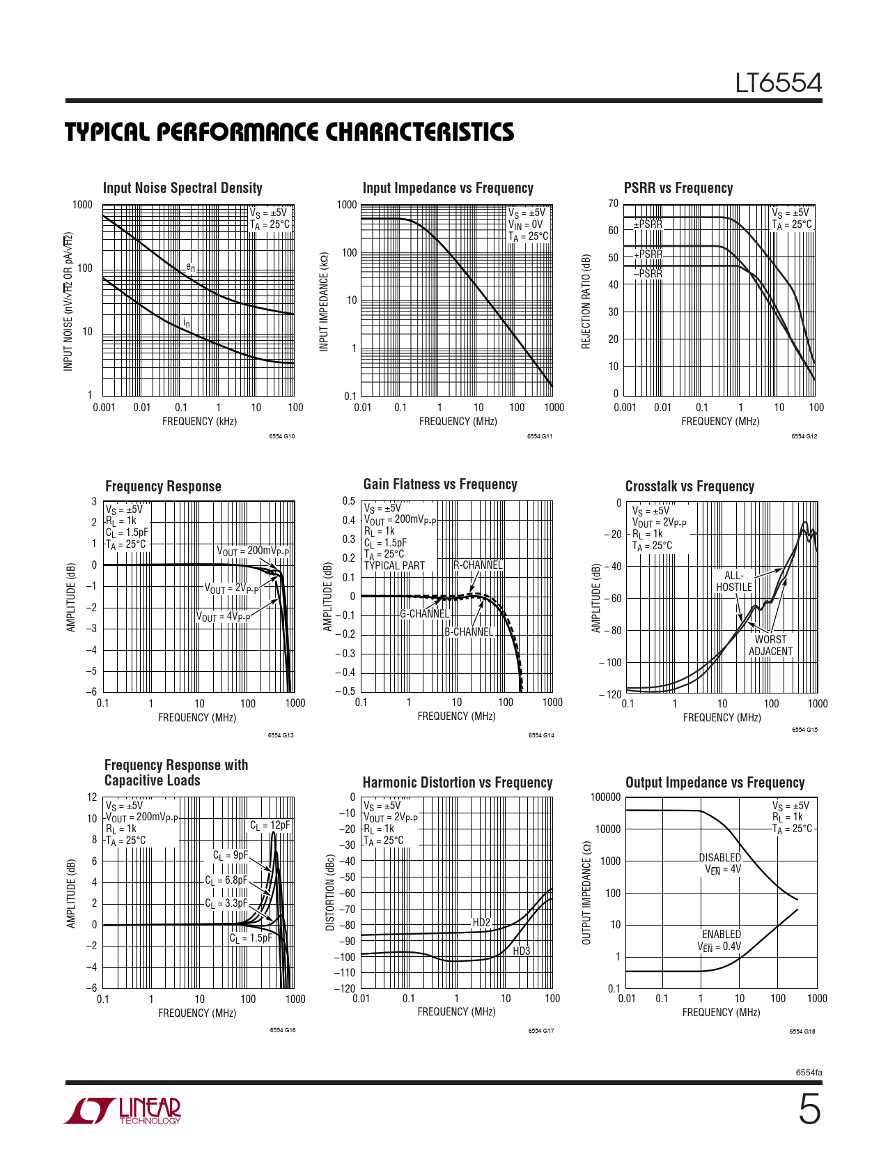 1000 1000 70 V V V S = ±5V S = ±5V S = ±5V TA = 25°C VIN = 0V ±PSRR T 60 A = 25°C T Hz) A = 25°C √ ) 100 +PSRR Ω 50 100 en –PSRR Hz OR pA/ 40 √ 10 30 in 10 20 REJECTION RATIO (dB) INPUT IMPEDANCE (k 1 INPUT NOISE (nV/ 10 1 0.1 0 0.001 0.01 0.1 1 10 100 0.01 0.1 1 10 100 1000 0.001 0.01 0.1 1 10 100 FREQUENCY (kHz) FREQUENCY (MHz) FREQUENCY (MHz) 6554 G10 6554 G11 6554 G12