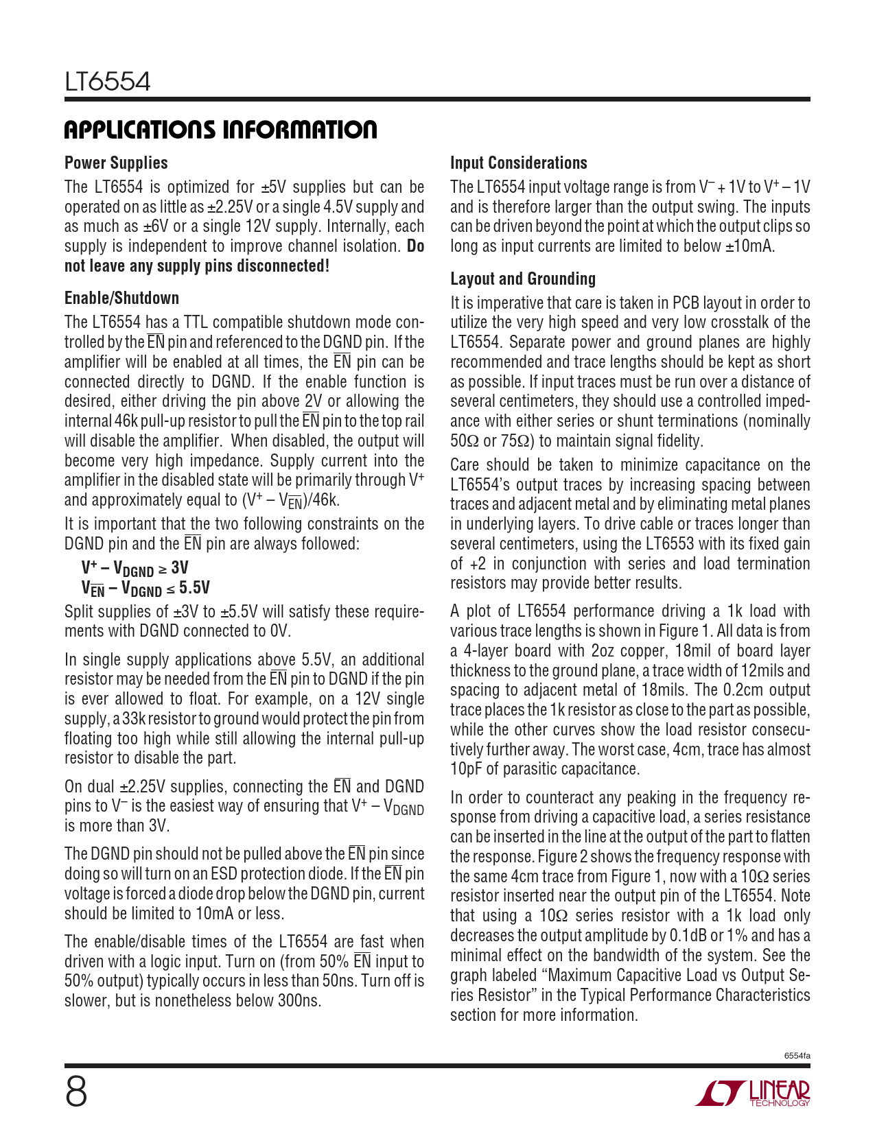LT6554 UUWUAPPLICATIO S I FOR ATIOPower SuppliesInput Considerations The LT6554 is optimized for ±5V supplies but can be The LT6554 input voltage range is from V– + 1V to V+ – 1V operated on as little as ±2.25V or a single 4.5V supply and and is therefore larger than the output swing. The inputs as much as ±6V or a single 12V supply. Internally, each can be driven beyond the point at which the output clips so supply is independent to improve channel isolation. Do long as input currents are limited to below ±10mA. not leave any supply pins disconnected!Layout and GroundingEnable/Shutdown It is imperative that care is taken in PCB layout in order to The LT6554 has a TTL compatible shutdown mode con- utilize the very high speed and very low crosstalk of the trolled by the EN pin and referenced to the DGND pin. If the LT6554. Separate power and ground planes are highly amplifier will be enabled at all times, the EN pin can be recommended and trace lengths should be kept as short connected directly to DGND. If the enable function is as possible. If input traces must be run over a distance of desired, either driving the pin above 2V or allowing the several centimeters, they should use a controlled imped- internal 46k pull-up resistor to pull the EN pin to the top rail ance with either series or shunt terminations (nominally will disable the amplifier. When disabled, the output will 50Ω or 75Ω) to maintain signal fidelity. become very high impedance. Supply current into the Care should be taken to minimize capacitance on the amplifier in the disabled state will be primarily through V+ LT6554’s output traces by increasing spacing between and approximately equal to (V+ – VEN)/46k. traces and adjacent metal and by eliminating metal planes It is important that the two following constraints on the in underlying layers. To drive cable or traces longer than DGND pin and the EN pin are always followed: several centimeters, using the LT6553 with its fixed gain V+ – V of +2 in conjunction with series and load termination DGND ≥ 3VV resistors may provide better results. EN – VDGND ≤ 5.5V Split supplies of ±3V to ±5.5V will satisfy these require- A plot of LT6554 performance driving a 1k load with ments with DGND connected to 0V. various trace lengths is shown in Figure 1. All data is from a 4-layer board with 2oz copper, 18mil of board layer In single supply applications above 5.5V, an additional thickness to the ground plane, a trace width of 12mils and resistor may be needed from the EN pin to DGND if the pin spacing to adjacent metal of 18mils. The 0.2cm output is ever allowed to float. For example, on a 12V single trace places the 1k resistor as close to the part as possible, supply, a 33k resistor to ground would protect the pin from while the other curves show the load resistor consecu- floating too high while still allowing the internal pull-up tively further away. The worst case, 4cm, trace has almost resistor to disable the part. 10pF of parasitic capacitance. On dual ±2.25V supplies, connecting the EN and DGND In order to counteract any peaking in the frequency re- pins to V– is the easiest way of ensuring that V+ – VDGND sponse from driving a capacitive load, a series resistance is more than 3V. can be inserted in the line at the output of the part to flatten The DGND pin should not be pulled above the EN pin since the response. Figure 2 shows the frequency response with doing so will turn on an ESD protection diode. If the EN pin the same 4cm trace from Figure 1, now with a 10Ω series voltage is forced a diode drop below the DGND pin, current resistor inserted near the output pin of the LT6554. Note should be limited to 10mA or less. that using a 10Ω series resistor with a 1k load only The enable/disable times of the LT6554 are fast when decreases the output amplitude by 0.1dB or 1% and has a driven with a logic input. Turn on (from 50% EN input to minimal effect on the bandwidth of the system. See the 50% output) typically occurs in less than 50ns. Turn off is graph labeled “Maximum Capacitive Load vs Output Se- slower, but is nonetheless below 300ns. ries Resistor” in the Typical Performance Characteristics section for more information. 6554fa 8