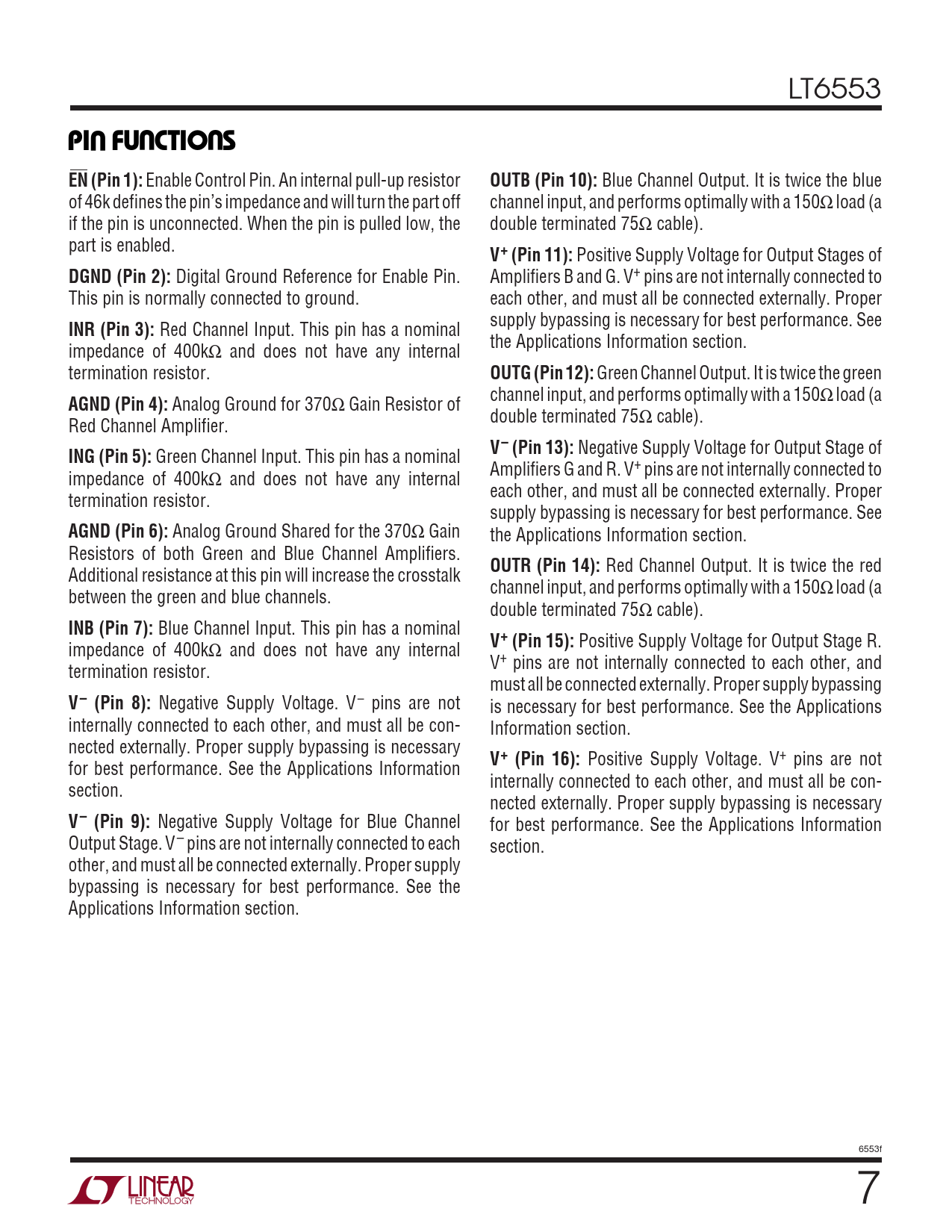 LT6553 UUUPI FU CTIO SEN (Pin 1): Enable Control Pin. An internal pull-up resistor OUTB (Pin 10): Blue Channel Output. It is twice the blue of 46k defines the pin’s impedance and will turn the part off channel input, and performs optimally with a 150Ω load (a if the pin is unconnected. When the pin is pulled low, the double terminated 75Ω cable). part is enabled. V+ (Pin 11): Positive Supply Voltage for Output Stages of DGND (Pin 2): Digital Ground Reference for Enable Pin. Amplifiers B and G. V+ pins are not internally connected to This pin is normally connected to ground. each other, and must all be connected externally. Proper supply bypassing is necessary for best performance. See INR (Pin 3): Red Channel Input. This pin has a nominal the Applications Information section. impedance of 400kΩ and does not have any internal termination resistor. OUTG (Pin 12): Green Channel Output. It is twice the green channel input, and performs optimally with a 150Ω load (a AGND (Pin 4): Analog Ground for 370Ω Gain Resistor of double terminated 75Ω cable). Red Channel Amplifier. V– (Pin 13): Negative Supply Voltage for Output Stage of ING (Pin 5): Green Channel Input. This pin has a nominal Amplifiers G and R. V+ pins are not internally connected to impedance of 400kΩ and does not have any internal each other, and must all be connected externally. Proper termination resistor. supply bypassing is necessary for best performance. See AGND (Pin 6): Analog Ground Shared for the 370Ω Gain the Applications Information section. Resistors of both Green and Blue Channel Amplifiers. OUTR (Pin 14): Red Channel Output. It is twice the red Additional resistance at this pin will increase the crosstalk channel input, and performs optimally with a 150Ω load (a between the green and blue channels. double terminated 75Ω cable). INB (Pin 7): Blue Channel Input. This pin has a nominal impedance of 400kΩ and does not have any internal V+ (Pin 15): Positive Supply Voltage for Output Stage R. V+ pins are not internally connected to each other, and termination resistor. must all be connected externally. Proper supply bypassing V– (Pin 8): Negative Supply Voltage. V– pins are not is necessary for best performance. See the Applications internally connected to each other, and must all be con- Information section. nected externally. Proper supply bypassing is necessary V+ (Pin 16): Positive Supply Voltage. V+ pins are not for best performance. See the Applications Information internally connected to each other, and must all be con- section. nected externally. Proper supply bypassing is necessary V– (Pin 9): Negative Supply Voltage for Blue Channel for best performance. See the Applications Information Output Stage. V– pins are not internally connected to each section. other, and must all be connected externally. Proper supply bypassing is necessary for best performance. See the Applications Information section. 6553f 7