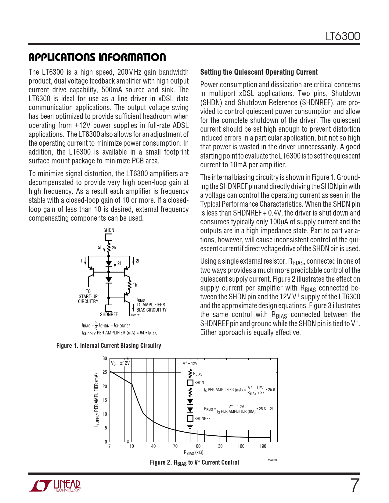 LT6300 UUWUAPPLICATIO S I FOR ATIO The LT6300 is a high speed, 200MHz gain bandwidth Setting the Quiescent Operating Current product, dual voltage feedback amplifier with high output Power consumption and dissipation are critical concerns current drive capability, 500mA source and sink. The in multiport xDSL applications. Two pins, Shutdown LT6300 is ideal for use as a line driver in xDSL data (SHDN) and Shutdown Reference (SHDNREF), are pro- communication applications. The output voltage swing vided to control quiescent power consumption and allow has been optimized to provide sufficient headroom when for the complete shutdown of the driver. The quiescent operating from ±12V power supplies in full-rate ADSL current should be set high enough to prevent distortion applications. The LT6300 also allows for an adjustment of induced errors in a particular application, but not so high the operating current to minimize power consumption. In that power is wasted in the driver unnecessarily. A good addition, the LT6300 is available in a small footprint starting point to evaluate the LT6300 is to set the quiescent surface mount package to minimize PCB area. current to 10mA per amplifier. To minimize signal distortion, the LT6300 amplifiers are The internal biasing circuitry is shown in Figure 1. Ground- decompensated to provide very high open-loop gain at ing the SHDNREF pin and directly driving the SHDN pin with high frequency. As a result each amplifier is frequency a voltage can control the operating current as seen in the stable with a closed-loop gain of 10 or more. If a closed- Typical Performance Characteristics. When the SHDN pin loop gain of less than 10 is desired, external frequency is less than SHDNREF + 0.4V, the driver is shut down and compensating components can be used. consumes typically only 100µA of supply current and the SHDN outputs are in a high impedance state. Part to part varia- tions, however, will cause inconsistent control of the qui- 5I 2k escent current if direct voltage drive of the SHDN pin is used. I 2I 2I Using a single external resistor, RBIAS, connected in one of two ways provides a much more predictable control of the quiescent supply current. Figure 2 illustrates the effect on 1k supply current per amplifier with R TO BIAS connected be- START-UP tween the SHDN pin and the 12V V+ supply of the LT6300 CIRCUITRY IBIAS TO AMPLIFIERS and the approximate design equations. Figure 3 illustrates BIAS CIRCUITRY SHDNREF 6300 F01 the same control with RBIAS connected between the 2 IBIAS = ISHDN = ISHDNREF SHDNREF pin and ground while the SHDN pin is tied to V+. 5 ISUPPLY PER AMPLIFIER (mA) = 64 • IBIAS Either approach is equally effective. Figure 1. Internal Current Biasing Circuitry 30 VS = ±12V V+ = 12V 25 RBIAS SHDN 20 V+ – 1.2V IS PER AMPLIFIER (mA) ≈ • 25.6 RBIAS + 2k 15 R V+ – 1.2V PER AMPLIFIER (mA) BIAS = • 25.6 – 2k I 10 S PER AMPLIFIER (mA) SHDNREF I SUPPLY 5 0 7 10 40 70 100 130 160 190 RBIAS (kΩ) 6300 F02 Figure 2. RBIAS to V+ Current Control 7