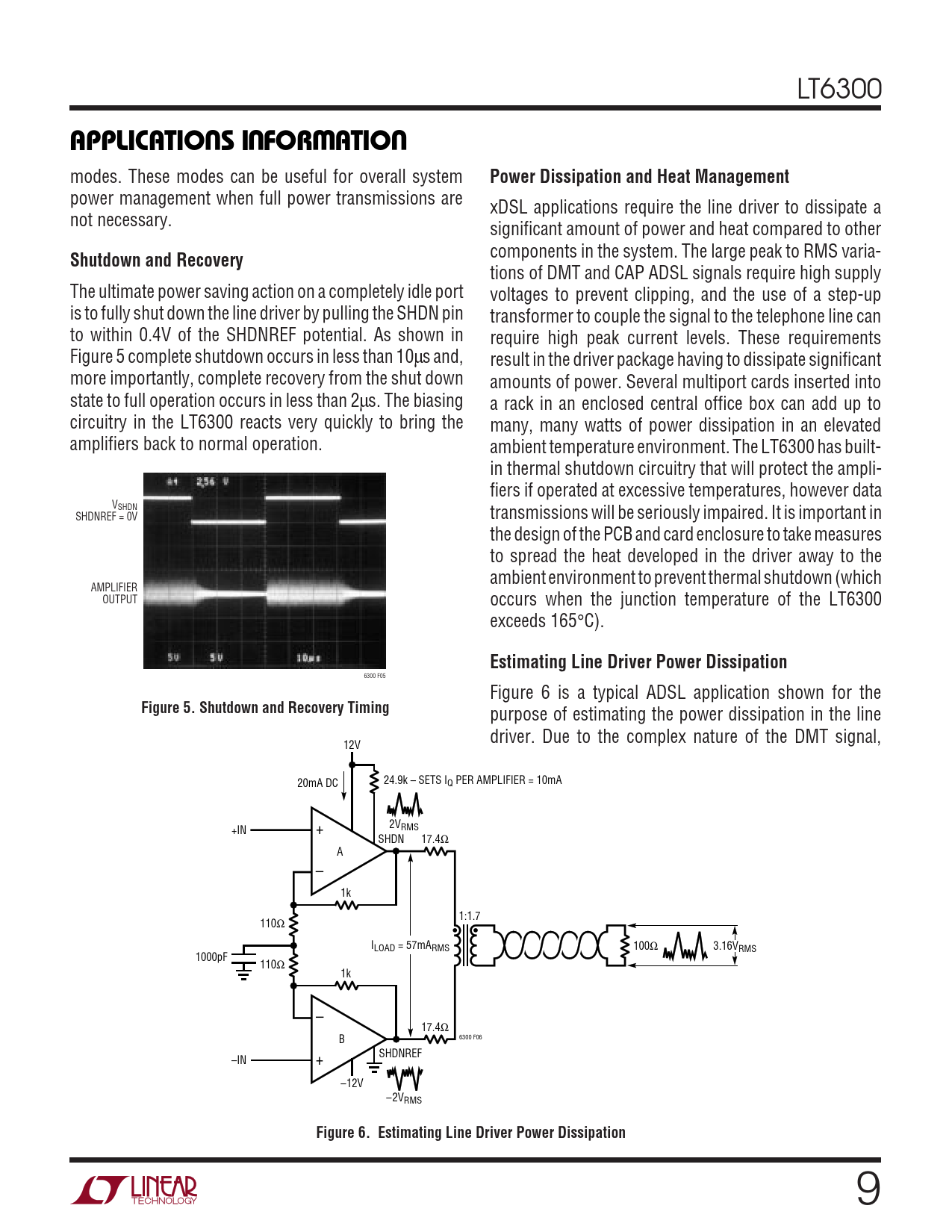 purpose of estimating the power dissipation in the line driver. Due to the complex nature of the DMT signal, 12V 20mA DC 24.9k – SETS IQ PER AMPLIFIER = 10mA 2V +IN + RMS SHDN 17.4Ω A – 1k 1:1.7 110Ω • • ILOAD = 57mARMS 100Ω 3.16VRMS 1000pF 110Ω 1k – 17.4Ω 6300 F06 B SHDNREF –IN + –12V –2VRMS