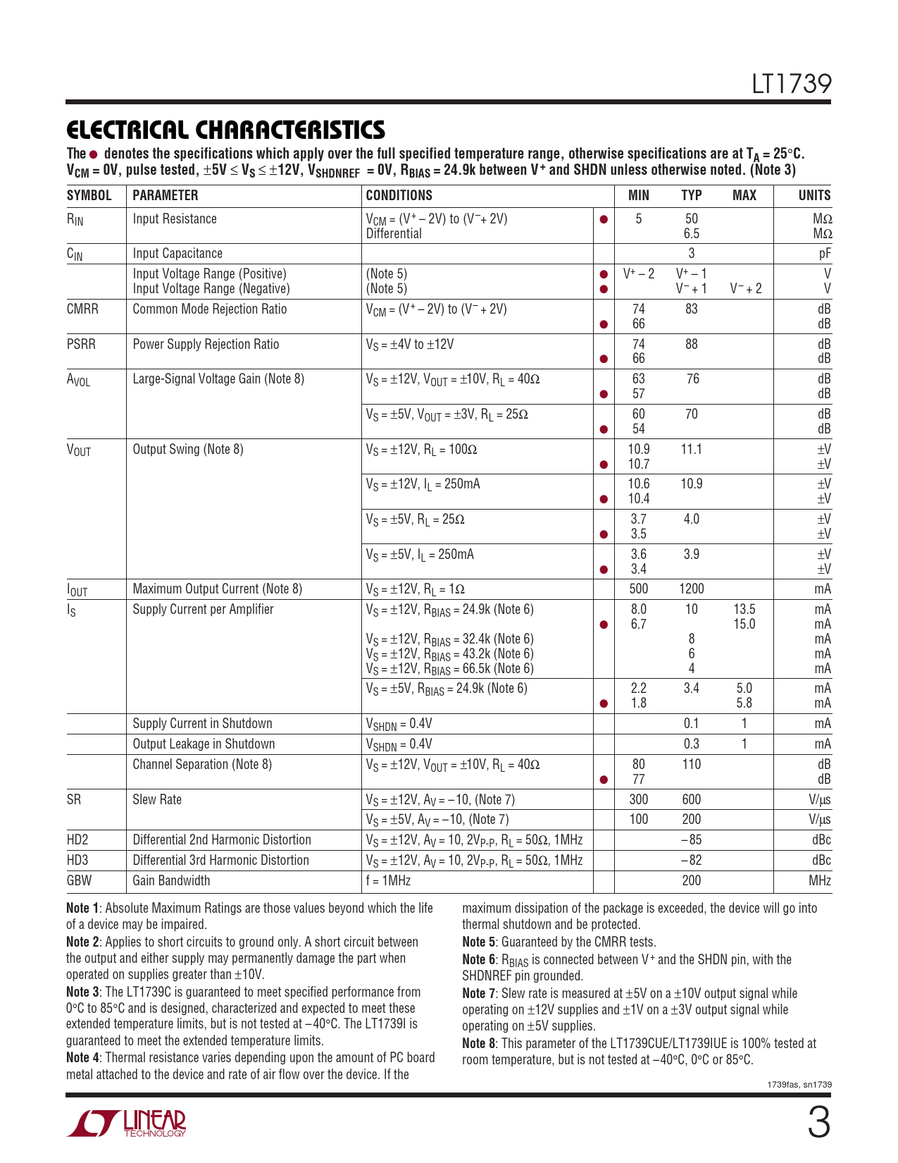 RIN Input Resistance VCM = (V+ – 2V) to (V–+ 2V) ● 5 50 MΩ Differential 6.5 MΩ CIN Input Capacitance 3 pF Input Voltage Range (Positive) (Note 5) ● V+ – 2 V+ – 1 V Input Voltage Range (Negative) (Note 5) ● V– + 1 V– + 2 V CMRR Common Mode Rejection Ratio VCM = (V+ – 2V) to (V– + 2V) 74 83 dB ● 66 dB PSRR Power Supply Rejection Ratio VS = ±4V to ±12V 74 88 dB ● 66 dB AVOL Large-Signal Voltage Gain (Note 8) VS = ±12V, VOUT = ±10V, RL = 40Ω 63 76 dB ● 57 dB VS = ±5V, VOUT = ±3V, RL = 25Ω 60 70 dB ● 54 dB VOUT Output Swing (Note 8) VS = ±12V, RL = 100Ω 10.9 11.1 ±V ● 10.7 ±V VS = ±12V, IL = 250mA 10.6 10.9 ±V ● 10.4 ±V VS = ±5V, RL = 25Ω 3.7 4.0 ±V ● 3.5 ±V VS = ±5V, IL = 250mA 3.6 3.9 ±V ● 3.4 ±V IOUT Maximum Output Current (Note 8) VS = ±12V, RL = 1Ω 500 1200 mA IS Supply Current per Amplifier VS = ±12V, RBIAS = 24.9k (Note 6) 8.0 10 13.5 mA ● 6.7 15.0 mA VS = ±12V, RBIAS = 32.4k (Note 6) 8 mA VS = ±12V, RBIAS = 43.2k (Note 6) 6 mA VS = ±12V, RBIAS = 66.5k (Note 6) 4 mA VS = ±5V, RBIAS = 24.9k (Note 6) 2.2 3.4 5.0 mA ● 1.8 5.8 mA Supply Current in Shutdown VSHDN = 0.4V 0.1 1 mA Output Leakage in Shutdown VSHDN = 0.4V 0.3 1 mA Channel Separation (Note 8) VS = ±12V, VOUT = ±10V, RL = 40Ω 80 110 dB ● 77 dB SR Slew Rate VS = ±12V, AV = – 10, (Note 7) 300 600 V/µs VS = ±5V, AV = –10, (Note 7) 100 200 V/µs HD2 Differential 2nd Harmonic Distortion VS = ±12V, AV = 10, 2VP-P, RL = 50Ω, 1MHz – 85 dBc HD3 Differential 3rd Harmonic Distortion VS = ±12V, AV = 10, 2VP-P, RL = 50Ω, 1MHz – 82 dBc GBW Gain Bandwidth f = 1MHz 200 MHz