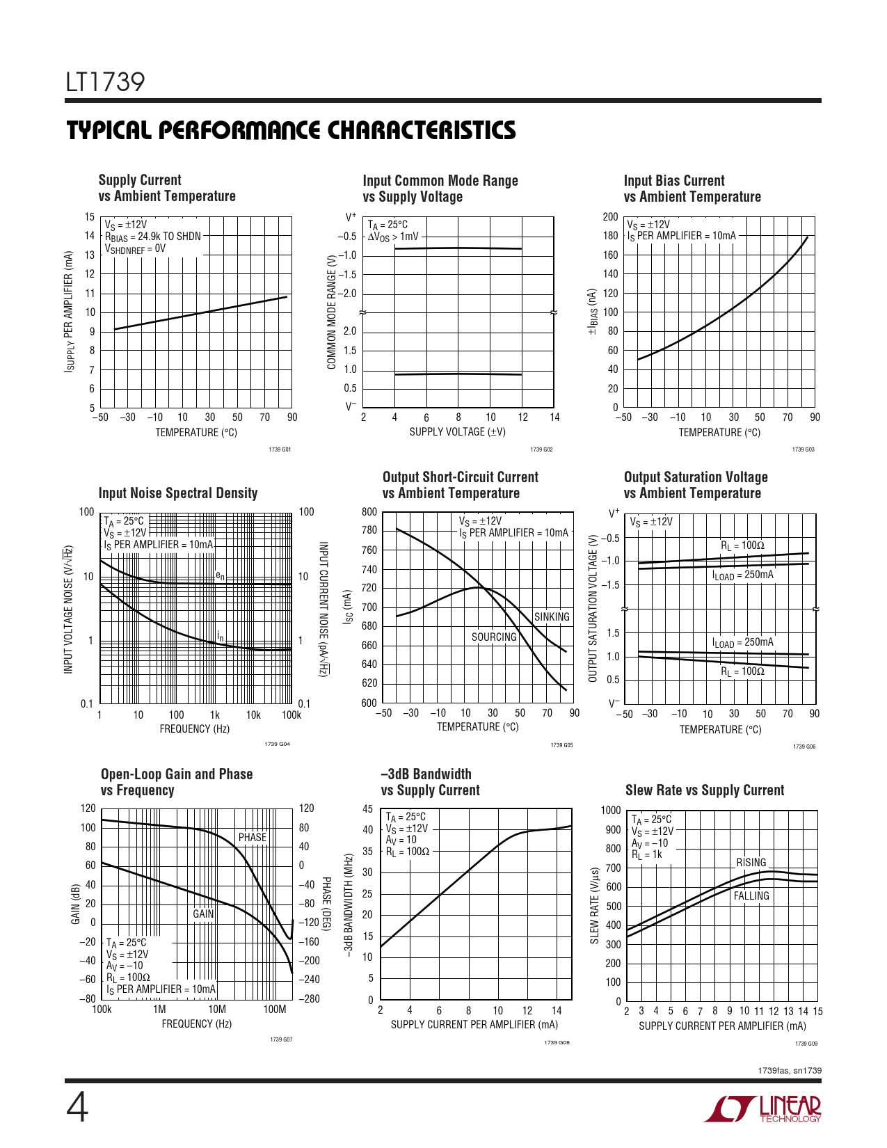 15 V+ 200 V T S = ±12V A = 25°C VS = ±12V 14 R –0.5 BIAS = 24.9k TO SHDN ∆VOS > 1mV 180 IS PER AMPLIFIER = 10mA V 13 SHDNREF = 0V –1.0 160 12 –1.5 140 11 –2.0 120 (nA) 10 100 9 2.0 ±I BIAS 80 PER AMPLIFIER (mA) 8 1.5 60 COMMON MODE RANGE (V) I SUPPLY 7 1.0 40 6 0.5 20 5 V– 0 –50 –30 –10 10 30 50 70 90 2 4 6 8 10 12 14 –50 –30 –10 10 30 50 70 90 TEMPERATURE (°C) SUPPLY VOLTAGE (±V) TEMPERATURE (°C) 1739 G01 1739 G02 1739 G03