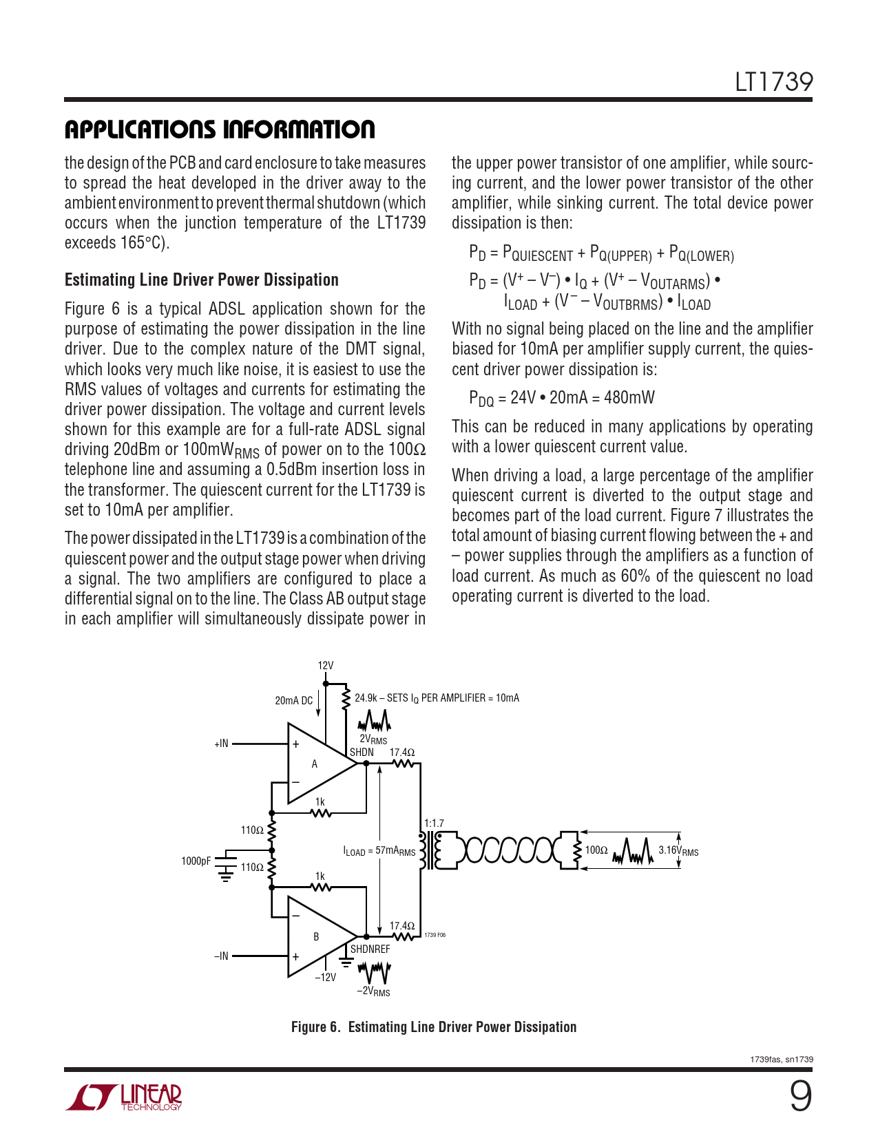 LT1739 UUWUAPPLICATIO S I FOR ATIO the design of the PCB and card enclosure to take measures the upper power transistor of one amplifier, while sourc- to spread the heat developed in the driver away to the ing current, and the lower power transistor of the other ambient environment to prevent thermal shutdown (which amplifier, while sinking current. The total device power occurs when the junction temperature of the LT1739 dissipation is then: exceeds 165°C). PD = PQUIESCENT + PQ(UPPER) + PQ(LOWER) Estimating Line Driver Power Dissipation PD = (V+ – V–) • IQ + (V+ – VOUTARMS) • I Figure 6 is a typical ADSL application shown for the LOAD + (V – – VOUTBRMS) • ILOAD purpose of estimating the power dissipation in the line With no signal being placed on the line and the amplifier driver. Due to the complex nature of the DMT signal, biased for 10mA per amplifier supply current, the quies- which looks very much like noise, it is easiest to use the cent driver power dissipation is: RMS values of voltages and currents for estimating the P driver power dissipation. The voltage and current levels DQ = 24V • 20mA = 480mW shown for this example are for a full-rate ADSL signal This can be reduced in many applications by operating driving 20dBm or 100mW with a lower quiescent current value. RMS of power on to the 100Ω telephone line and assuming a 0.5dBm insertion loss in When driving a load, a large percentage of the amplifier the transformer. The quiescent current for the LT1739 is quiescent current is diverted to the output stage and set to 10mA per amplifier. becomes part of the load current. Figure 7 illustrates the The power dissipated in the LT1739 is a combination of the total amount of biasing current flowing between the + and quiescent power and the output stage power when driving – power supplies through the amplifiers as a function of a signal. The two amplifiers are configured to place a load current. As much as 60% of the quiescent no load differential signal on to the line. The Class AB output stage operating current is diverted to the load. in each amplifier will simultaneously dissipate power in 12V 20mA DC 24.9k – SETS IQ PER AMPLIFIER = 10mA 2V +IN + RMS SHDN 17.4Ω A – 1k 1:1.7 110Ω • • ILOAD = 57mARMS 100Ω 3.16VRMS 1000pF 110Ω 1k – 17.4Ω 1739 F06 B SHDNREF –IN + –12V –2VRMS Figure 6. Estimating Line Driver Power Dissipation 1739fas, sn1739 9