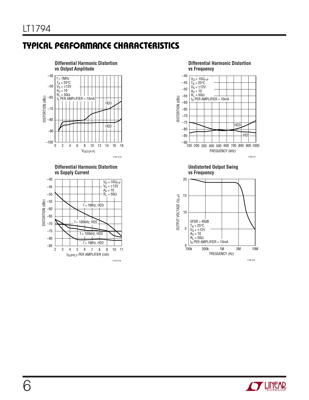 –40 20 VO = 10VP-P –45 VS = ±12V AV = 10 –50 RL = 50Ω ) 15 P-P –55 f = 1MHz, HD3 –60 10 –65 f = 100kHz, HD2 SFDR > 40dB DISTORTION (dBc) –70 TA = 25°C OUTPUT VOLTAGE (V 5 –75 VS = ±12V f = 100kHz, HD3 AV = 10 –80 RL = 50Ω f = 1MHz, HD2 IS PER AMPLIFIER = 10mA –85 0 2 3 4 5 6 7 8 9 10 11 100k 300k 1M 3M 10M I FREQUENCY (Hz) SUPPLY PER AMPLIFIER (mA) 1794 G18 1794 G19 6