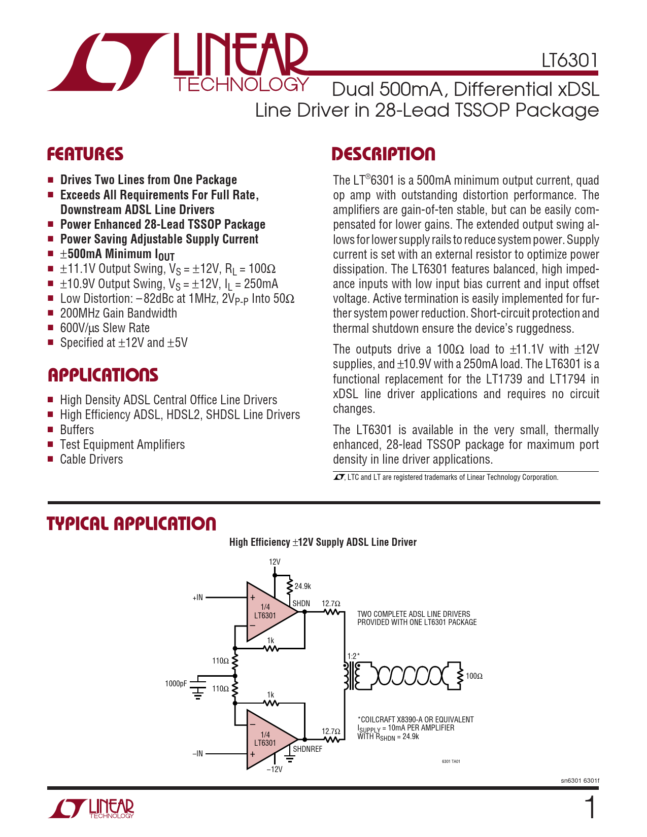 LT6301 Dual 500mA, Differential xDSL Line Driver in 28-Lead TSSOP Package UFEATURESDESCRIPTIO ■ Drives Two Lines from One Package The LT®6301 is a 500mA minimum output current, quad ■ Exceeds All Requirements For Full Rate, op amp with outstanding distortion performance. The Downstream ADSL Line Drivers amplifiers are gain-of-ten stable, but can be easily com- ■ Power Enhanced 28-Lead TSSOP Package pensated for lower gains. The extended output swing al- ■ Power Saving Adjustable Supply Current lows for lower supply rails to reduce system power. Supply ■ ± 500mA Minimum IOUT current is set with an external resistor to optimize power ■ ±11.1V Output Swing, VS = ±12V, RL = 100Ω dissipation. The LT6301 features balanced, high imped- ■ ±10.9V Output Swing, VS = ±12V, IL = 250mA ance inputs with low input bias current and input offset ■ Low Distortion: – 82dBc at 1MHz, 2VP-P Into 50Ω voltage. Active termination is easily implemented for fur- ■ 200MHz Gain Bandwidth ther system power reduction. Short-circuit protection and ■ 600V/µs Slew Rate thermal shutdown ensure the device’s ruggedness. ■ Specified at ±12V and ±5V The outputs drive a 100Ω load to ±11.1V with ±12V U supplies, and ±10.9V with a 250mA load. The LT6301 is a APPLICATIO S functional replacement for the LT1739 and LT1794 in xDSL line driver applications and requires no circuit ■ High Density ADSL Central Office Line Drivers changes. ■ High Efficiency ADSL, HDSL2, SHDSL Line Drivers ■ Buffers The LT6301 is available in the very small, thermally ■ Test Equipment Amplifiers enhanced, 28-lead TSSOP package for maximum port ■ Cable Drivers density in line driver applications. , LTC and LT are registered trademarks of Linear Technology Corporation. UTYPICAL APPLICATIOHigh Efficiency ± 12V Supply ADSL Line Driver 12V 24.9k +IN + SHDN 1/4 12.7Ω LT6301 TWO COMPLETE ADSL LINE DRIVERS – PROVIDED WITH ONE LT6301 PACKAGE 1k 1:2* 110Ω • • 100Ω 1000pF 110Ω 1k – *COILCRAFT X8390-A OR EQUIVALENT ISUPPLY = 10mA PER AMPLIFIER 1/4 12.7Ω WITH RSHDN = 24.9k LT6301 SHDNREF –IN + 6301 TA01 –12V sn6301 6301f 1