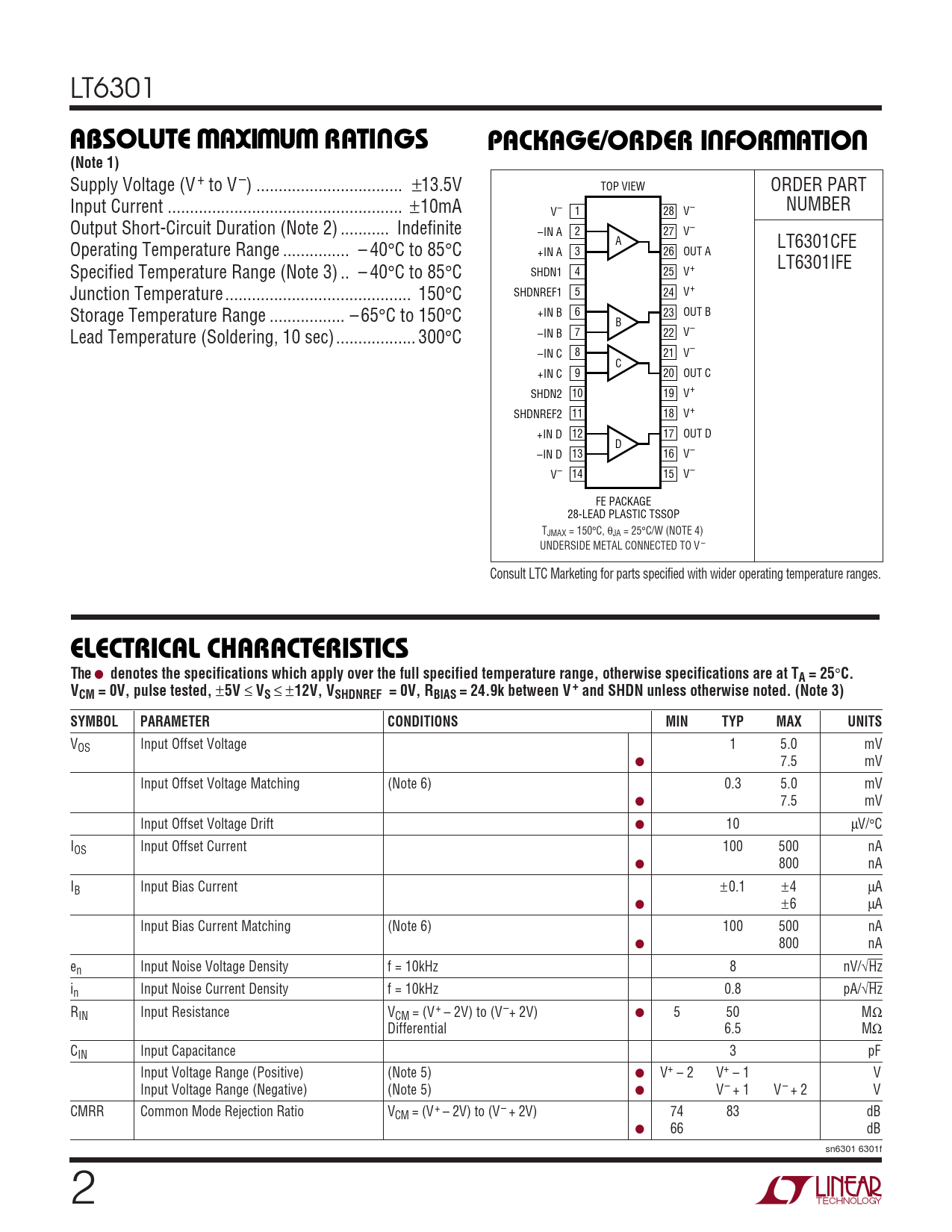 LT6301 WWWUUWUABSOLUTE MAXIMUM RATINGSPACKAGE/ORDER INFORMATION(Note 1) Supply Voltage (V + to V –) ... ±13.5V TOP VIEW ORDER PART Input Current ... ±10mA NUMBER V– 1 28 V– Output Short-Circuit Duration (Note 2) ... Indefinite –IN A 2 27 V– A LT6301CFE Operating Temperature Range ... – 40°C to 85°C +IN A 3 26 OUT A LT6301IFE Specified Temperature Range (Note 3) .. – 40°C to 85°C SHDN1 4 25 V+ Junction Temperature .. 150°C SHDNREF1 5 24 V+ Storage Temperature Range ... – 65°C to 150°C +IN B 6 23 OUT B B Lead Temperature (Soldering, 10 sec).. 300°C –IN B 7 22 V– –IN C 8 21 V– C +IN C 9 20 OUT C SHDN2 10 19 V+ SHDNREF2 11 18 V+ +IN D 12 17 OUT D D –IN D 13 16 V– V– 14 15 V– FE PACKAGE 28-LEAD PLASTIC TSSOP TJMAX = 150°C, θJA = 25°C/W (NOTE 4) UNDERSIDE METAL CONNECTED TO V – Consult LTC Marketing for parts specified with wider operating temperature ranges. ELECTRICAL CHARACTERISTICSThe ● denotes the specifications which apply over the full specified temperature range, otherwise specifications are at TA = 25 ° C.VCM = 0V, pulse tested, ± 5V ≤ VS ≤ ± 12V, VSHDNREF = 0V, RBIAS = 24.9k between V+ and SHDN unless otherwise noted. (Note 3)SYMBOLPARAMETERCONDITIONSMINTYPMAXUNITS VOS Input Offset Voltage 1 5.0 mV ● 7.5 mV Input Offset Voltage Matching (Note 6) 0.3 5.0 mV ● 7.5 mV Input Offset Voltage Drift ● 10 µV/°C IOS Input Offset Current 100 500 nA ● 800 nA IB Input Bias Current ±0.1 ±4 µA ● ±6 µA Input Bias Current Matching (Note 6) 100 500 nA ● 800 nA en Input Noise Voltage Density f = 10kHz 8 nV/√Hz in Input Noise Current Density f = 10kHz 0.8 pA/√Hz RIN Input Resistance VCM = (V+ – 2V) to (V–+ 2V) ● 5 50 MΩ Differential 6.5 MΩ CIN Input Capacitance 3 pF Input Voltage Range (Positive) (Note 5) ● V+ – 2 V+ – 1 V Input Voltage Range (Negative) (Note 5) ● V– + 1 V– + 2 V CMRR Common Mode Rejection Ratio VCM = (V+ – 2V) to (V– + 2V) 74 83 dB ● 66 dB sn6301 6301f 2
