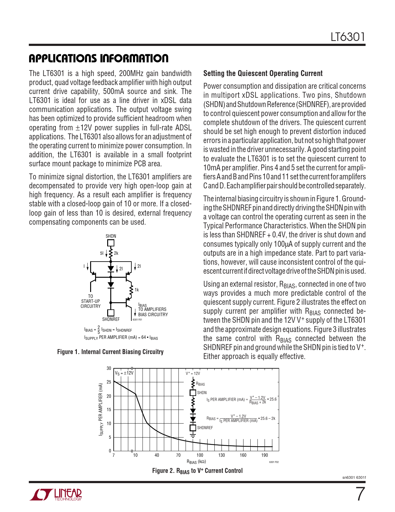 LT6301 UUWUAPPLICATIO S I FOR ATIO The LT6301 is a high speed, 200MHz gain bandwidth Setting the Quiescent Operating Current product, quad voltage feedback amplifier with high output Power consumption and dissipation are critical concerns current drive capability, 500mA source and sink. The in multiport xDSL applications. Two pins, Shutdown LT6301 is ideal for use as a line driver in xDSL data (SHDN) and Shutdown Reference (SHDNREF), are provided communication applications. The output voltage swing to control quiescent power consumption and allow for the has been optimized to provide sufficient headroom when complete shutdown of the drivers. The quiescent current operating from ±12V power supplies in full-rate ADSL should be set high enough to prevent distortion induced applications. The LT6301 also allows for an adjustment of errors in a particular application, but not so high that power the operating current to minimize power consumption. In is wasted in the driver unnecessarily. A good starting point addition, the LT6301 is available in a small footprint to evaluate the LT6301 is to set the quiescent current to surface mount package to minimize PCB area. 10mA per amplifier. Pins 4 and 5 set the current for ampli- To minimize signal distortion, the LT6301 amplifiers are fiers A and B and Pins 10 and 11 set the current for amplifers decompensated to provide very high open-loop gain at C and D. Each amplifier pair should be controlled separately. high frequency. As a result each amplifier is frequency The internal biasing circuitry is shown in Figure 1. Ground- stable with a closed-loop gain of 10 or more. If a closed- ing the SHDNREF pin and directly driving the SHDN pin with loop gain of less than 10 is desired, external frequency a voltage can control the operating current as seen in the compensating components can be used. Typical Performance Characteristics. When the SHDN pin SHDN is less than SHDNREF + 0.4V, the driver is shut down and consumes typically only 100µA of supply current and the 5I 2k outputs are in a high impedance state. Part to part varia- tions, however, will cause inconsistent control of the qui- I 2I 2I escent current if direct voltage drive of the SHDN pin is used. Using an external resistor, RBIAS, connected in one of two 1k ways provides a much more predictable control of the TO START-UP I quiescent supply current. Figure 2 illustrates the effect on CIRCUITRY BIAS TO AMPLIFIERS supply current per amplifier with R BIAS CIRCUITRY BIAS connected be- SHDNREF 6301 F01 tween the SHDN pin and the 12V V+ supply of the LT6301 2 IBIAS = ISHDN = ISHDNREF and the approximate design equations. Figure 3 illustrates 5 ISUPPLY PER AMPLIFIER (mA) = 64 • IBIAS the same control with RBIAS connected between the SHDNREF pin and ground while the SHDN pin is tied to V+. Figure 1. Internal Current Biasing Circuitry Either approach is equally effective. 30 VS = ±12V V+ = 12V 25 RBIAS SHDN 20 V+ – 1.2V IS PER AMPLIFIER (mA) ≈ • 25.6 RBIAS + 2k 15 R V+ – 1.2V PER AMPLIFIER (mA) BIAS = • 25.6 – 2k I 10 S PER AMPLIFIER (mA) SHDNREF I SUPPLY 5 0 7 10 40 70 100 130 160 190 RBIAS (kΩ) 6301 F02 Figure 2. RBIAS to V+ Current Control sn6301 6301f 7