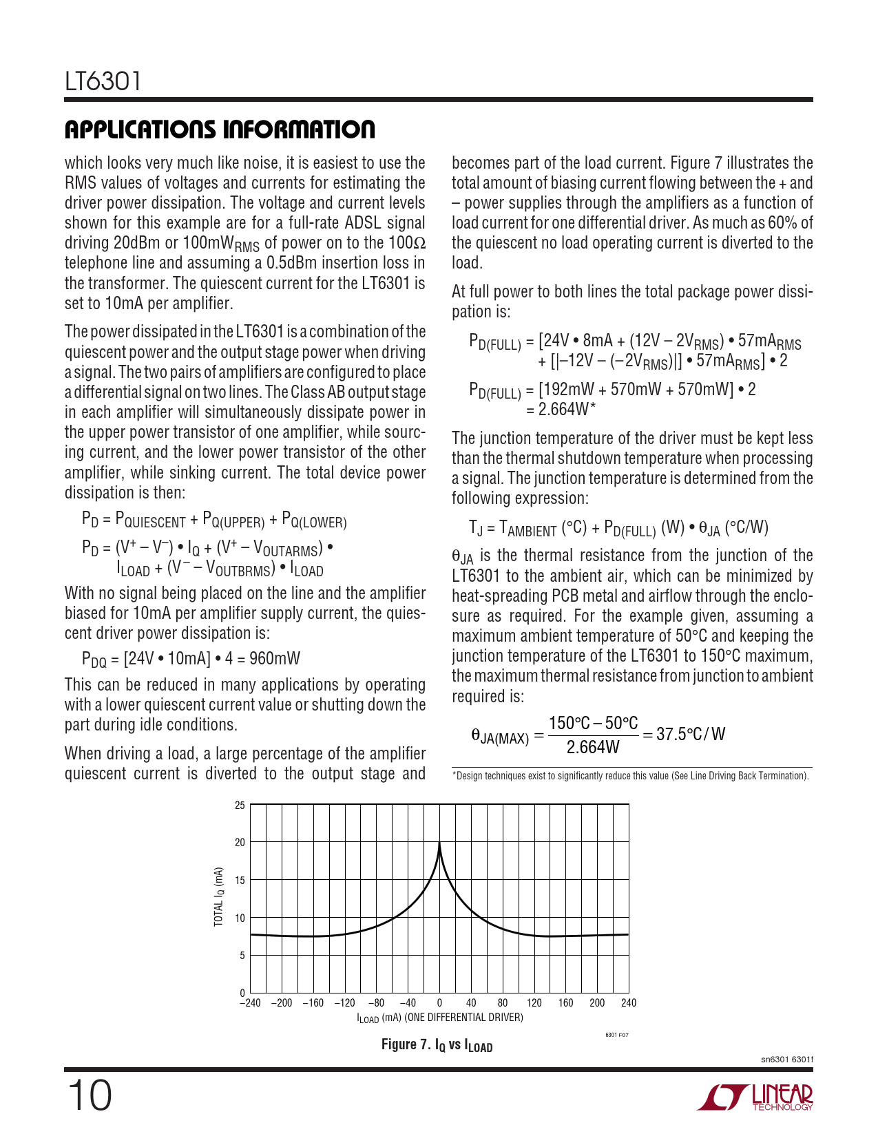 LT6301 UUWUAPPLICATIO S I FOR ATIO which looks very much like noise, it is easiest to use the becomes part of the load current. Figure 7 illustrates the RMS values of voltages and currents for estimating the total amount of biasing current flowing between the + and driver power dissipation. The voltage and current levels – power supplies through the amplifiers as a function of shown for this example are for a full-rate ADSL signal load current for one differential driver. As much as 60% of driving 20dBm or 100mWRMS of power on to the 100Ω the quiescent no load operating current is diverted to the telephone line and assuming a 0.5dBm insertion loss in load. the transformer. The quiescent current for the LT6301 is At full power to both lines the total package power dissi- set to 10mA per amplifier. pation is: The power dissipated in the LT6301 is a combination of the P quiescent power and the output stage power when driving D(FULL) = [24V • 8mA + (12V – 2VRMS) • 57mARMS + [|–12V – (– 2V a signal. The two pairs of amplifiers are configured to place RMS)|] • 57mARMS] • 2 a differential signal on two lines. The Class AB output stage PD(FULL) = [192mW + 570mW + 570mW] • 2 in each amplifier will simultaneously dissipate power in = 2.664W* the upper power transistor of one amplifier, while sourc- The junction temperature of the driver must be kept less ing current, and the lower power transistor of the other than the thermal shutdown temperature when processing amplifier, while sinking current. The total device power a signal. The junction temperature is determined from the dissipation is then: following expression: PD = PQUIESCENT + PQ(UPPER) + PQ(LOWER) TJ = TAMBIENT (°C) + PD(FULL) (W) • θJA (°C/W) PD = (V+ – V–) • IQ + (V+ – VOUTARMS) • θ I JA is the thermal resistance from the junction of the LOAD + (V – – VOUTBRMS) • ILOAD LT6301 to the ambient air, which can be minimized by With no signal being placed on the line and the amplifier heat-spreading PCB metal and airflow through the enclo- biased for 10mA per amplifier supply current, the quies- sure as required. For the example given, assuming a cent driver power dissipation is: maximum ambient temperature of 50°C and keeping the P junction temperature of the LT6301 to 150°C maximum, DQ = [24V • 10mA] • 4 = 960mW the maximum thermal resistance from junction to ambient This can be reduced in many applications by operating required is: with a lower quiescent current value or shutting down the part during idle conditions. θ 150 C – 50 C JA MAX = ° ° = . 37 5 C ° / W ( ) When driving a load, a large percentage of the amplifier . 2 W 664 quiescent current is diverted to the output stage and *Design techniques exist to significantly reduce this value (See Line Driving Back Termination). 25 20 15 (mA) Q 10 TOTAL I 5 0 –240 –200 –160 –120 –80 –40 0 40 80 120 160 200 240 ILOAD (mA) (ONE DIFFERENTIAL DRIVER) 6301 F07 Figure 7. IQ vs ILOAD sn6301 6301f 10