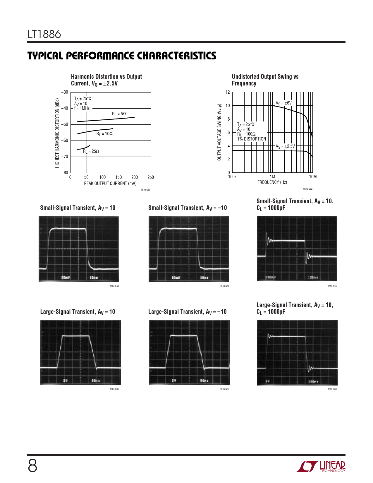 –30 12 TA = 25°C AV = 10 ) V 10 S = ±6V –40 f = 1MHz P-P RL = 5Ω 8 –50 TA = 25°C AV = 10 R 6 L = 10Ω RL = 100Ω –60 1% DISTORTION 4 VS = ±2.5V RL = 25Ω –70 OUTPUT VOLTAGE SWING (V 2 HIGHEST HARMONIC DISTORTION (dBc) –80 0 0 50 100 150 200 250 100k 1M 10M PEAK OUTPUT CURRENT (mA) FREQUENCY (Hz) 1886 G30 1886 G32
