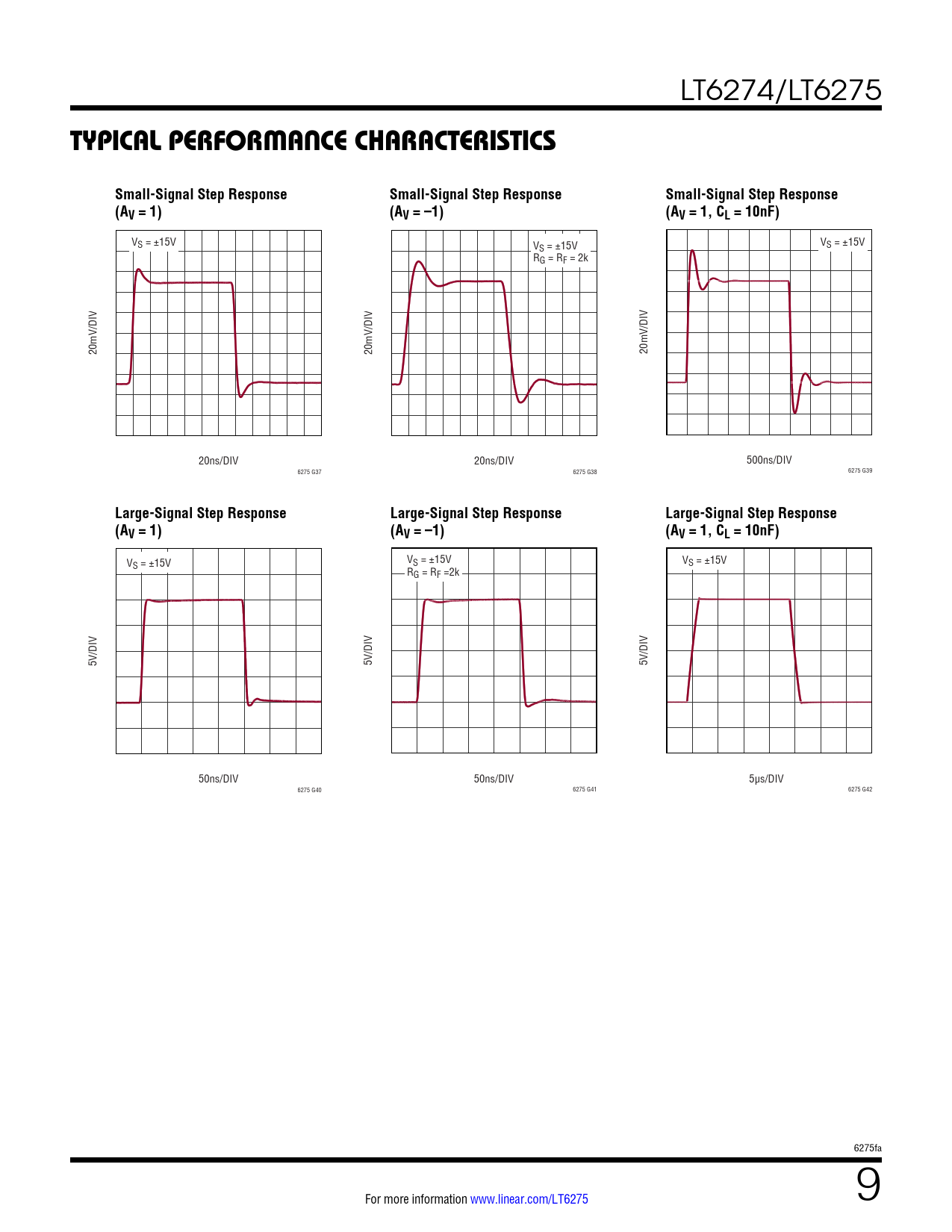 VS = ±15V V V S = ±15V S = ±15V RG = RF = 2k /DIV /DIV /DIV 20mV 20mV 20mV 20ns/DIV 20ns/DIV 500ns/DIV 6275 G37 6275 G38 6275 G39