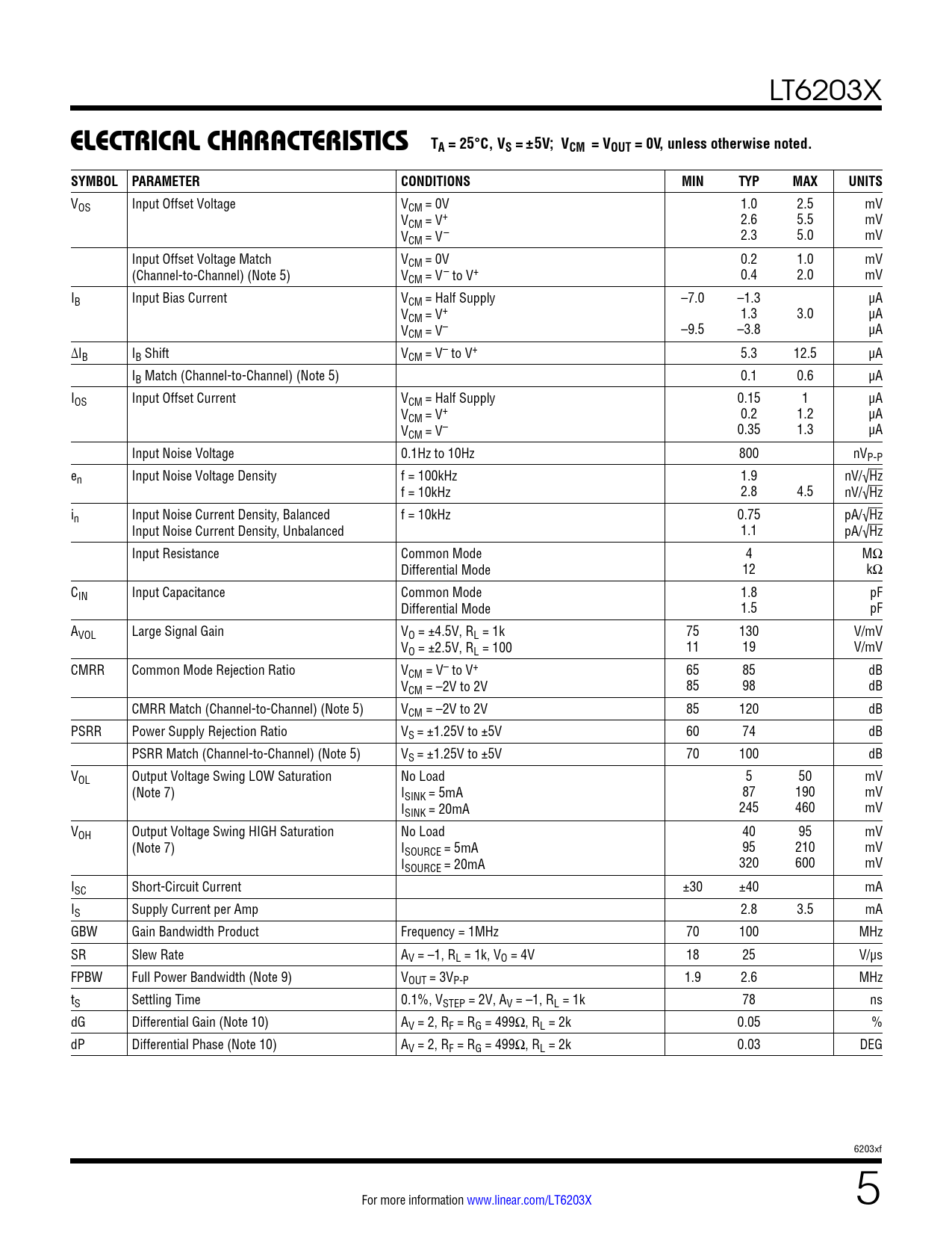 VOS Input Offset Voltage VCM = 0V 1.0 2.5 mV VCM = V+ 2.6 5.5 mV VCM = V– 2.3 5.0 mV Input Offset Voltage Match VCM = 0V 0.2 1.0 mV (Channel-to-Channel) (Note 5) VCM = V– to V+ 0.4 2.0 mV IB Input Bias Current VCM = Half Supply –7.0 –1.3 µA VCM = V+ 1.3 3.0 µA VCM = V– –9.5 –3.8 µA ∆IB IB Shift VCM = V– to V+ 5.3 12.5 µA IB Match (Channel-to-Channel) (Note 5) 0.1 0.6 µA IOS Input Offset Current VCM = Half Supply 0.15 1 µA VCM = V+ 0.2 1.2 µA VCM = V– 0.35 1.3 µA Input Noise Voltage 0.1Hz to 10Hz 800 nVP-P en Input Noise Voltage Density f = 100kHz 1.9 nV/√Hz f = 10kHz 2.8 4.5 nV/√Hz in Input Noise Current Density, Balanced f = 10kHz 0.75 pA/√Hz Input Noise Current Density, Unbalanced 1.1 pA/√Hz Input Resistance Common Mode 4 MΩ Differential Mode 12 kΩ CIN Input Capacitance Common Mode 1.8 pF Differential Mode 1.5 pF AVOL Large Signal Gain VO = ±4.5V, RL = 1k 75 130 V/mV VO = ±2.5V, RL = 100 11 19 V/mV CMRR Common Mode Rejection Ratio VCM = V – to V+ 65 85 dB VCM = –2V to 2V 85 98 dB CMRR Match (Channel-to-Channel) (Note 5) VCM = –2V to 2V 85 120 dB PSRR Power Supply Rejection Ratio VS = ±1.25V to ±5V 60 74 dB PSRR Match (Channel-to-Channel) (Note 5) VS = ±1.25V to ±5V 70 100 dB VOL Output Voltage Swing LOW Saturation No Load 5 50 mV (Note 7) ISINK = 5mA 87 190 mV ISINK = 20mA 245 460 mV VOH Output Voltage Swing HIGH Saturation No Load 40 95 mV (Note 7) ISOURCE = 5mA 95 210 mV ISOURCE = 20mA 320 600 mV ISC Short-Circuit Current ±30 ±40 mA IS Supply Current per Amp 2.8 3.5 mA GBW Gain Bandwidth Product Frequency = 1MHz 70 100 MHz SR Slew Rate AV = –1, RL = 1k, VO = 4V 18 25 V/µs FPBW Full Power Bandwidth (Note 9) VOUT = 3VP-P 1.9 2.6 MHz tS Settling Time 0.1%, VSTEP = 2V, AV = –1, RL = 1k 78 ns dG Differential Gain (Note 10) AV = 2, RF = RG = 499Ω, RL = 2k 0.05 % dP Differential Phase (Note 10) AV = 2, RF = RG = 499Ω, RL = 2k 0.03 DEG 6203xf For more information www.linear.com/LT6203X 5 Document Outline Features Applications Description Typical Application Absolute Maximum Ratings Electrical Characteristics Typical Performance Characteristics Applications Information Typical Application Related Parts Features Applications Typical Application Description Absolute Maximum Ratings Order Information Pin Configuration Electrical Characteristics Typical Performance Characteristics Applications Information Package Description Typical Application Related Parts
