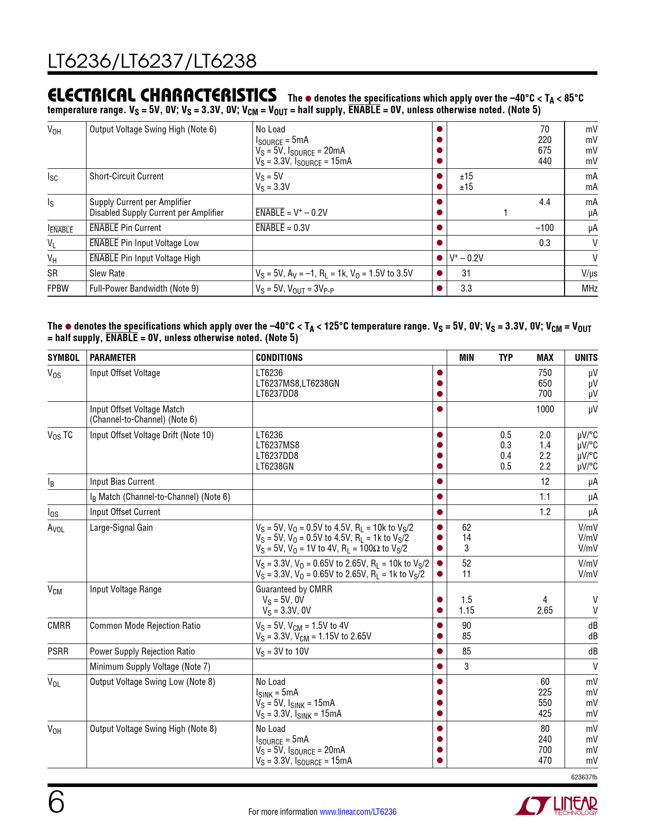 VOS Input Offset Voltage LT6236 l 750 µV LT6237MS8,LT6238GN l 650 µV LT6237DD8 l 700 µV Input Offset Voltage Match l 1000 µV (Channel-to-Channel) (Note 6) VOS TC Input Offset Voltage Drift (Note 10) LT6236 l 0.5 2.0 µV/°C LT6237MS8 l 0.3 1.4 µV/°C LT6237DD8 l 0.4 2.2 µV/°C LT6238GN l 0.5 2.2 µV/°C IB Input Bias Current l 12 µA IB Match (Channel-to-Channel) (Note 6) l 1.1 µA IOS Input Offset Current l 1.2 µA AVOL Large-Signal Gain VS = 5V, VO = 0.5V to 4.5V, RL = 10k to VS/2 l 62 V/mV VS = 5V, VO = 0.5V to 4.5V, RL = 1k to VS/2 l 14 V/mV VS = 5V, VO = 1V to 4V, RL = 100Ω to VS/2 l 3 V/mV VS = 3.3V, VO = 0.65V to 2.65V, RL = 10k to VS/2 l 52 V/mV VS = 3.3V, VO = 0.65V to 2.65V, RL = 1k to VS/2 l 11 V/mV VCM Input Voltage Range Guaranteed by CMRR VS = 5V, 0V l 1.5 4 V VS = 3.3V, 0V l 1.15 2.65 V CMRR Common Mode Rejection Ratio VS = 5V, VCM = 1.5V to 4V l 90 dB VS = 3.3V, VCM = 1.15V to 2.65V l 85 dB PSRR Power Supply Rejection Ratio VS = 3V to 10V l 85 dB Minimum Supply Voltage (Note 7) l 3 V VOL Output Voltage Swing Low (Note 8) No Load l 60 mV ISINK = 5mA l 225 mV VS = 5V, ISINK = 15mA l 550 mV VS = 3.3V, ISINK = 15mA l 425 mV VOH Output Voltage Swing High (Note 8) No Load l 80 mV ISOURCE = 5mA l 240 mV VS = 5V, ISOURCE = 20mA l 700 mV VS = 3.3V, ISOURCE = 15mA l 470 mV 623637fb 6 For more information www.linear.com/LT6236