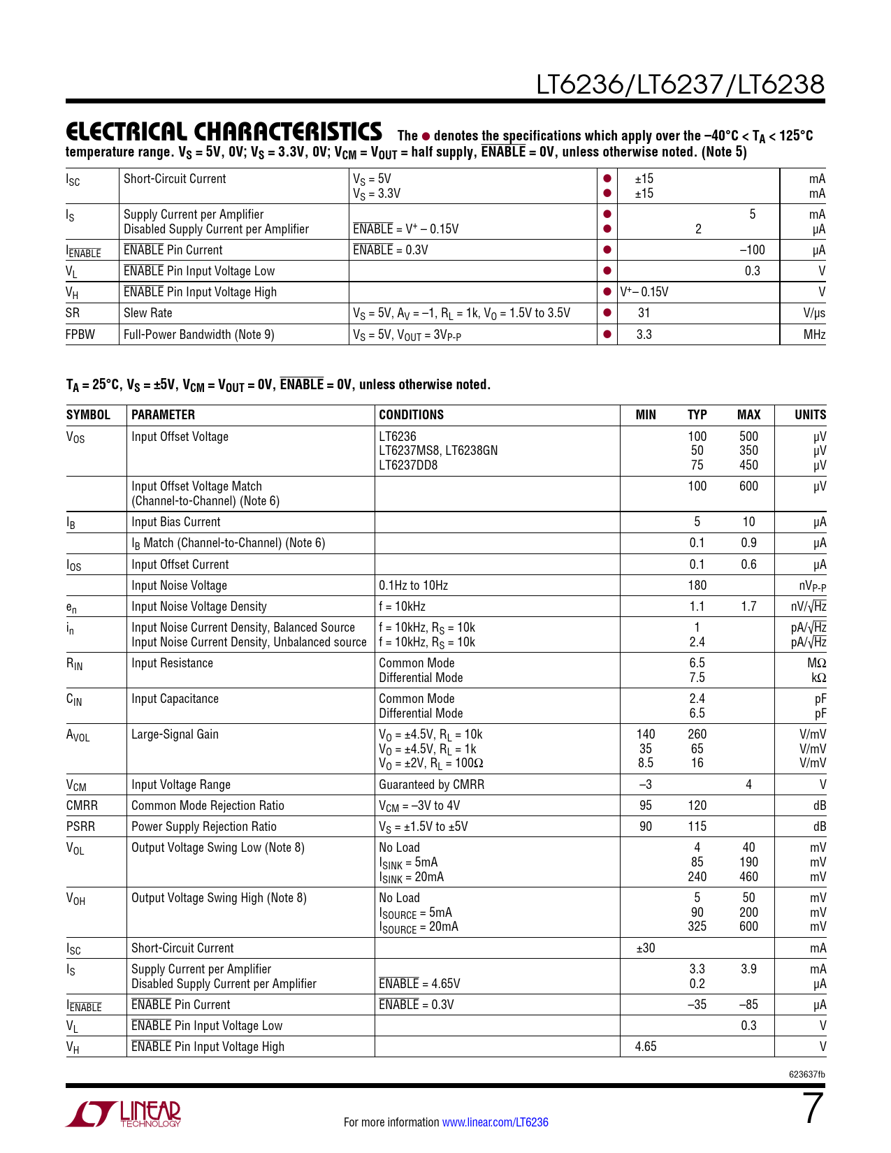 VOS Input Offset Voltage LT6236 100 500 µV LT6237MS8, LT6238GN 50 350 µV LT6237DD8 75 450 µV Input Offset Voltage Match 100 600 µV (Channel-to-Channel) (Note 6) IB Input Bias Current 5 10 µA IB Match (Channel-to-Channel) (Note 6) 0.1 0.9 µA IOS Input Offset Current 0.1 0.6 µA Input Noise Voltage 0.1Hz to 10Hz 180 nVP-P en Input Noise Voltage Density f = 10kHz 1.1 1.7 nV/√Hz in Input Noise Current Density, Balanced Source f = 10kHz, RS = 10k 1 pA/√Hz Input Noise Current Density, Unbalanced source f = 10kHz, RS = 10k 2.4 pA/√Hz RIN Input Resistance Common Mode 6.5 MΩ Differential Mode 7.5 kΩ CIN Input Capacitance Common Mode 2.4 pF Differential Mode 6.5 pF AVOL Large-Signal Gain VO = ±4.5V, RL = 10k 140 260 V/mV VO = ±4.5V, RL = 1k 35 65 V/mV VO = ±2V, RL = 100Ω 8.5 16 V/mV VCM Input Voltage Range Guaranteed by CMRR –3 4 V CMRR Common Mode Rejection Ratio VCM = –3V to 4V 95 120 dB PSRR Power Supply Rejection Ratio VS = ±1.5V to ±5V 90 115 dB VOL Output Voltage Swing Low (Note 8) No Load 4 40 mV ISINK = 5mA 85 190 mV ISINK = 20mA 240 460 mV VOH Output Voltage Swing High (Note 8) No Load 5 50 mV ISOURCE = 5mA 90 200 mV ISOURCE = 20mA 325 600 mV ISC Short-Circuit Current ±30 mA IS Supply Current per Amplifier 3.3 3.9 mA Disabled Supply Current per Amplifier ENABLE = 4.65V 0.2 µA IENABLE ENABLE Pin Current ENABLE = 0.3V –35 –85 µA VL ENABLE Pin Input Voltage Low 0.3 V VH ENABLE Pin Input Voltage High 4.65 V 623637fb For more information www.linear.com/LT6236 7