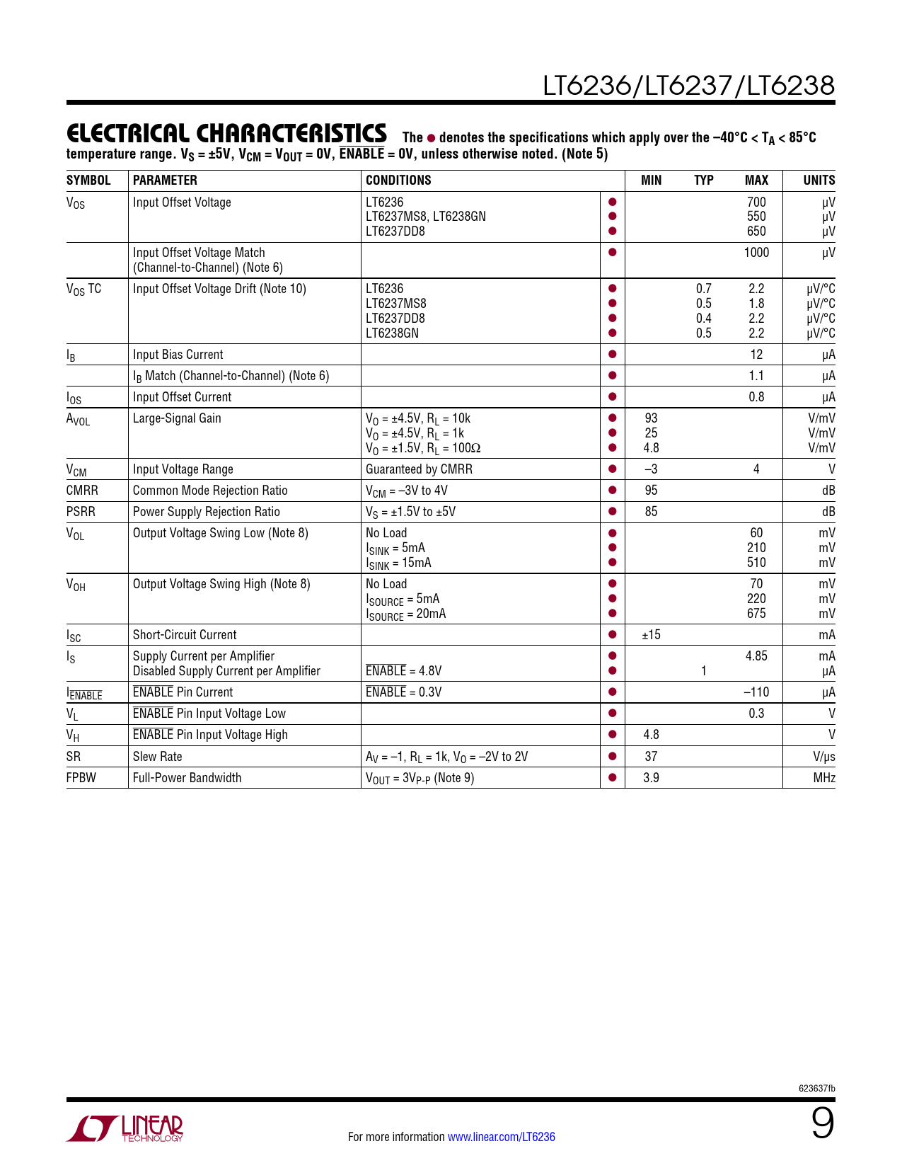 VOS Input Offset Voltage LT6236 l 700 µV LT6237MS8, LT6238GN l 550 µV LT6237DD8 l 650 µV Input Offset Voltage Match l 1000 µV (Channel-to-Channel) (Note 6) VOS TC Input Offset Voltage Drift (Note 10) LT6236 l 0.7 2.2 µV/°C LT6237MS8 l 0.5 1.8 µV/°C LT6237DD8 l 0.4 2.2 µV/°C LT6238GN l 0.5 2.2 µV/°C IB Input Bias Current l 12 µA IB Match (Channel-to-Channel) (Note 6) l 1.1 µA IOS Input Offset Current l 0.8 µA AVOL Large-Signal Gain VO = ±4.5V, RL = 10k l 93 V/mV VO = ±4.5V, RL = 1k l 25 V/mV VO = ±1.5V, RL = 100Ω l 4.8 V/mV VCM Input Voltage Range Guaranteed by CMRR l –3 4 V CMRR Common Mode Rejection Ratio VCM = –3V to 4V l 95 dB PSRR Power Supply Rejection Ratio VS = ±1.5V to ±5V l 85 dB VOL Output Voltage Swing Low (Note 8) No Load l 60 mV ISINK = 5mA l 210 mV ISINK = 15mA l 510 mV VOH Output Voltage Swing High (Note 8) No Load l 70 mV ISOURCE = 5mA l 220 mV ISOURCE = 20mA l 675 mV ISC Short-Circuit Current l ±15 mA IS Supply Current per Amplifier l 4.85 mA Disabled Supply Current per Amplifier ENABLE = 4.8V l 1 µA IENABLE ENABLE Pin Current ENABLE = 0.3V l –110 µA VL ENABLE Pin Input Voltage Low l 0.3 V VH ENABLE Pin Input Voltage High l 4.8 V SR Slew Rate AV = –1, RL = 1k, VO = –2V to 2V l 37 V/µs FPBW Full-Power Bandwidth VOUT = 3VP-P (Note 9) l 3.9 MHz 623637fb For more information www.linear.com/LT6236 9