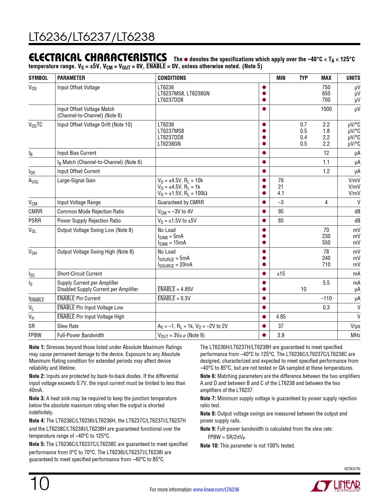 LT6236/LT6237/LT6238 e lecTrical characTerisTics The l denotes the specifications which apply over the –40°C < TA < 125°Ctemperature range. VS = ±5V, VCM = VOUT = 0V, ENABLE = 0V, unless otherwise noted. (Note 5) SYMBOLPARAMETERCONDITIONSMINTYPMAXUNITS VOS Input Offset Voltage LT6236 l 750 µV LT6237MS8, LT6238GN l 650 µV LT6237DD8 l 700 µV Input Offset Voltage Match l 1000 µV (Channel-to-Channel) (Note 6) VOSTC Input Offset Voltage Drift (Note 10) LT6236 l 0.7 2.2 µV/°C LT6237MS8 l 0.5 1.8 µV/°C LT6237DD8 l 0.4 2.2 µV/°C LT6238GN l 0.5 2.2 µV/°C IB Input Bias Current l 12 µA IB Match (Channel-to-Channel) (Note 6) l 1.1 µA IOS Input Offset Current l 1.2 µA AVOL Large-Signal Gain VO = ±4.5V, RL = 10k l 76 V/mV VO = ±4.5V, RL = 1k l 21 V/mV VO = ±1.5V, RL = 100Ω l 4.1 V/mV VCM Input Voltage Range Guaranteed by CMRR l –3 4 V CMRR Common Mode Rejection Ratio VCM = –3V to 4V l 95 dB PSRR Power Supply Rejection Ratio VS = ±1.5V to ±5V l 85 dB VOL Output Voltage Swing Low (Note 8) No Load l 70 mV ISINK = 5mA l 230 mV ISINK = 15mA l 550 mV VOH Output Voltage Swing High (Note 8) No Load l 78 mV ISOURCE = 5mA l 240 mV ISOURCE = 20mA l 710 mV ISC Short-Circuit Current l ±15 mA IS Supply Current per Amplifier l 5.5 mA Disabled Supply Current per Amplifier ENABLE = 4.85V l 10 µA IENABLE ENABLE Pin Current ENABLE = 0.3V l –110 µA VL ENABLE Pin Input Voltage Low l 0.3 V VH ENABLE Pin Input Voltage High l 4.85 V SR Slew Rate AV = –1, RL = 1k, VO = –2V to 2V l 37 V/µs FPBW Full-Power Bandwidth VOUT = 3VP-P (Note 9) l 3.9 MHz Note 1: Stresses beyond those listed under Absolute Maximum Ratings The LT6236H/LT6237H/LT6238H are guaranteed to meet specified may cause permanent damage to the device. Exposure to any Absolute performance from –40°C to 125°C. The LT6236C/LT6237C/LT6238C are Maximum Rating condition for extended periods may affect device designed, characterized and expected to meet specified performance from reliability and lifetime. –40°C to 85°C, but are not tested or QA sampled at these temperatures. Note 2: Inputs are protected by back-to-back diodes. If the differential Note 6: Matching parameters are the difference between the two amplifiers input voltage exceeds 0.7V, the input current must be limited to less than A and D and between B and C of the LT6238 and between the two 40mA. amplifiers of the LT6237. Note 3: A heat sink may be required to keep the junction temperature Note 7: Minimum supply voltage is guaranteed by power supply rejection below the absolute maximum rating when the output is shorted ratio test. indefinitely. Note 8: Output voltage swings are measured between the output and Note 4: The LT6236C/LT6236I/LT6236H, the LT6237C/LT6237I/LT6237H power supply rails. and the LT6238C/LT6238I/LT6238H are guaranteed functional over the Note 9: Full-power bandwidth is calculated from the slew rate: temperature range of –40°C to 125°C. FPBW = SR/2πVP Note 5: The LT6236C/LT6237C/LT6238C are guaranteed to meet specified Note 10: This parameter is not 100% tested. performance from 0°C to 70°C. The LT6236I/LT6237I/LT6238I are guaranteed to meet specified performance from –40°C to 85°C. 623637fb 10 For more information www.linear.com/LT6236