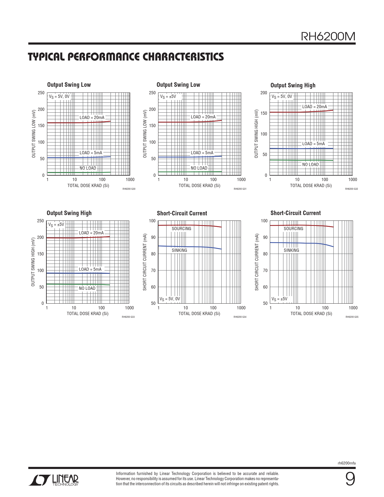 RH6200M TYPICAL PERFORMANCE CHARACTERISTICSOutput Swing LowOutput Swing LowOutput Swing High 250 250 200 V V V S = 5V, 0V S = ±5V S = 5V, 0V LOAD = 20mA 200 200 150 LOAD = 20mA LOAD = 20mA 150 150 100 100 100 LOAD = 5mA LOAD = 5mA LOAD = 5mA 50 OUTPUT SWING LOW (mV) OUTPUT SWING LOW (mV) OUTPUT SWING HIGH (mV) 50 50 NO LOAD NO LOAD NO LOAD 0 0 0 1 10 100 1000 1 10 100 1000 1 10 100 1000 TOTAL DOSE KRAD (Si) TOTAL DOSE KRAD (Si) TOTAL DOSE KRAD (Si) RH6200 G30 RH6200 G31 RH6200 G32 Output Swing HighShort-Circuit CurrentShort-Circuit Current 250 100 100 VS = ±5V SOURCING SOURCING LOAD = 20mA 200 90 90 SINKING SINKING 150 80 80 100 LOAD = 5mA 70 70 OUTPUT SWING HIGH (mV) 50 NO LOAD 60 60 SHORT CIRCUIT CURRENT (mA) SHORT CIRCUIT CURRENT (mA) VS = 5V, 0V VS = ±5V 0 50 50 1 10 100 1000 1 10 100 1000 1 10 100 1000 TOTAL DOSE KRAD (Si) TOTAL DOSE KRAD (Si) TOTAL DOSE KRAD (Si) RH6200 G33 RH6200 G34 RH6200 G35 rh6200mfa Information furnished by Linear Technology Corporation is believed to be accurate and reliable. However, no responsibility is assumed for its use. Linear Technology Corporation makes no representa- tion that the interconnection of its circuits as described herein will not infringe on existing patent rights. 9