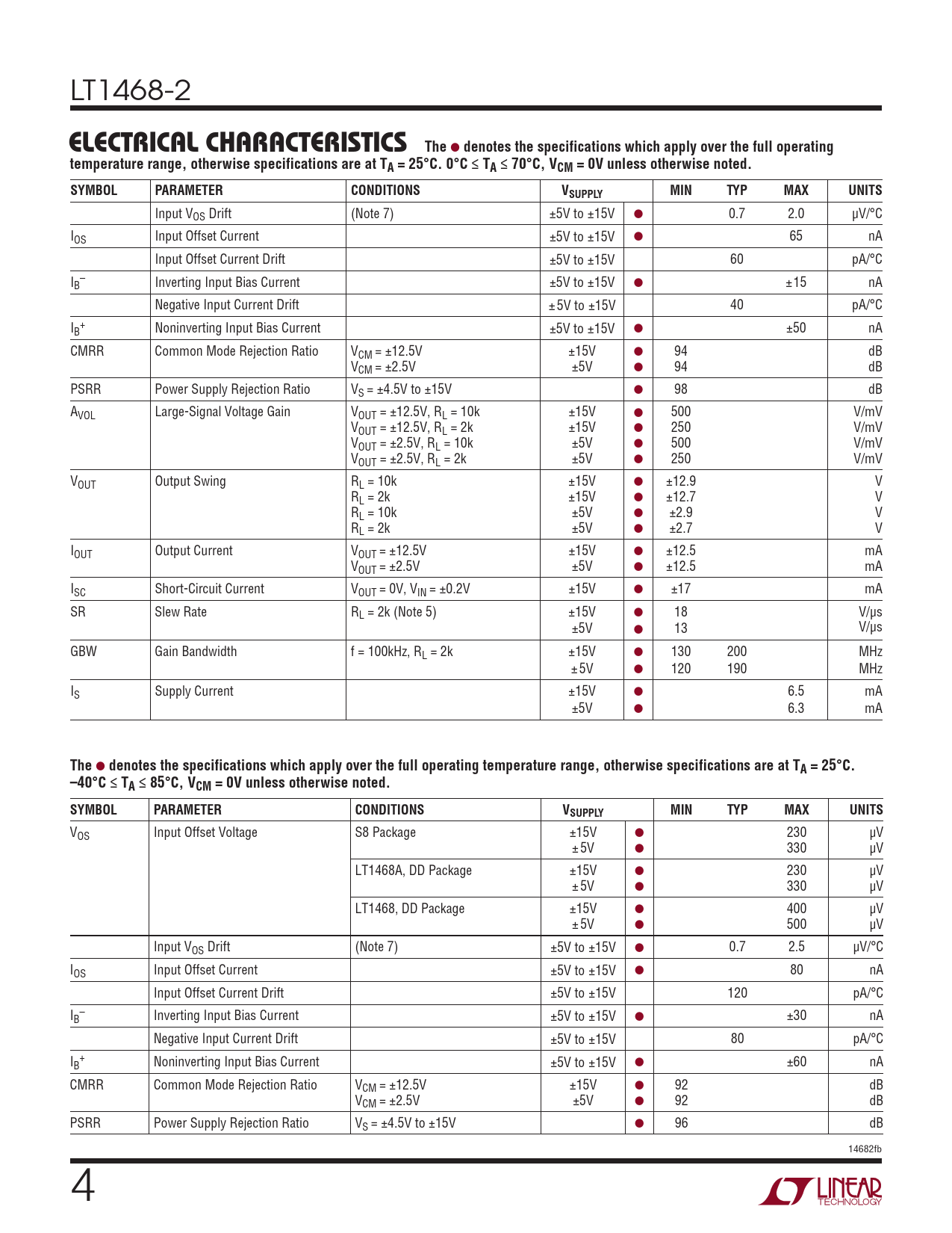 LT1468-2 e lecTrical characTerisTics The l denotes the specifications which apply over the full operatingtemperature range, otherwise specifications are at TA = 25°C. 0°C ≤ TA ≤ 70°C, VCM = 0V unless otherwise noted. SYMBOLPARAMETERCONDITIONSVSUPPLYMINTYPMAXUNITS Input VOS Drift (Note 7) ±5V to ±15V ● 0.7 2.0 µV/°C IOS Input Offset Current ±5V to ±15V ● 65 nA Input Offset Current Drift ±5V to ±15V 60 pA/°C I – B Inverting Input Bias Current ±5V to ±15V ● ±15 nA Negative Input Current Drift ±5V to ±15V 40 pA/°C I + B Noninverting Input Bias Current ±5V to ±15V ● ±50 nA CMRR Common Mode Rejection Ratio VCM = ±12.5V ±15V ● 94 dB VCM = ±2.5V ±5V ● 94 dB PSRR Power Supply Rejection Ratio VS = ±4.5V to ±15V ● 98 dB AVOL Large-Signal Voltage Gain VOUT = ±12.5V, RL = 10k ±15V ● 500 V/mV VOUT = ±12.5V, RL = 2k ±15V ● 250 V/mV VOUT = ±2.5V, RL = 10k ±5V ● 500 V/mV VOUT = ±2.5V, RL = 2k ±5V ● 250 V/mV VOUT Output Swing RL = 10k ±15V ● ±12.9 V RL = 2k ±15V ● ±12.7 V RL = 10k ±5V ● ±2.9 V RL = 2k ±5V ● ±2.7 V IOUT Output Current VOUT = ±12.5V ±15V ● ±12.5 mA VOUT = ±2.5V ±5V ● ±12.5 mA ISC Short-Circuit Current VOUT = 0V, VIN = ±0.2V ±15V ● ±17 mA SR Slew Rate RL = 2k (Note 5) ±15V ● 18 V/µs ±5V ● 13 V/µs GBW Gain Bandwidth f = 100kHz, RL = 2k ±15V ● 130 200 MHz ±5V ● 120 190 MHz IS Supply Current ±15V ● 6.5 mA ±5V ● 6.3 mA The l denotes the specifications which apply over the full operating temperature range, otherwise specifications are at TA = 25°C.–40°C ≤ TA ≤ 85°C, VCM = 0V unless otherwise noted. SYMBOLPARAMETERCONDITIONSVSUPPLYMINTYPMAXUNITS VOS Input Offset Voltage S8 Package ±15V ● 230 µV ±5V ● 330 µV LT1468A, DD Package ±15V ● 230 µV ±5V ● 330 µV LT1468, DD Package ±15V ● 400 µV ±5V ● 500 µV Input VOS Drift (Note 7) ±5V to ±15V ● 0.7 2.5 µV/°C IOS Input Offset Current ±5V to ±15V ● 80 nA Input Offset Current Drift ±5V to ±15V 120 pA/°C I – B Inverting Input Bias Current ±5V to ±15V ● ±30 nA Negative Input Current Drift ±5V to ±15V 80 pA/°C I + B Noninverting Input Bias Current ±5V to ±15V ● ±60 nA CMRR Common Mode Rejection Ratio VCM = ±12.5V ±15V ● 92 dB VCM = ±2.5V ±5V ● 92 dB PSRR Power Supply Rejection Ratio VS = ±4.5V to ±15V ● 96 dB 14682fb 4 Document Outline Features Applications Description Typical Application Absolute Maximum Ratings Pin Configuration Order Information Electrical Characteristics Typical Performance Characteristics Applications Information Simplified Schematic Package Description Revision History Typical Application Related Parts