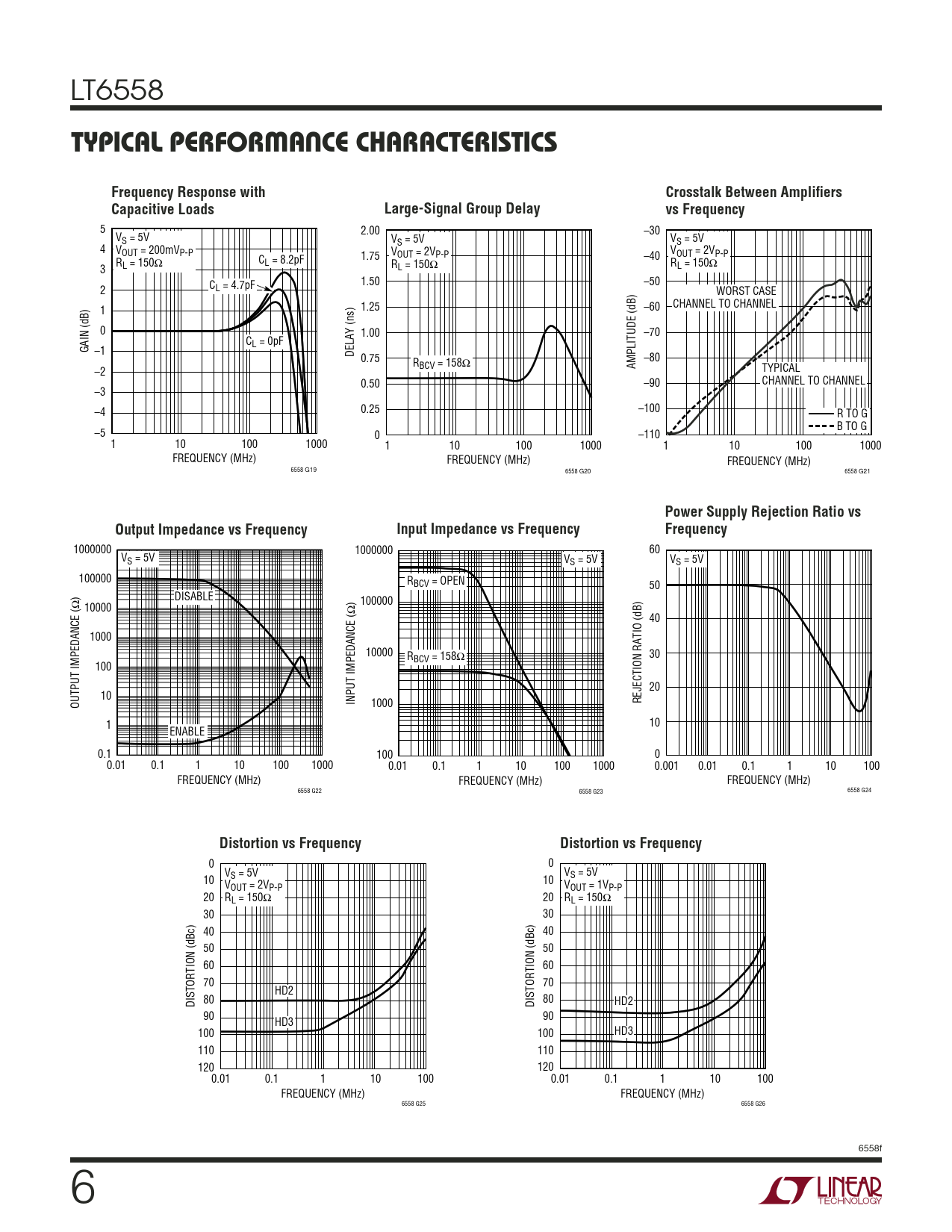 5 2.00 –30 V V V S = 5V S = 5V S = 5V 4 V V V OUT = 200mVP-P 1.75 OUT = 2VP-P –40 OUT = 2VP-P C R L = 8.2pF R R L = 150Ω L = 150Ω L = 150Ω 3 1.50 –50 2 CL = 4.7pF WORST CASE 1.25 –60 CHANNEL TO CHANNEL 1 0 1.00 –70 C GAIN (dB) L = 0pF –1 DELAY (ns) 0.75 –80 RBCV = 158Ω AMPLITUDE (dB) TYPICAL –2 0.50 –90 CHANNEL TO CHANNEL –3 0.25 –100 –4 R TO G B TO G –5 0 –110 1 10 100 1000 1 10 100 1000 1 10 100 1000 FREQUENCY (MHz) FREQUENCY (MHz) FREQUENCY (MHz) 6558 G19 6558 G20 6558 G21