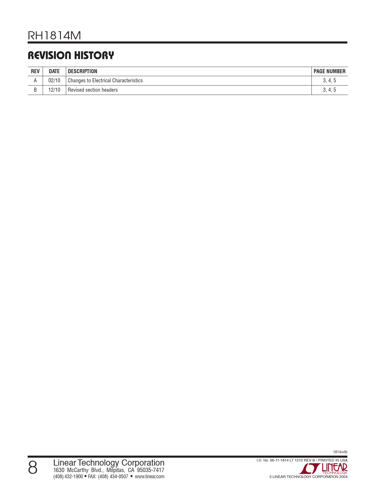 A 02/10 Changes to Electrical Characteristics 3, 4, 5 B 12/10 Revised section headers 3, 4, 5 1814mfb 8 Linear Technology Corporation I.D. No. 66-11-1814 LT 1210 REV B • PRINTED IN USA 1630 McCarthy Blvd., Milpitas, CA 95035-7417 (408) 432-1900 ● FAX: (408) 434-0507 ● www.linear.com LINEAR TECHNOLOGY CORPORATION 2004 Document Outline Description Absolute Maximum Ratings Electrical Characteristics Burn-In Circuit Package Information Table 1: Electrical Characteristics Table 2: Electrical Characteristics Table 1: Electrical Characteristics Table 2: Electrical Characteristics TABLE 2: Electrical Test Requirements Total Dose Bias Circuit Typical Performance Characteristics Revision History