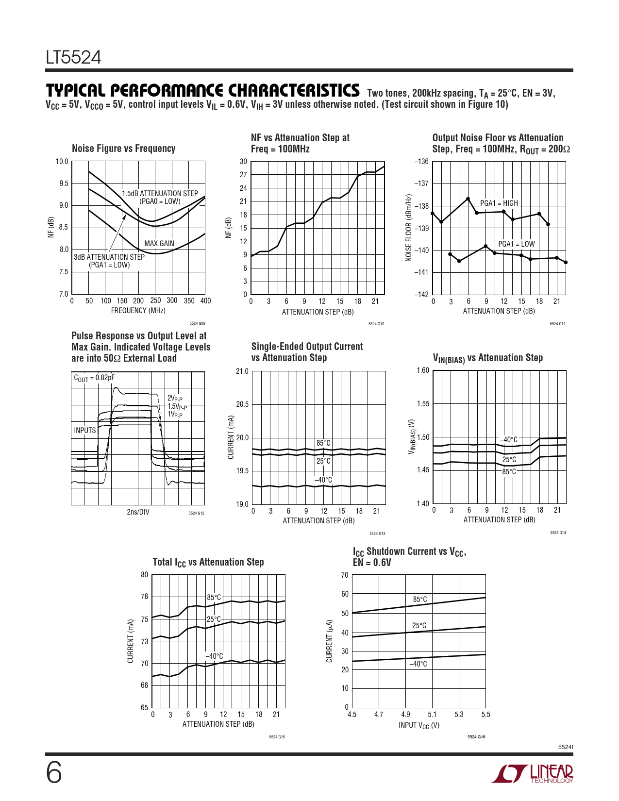 Ω 10.0 30 –136 27 9.5 –137 24 1.5dB ATTENUATION STEP (PGA0 = LOW) 21 9.0 –138 PGA1 = HIGH 18 8.5 15 –139 NF (dB) NF (dB) MAX GAIN 12 PGA1 = LOW 8.0 –140 3dB ATTENUATION STEP 9 NOISE FLOOR (dBm/Hz) (PGA1 = LOW) 6 7.5 –141 3 7.0 0 –142 0 50 100 150 200 250 300 350 400 0 3 6 9 12 15 18 21 0 3 6 9 12 15 18 21 FREQUENCY (MHz) ATTENUATION STEP (dB) ATTENUATION STEP (dB) 5524 G09 5524 G10 5524 G11
