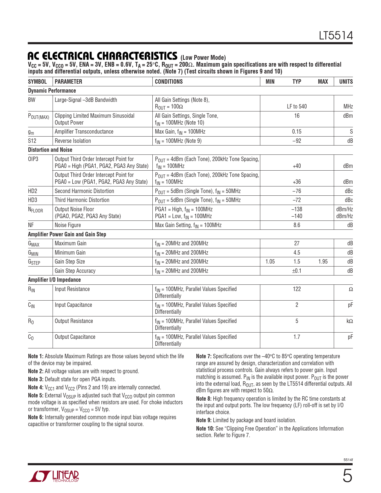 LT5514 AC ELECTRICAL CHARACTERISTICS (Low Power Mode)VCC = 5V, VCCO = 5V, ENA = 3V, ENB = 0.6V, TA = 25 ° C, ROUT = 200 Ω . Maximum gain specifications are with respect to differentialinputs and differential outputs, unless otherwise noted. (Note 7) (Test circuits shown in Figures 9 and 10)SYMBOLPARAMETERCONDITIONSMINTYPMAXUNITSDynamic Performance BW Large-Signal –3dB Bandwidth All Gain Settings (Note 8), ROUT = 100Ω LF to 540 MHz POUT(MAX) Clipping Limited Maximum Sinusoidal All Gain Settings, Single Tone, 16 dBm Output Power fIN = 100MHz (Note 10) gm Amplifier Transconductance Max Gain, fIN = 100MHz 0.15 S S12 Reverse Isolation fIN = 100MHz (Note 9) –92 dB Distortion and Noise OIP3 Output Third Order Intercept Point for POUT = 4dBm (Each Tone), 200kHz Tone Spacing, PGA0 = High (PGA1, PGA2, PGA3 Any State) fIN = 100MHz +40 dBm Output Third Order Intercept Point for POUT = 4dBm (Each Tone), 200kHz Tone Spacing, PGA0 = Low (PGA1, PGA2, PGA3 Any State) fIN = 100MHz +36 dBm HD2 Second Harmonic Distortion POUT = 5dBm (Single Tone), fIN = 50MHz –76 dBc HD3 Third Harmonic Distortion POUT = 5dBm (Single Tone), fIN = 50MHz –72 dBc NFLOOR Output Noise Floor PGA1 = High, fIN = 100MHz –138 dBm/Hz (PGAO, PGA2, PGA3 Any State) PGA1 = Low, fIN = 100MHz –140 dBm/Hz NF Noise Figure Max Gain Setting, fIN = 100MHz 8.6 dB Amplifier Power Gain and Gain Step GMAX Maximum Gain fIN = 20MHz and 200MHz 27 dB GMIN Minimum Gain fIN = 20MHz and 200MHz 4.5 dB GSTEP Gain Step Size fIN = 20MHz and 200MHz 1.05 1.5 1.95 dB Gain Step Accuracy fIN = 20MHz and 200MHz ±0.1 dB Amplifier I/O Impedance RIN Input Resistance fIN = 100MHz, Parallel Values Specified 122 Ω Differentially CIN Input Capacitance fIN = 100MHz, Parallel Values Specified 2 pF Differentially RO Output Resistance fIN = 100MHz, Parallel Values Specified 5 kΩ Differentially CO Output Capacitance fIN = 100MHz, Parallel Values Specified 1.7 pF Differentially Note 1: Absolute Maximum Ratings are those values beyond which the life Note 7: Specifications over the –40°C to 85°C operating temperature of the device may be impaired. range are assured by design, characterization and correlation with Note 2: All voltage values are with respect to ground. statistical process controls. Gain always refers to power gain. Input Note 3: Default state for open PGA inputs. matching is assumed. PIN is the available input power. POUT is the power into the external load, R Note 4: V OUT, as seen by the LT5514 differential outputs. All CC1 and VCC2 (Pins 2 and 19) are internally connected. dBm figures are with respect to 50Ω. Note 5: External VOSUP is adjusted such that VCCO output pin common Note 8: High frequency operation is limited by the RC time constants at mode voltage is as specified when resistors are used. For choke inductors the input and output ports. The low frequency (LF) roll-off is set by I/O or transformer, VOSUP = VCCO = 5V typ. interface choice. Note 6: Internally generated common mode input bias voltage requires Note 9: Limited by package and board isolation. capacitive or transformer coupling to the signal source. Note 10: See “Clipping Free Operation” in the Applications Information section. Refer to Figure 7. 5514f 5