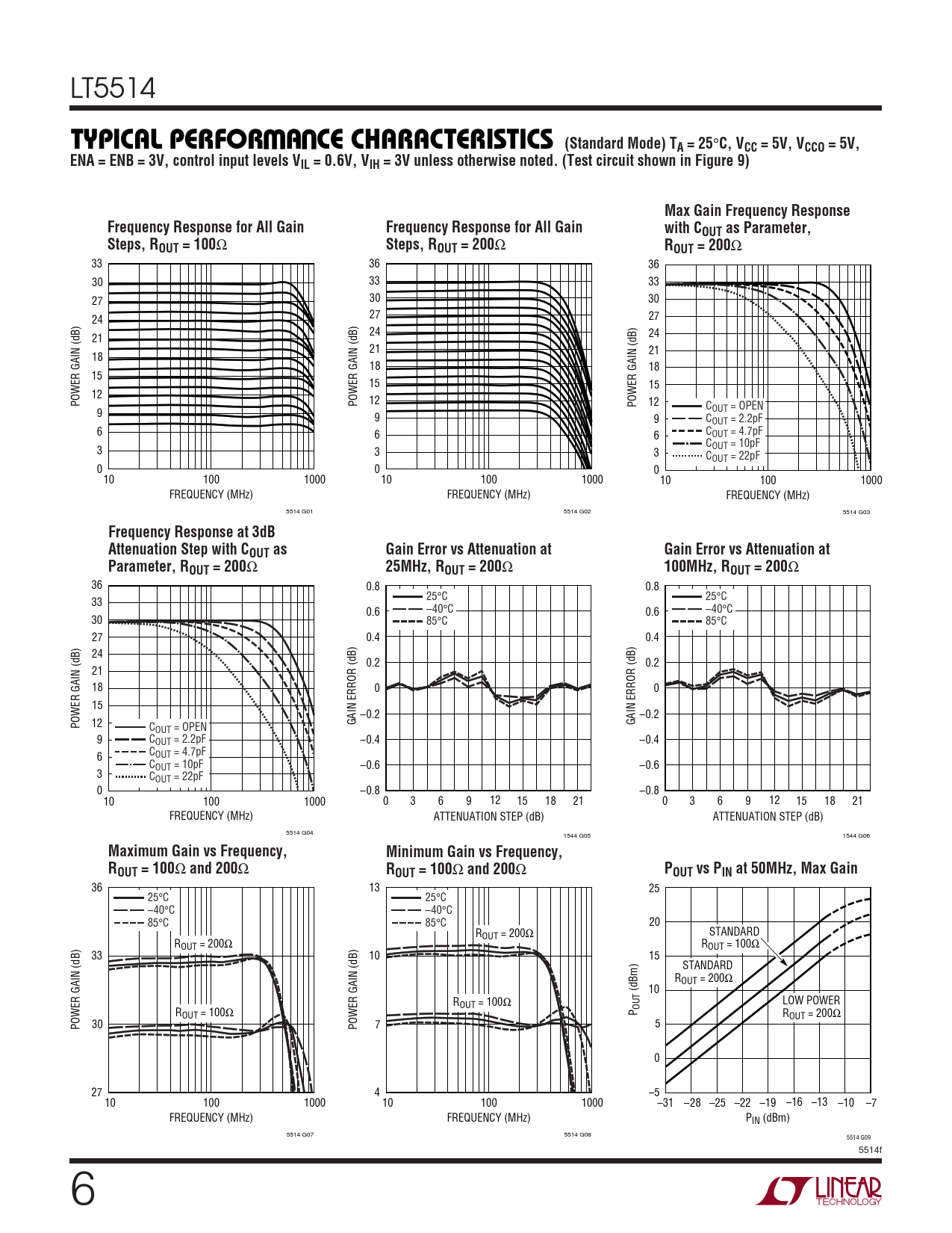 36 13 25 25°C 25°C –40°C –40°C 85°C 85°C 20 R STANDARD OUT = 200Ω ROUT = 200Ω ROUT = 100Ω 33 10 15 STANDARD ROUT = 200Ω (dBm) 10 R LOW POWER OUT = 100Ω OUT ROUT = 100Ω P ROUT = 200Ω POWER GAIN (dB) 30 POWER GAIN (dB) 7 5 0 27 4 –5 10 100 1000 10 100 1000 –31 –28 –25 –22 –19 –16 –13 –10 –7 FREQUENCY (MHz) FREQUENCY (MHz) PIN (dBm) 5514 G07 5514 G08 5514 G09 5514f 6