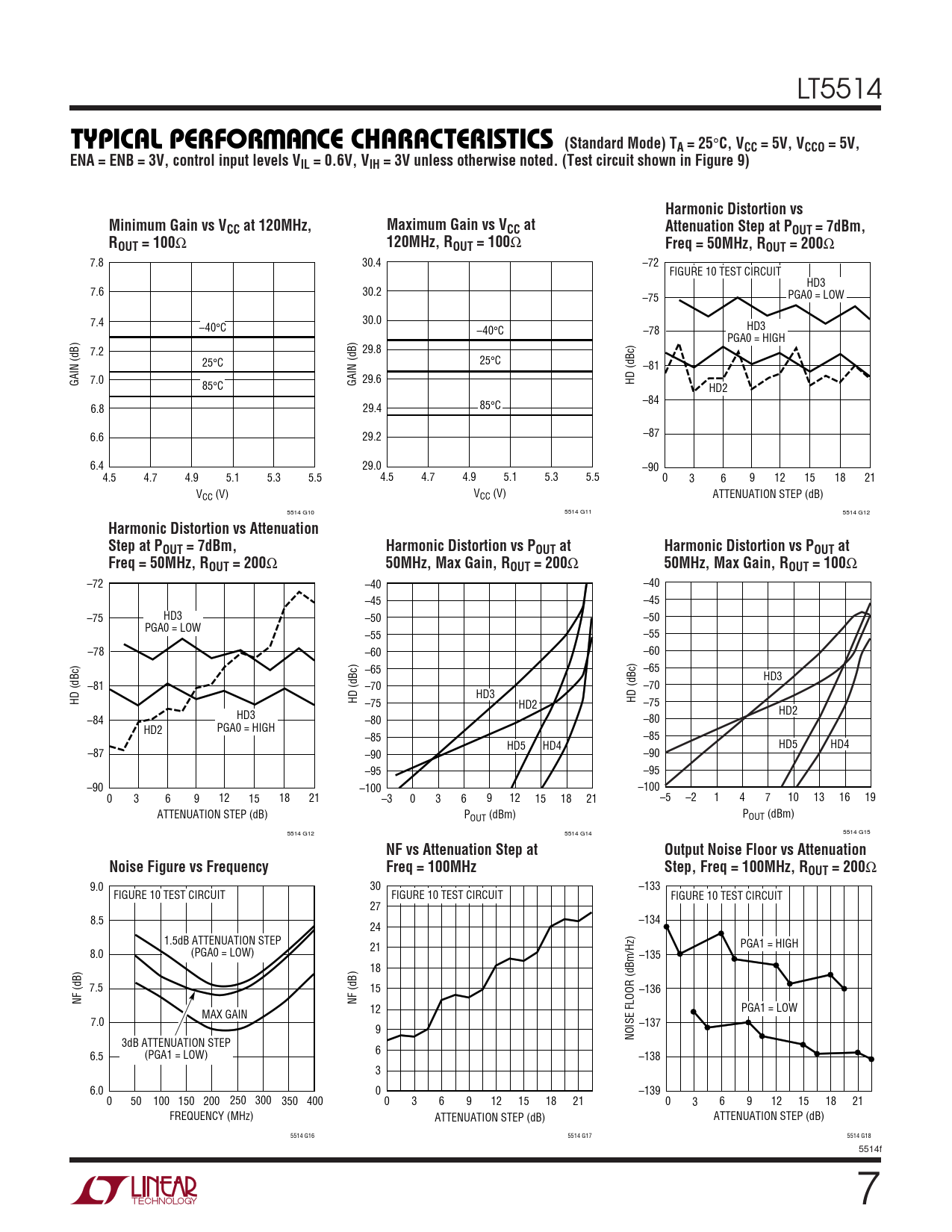 Ω –72 –40 –40 –45 –45 –75 HD3 –50 –50 PGA0 = LOW –55 –55 –78 –60 –60 –65 –65 HD3 –81 –70 –70 HD3 HD (dBc) HD (dBc) –75 HD (dBc) HD2 –75 HD3 HD2 –84 –80 –80 HD2 PGA0 = HIGH –85 –85 HD5 HD4 HD5 HD4 –87 –90 –90 –95 –95 –90 –100 –100 0 3 6 9 12 15 18 21 –3 0 3 6 9 12 15 18 21 –5 –2 1 4 7 10 13 16 19 ATTENUATION STEP (dB) POUT (dBm) POUT (dBm) 5514 G12 5514 G14 5514 G15