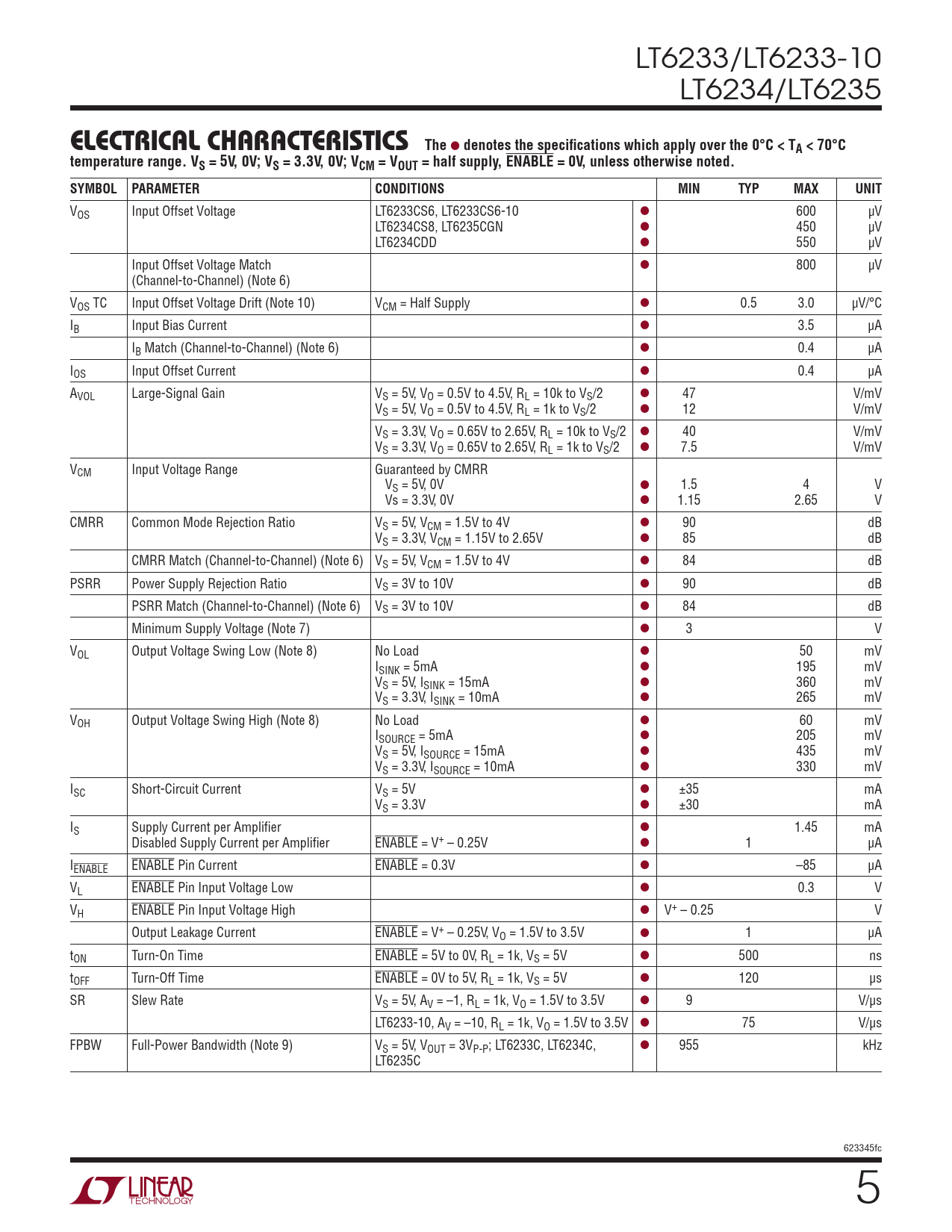 VOS Input Offset Voltage LT6233CS6, LT6233CS6-10 l 600 µV LT6234CS8, LT6235CGN l 450 µV LT6234CDD l 550 µV Input Offset Voltage Match l 800 µV (Channel-to-Channel) (Note 6) VOS TC Input Offset Voltage Drift (Note 10) VCM = Half Supply l 0.5 3.0 µV/°C IB Input Bias Current l 3.5 µA IB Match (Channel-to-Channel) (Note 6) l 0.4 µA IOS Input Offset Current l 0.4 µA AVOL Large-Signal Gain VS = 5V, VO = 0.5V to 4.5V, RL = 10k to VS/2 l 47 V/mV VS = 5V, VO = 0.5V to 4.5V, RL = 1k to VS/2 l 12 V/mV VS = 3.3V, VO = 0.65V to 2.65V, RL = 10k to VS/2 l 40 V/mV VS = 3.3V, VO = 0.65V to 2.65V, RL = 1k to VS/2 l 7.5 V/mV VCM Input Voltage Range Guaranteed by CMRR VS = 5V, 0V l 1.5 4 V Vs = 3.3V, 0V l 1.15 2.65 V CMRR Common Mode Rejection Ratio VS = 5V, VCM = 1.5V to 4V l 90 dB VS = 3.3V, VCM = 1.15V to 2.65V l 85 dB CMRR Match (Channel-to-Channel) (Note 6) VS = 5V, VCM = 1.5V to 4V l 84 dB PSRR Power Supply Rejection Ratio VS = 3V to 10V l 90 dB PSRR Match (Channel-to-Channel) (Note 6) VS = 3V to 10V l 84 dB Minimum Supply Voltage (Note 7) l 3 V VOL Output Voltage Swing Low (Note 8) No Load l 50 mV ISINK = 5mA l 195 mV VS = 5V, ISINK = 15mA l 360 mV VS = 3.3V, ISINK = 10mA l 265 mV VOH Output Voltage Swing High (Note 8) No Load l 60 mV ISOURCE = 5mA l 205 mV VS = 5V, ISOURCE = 15mA l 435 mV VS = 3.3V, ISOURCE = 10mA l 330 mV ISC Short-Circuit Current VS = 5V l ±35 mA VS = 3.3V l ±30 mA IS Supply Current per Amplifier l 1.45 mA Disabled Supply Current per Amplifier ENABLE = V+ – 0.25V l 1 µA IENABLE ENABLE Pin Current ENABLE = 0.3V l –85 µA VL ENABLE Pin Input Voltage Low l 0.3 V VH ENABLE Pin Input Voltage High l V+ – 0.25 V Output Leakage Current ENABLE = V+ – 0.25V, VO = 1.5V to 3.5V l 1 µA tON Turn-On Time ENABLE = 5V to 0V, RL = 1k, VS = 5V l 500 ns tOFF Turn-Off Time ENABLE = 0V to 5V, RL = 1k, VS = 5V l 120 µs SR Slew Rate VS = 5V, AV = –1, RL = 1k, VO = 1.5V to 3.5V l 9 V/µs LT6233-10, AV = –10, RL = 1k, VO = 1.5V to 3.5V l 75 V/µs FPBW Full-Power Bandwidth (Note 9) VS = 5V, VOUT = 3VP-P; LT6233C, LT6234C, l 955 kHz LT6235C 623345fc 5 Document Outline Features Applications Description Typical Application Absolute Maximum Ratings Pin Configuration Order Information Electrical Characteristics Typical Performance Characteristics Applications Information Typical Applications Package Description Revision History Typical Applications Related Parts