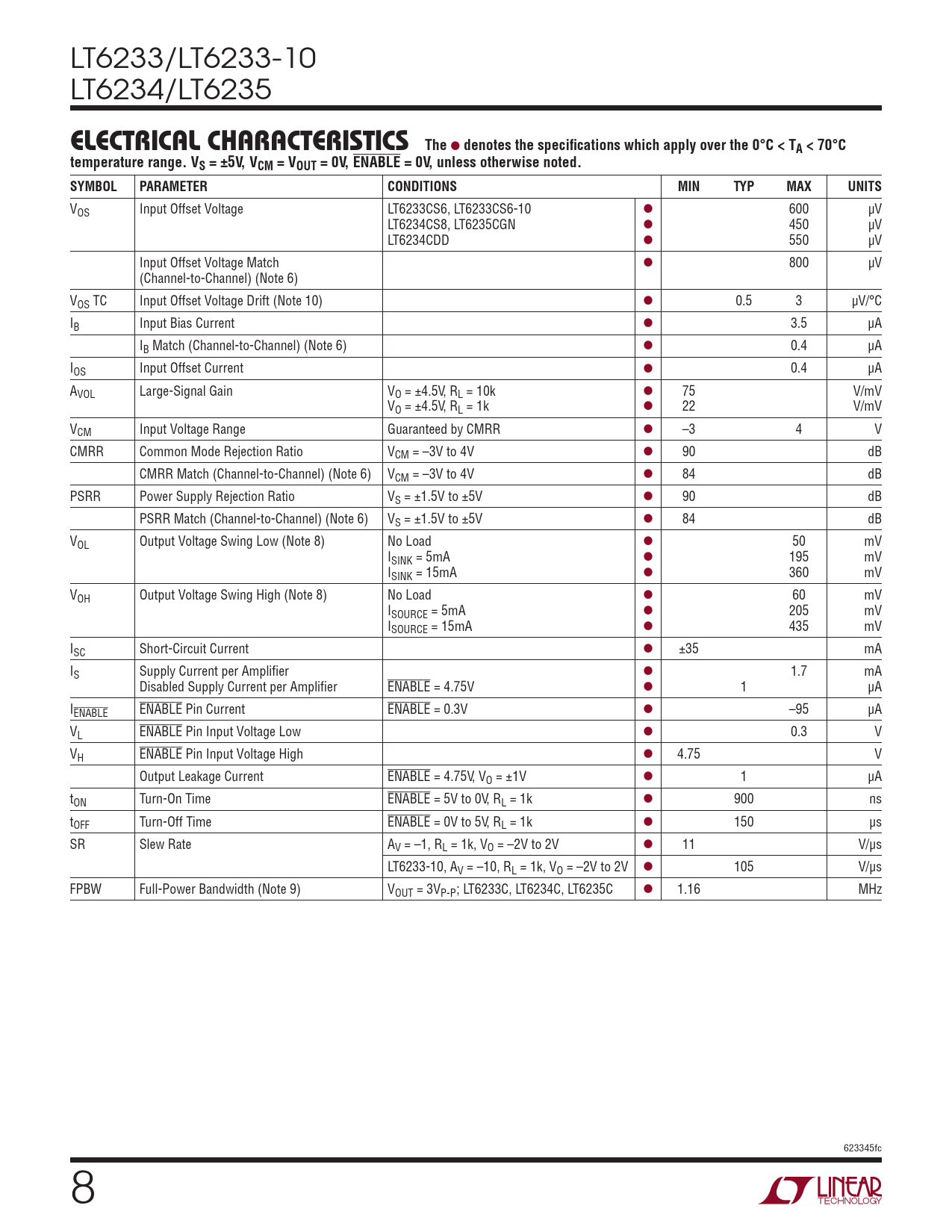 VOS Input Offset Voltage LT6233CS6, LT6233CS6-10 l 600 µV LT6234CS8, LT6235CGN l 450 µV LT6234CDD l 550 µV Input Offset Voltage Match l 800 µV (Channel-to-Channel) (Note 6) VOS TC Input Offset Voltage Drift (Note 10) l 0.5 3 µV/°C IB Input Bias Current l 3.5 µA IB Match (Channel-to-Channel) (Note 6) l 0.4 µA IOS Input Offset Current l 0.4 µA AVOL Large-Signal Gain VO = ±4.5V, RL = 10k l 75 V/mV VO = ±4.5V, RL = 1k l 22 V/mV VCM Input Voltage Range Guaranteed by CMRR l –3 4 V CMRR Common Mode Rejection Ratio VCM = –3V to 4V l 90 dB CMRR Match (Channel-to-Channel) (Note 6) VCM = –3V to 4V l 84 dB PSRR Power Supply Rejection Ratio VS = ±1.5V to ±5V l 90 dB PSRR Match (Channel-to-Channel) (Note 6) VS = ±1.5V to ±5V l 84 dB VOL Output Voltage Swing Low (Note 8) No Load l 50 mV ISINK = 5mA l 195 mV ISINK = 15mA l 360 mV VOH Output Voltage Swing High (Note 8) No Load l 60 mV ISOURCE = 5mA l 205 mV ISOURCE = 15mA l 435 mV ISC Short-Circuit Current l ±35 mA IS Supply Current per Amplifier l 1.7 mA Disabled Supply Current per Amplifier ENABLE = 4.75V l 1 µA IENABLE ENABLE Pin Current ENABLE = 0.3V l –95 µA VL ENABLE Pin Input Voltage Low l 0.3 V VH ENABLE Pin Input Voltage High l 4.75 V Output Leakage Current ENABLE = 4.75V, VO = ±1V l 1 µA tON Turn-On Time ENABLE = 5V to 0V, RL = 1k l 900 ns tOFF Turn-Off Time ENABLE = 0V to 5V, RL = 1k l 150 µs SR Slew Rate AV = –1, RL = 1k, VO = –2V to 2V l 11 V/µs LT6233-10, AV = –10, RL = 1k, VO = –2V to 2V l 105 V/µs FPBW Full-Power Bandwidth (Note 9) VOUT = 3VP-P ; LT6233C, LT6234C, LT6235C l 1.16 MHz 623345fc 8 Document Outline Features Applications Description Typical Application Absolute Maximum Ratings Pin Configuration Order Information Electrical Characteristics Typical Performance Characteristics Applications Information Typical Applications Package Description Revision History Typical Applications Related Parts
