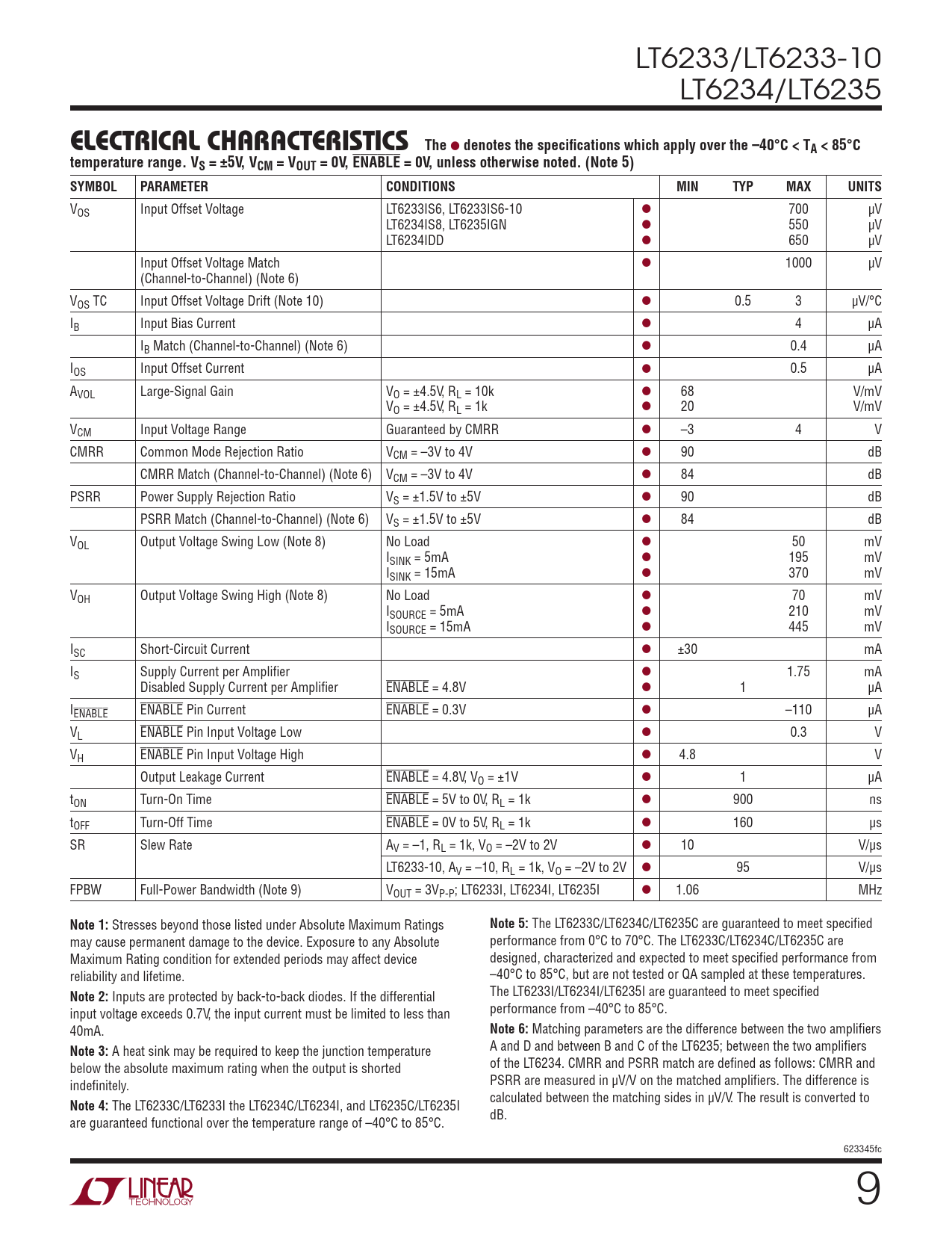 VOS Input Offset Voltage LT6233IS6, LT6233IS6-10 l 700 µV LT6234IS8, LT6235IGN l 550 µV LT6234IDD l 650 µV Input Offset Voltage Match l 1000 µV (Channel-to-Channel) (Note 6) VOS TC Input Offset Voltage Drift (Note 10) l 0.5 3 µV/°C IB Input Bias Current l 4 µA IB Match (Channel-to-Channel) (Note 6) l 0.4 µA IOS Input Offset Current l 0.5 µA AVOL Large-Signal Gain VO = ±4.5V, RL = 10k l 68 V/mV VO = ±4.5V, RL = 1k l 20 V/mV VCM Input Voltage Range Guaranteed by CMRR l –3 4 V CMRR Common Mode Rejection Ratio VCM = –3V to 4V l 90 dB CMRR Match (Channel-to-Channel) (Note 6) VCM = –3V to 4V l 84 dB PSRR Power Supply Rejection Ratio VS = ±1.5V to ±5V l 90 dB PSRR Match (Channel-to-Channel) (Note 6) VS = ±1.5V to ±5V l 84 dB VOL Output Voltage Swing Low (Note 8) No Load l 50 mV ISINK = 5mA l 195 mV ISINK = 15mA l 370 mV VOH Output Voltage Swing High (Note 8) No Load l 70 mV ISOURCE = 5mA l 210 mV ISOURCE = 15mA l 445 mV ISC Short-Circuit Current l ±30 mA IS Supply Current per Amplifier l 1.75 mA Disabled Supply Current per Amplifier ENABLE = 4.8V l 1 µA IENABLE ENABLE Pin Current ENABLE = 0.3V l –110 µA VL ENABLE Pin Input Voltage Low l 0.3 V VH ENABLE Pin Input Voltage High l 4.8 V Output Leakage Current ENABLE = 4.8V, VO = ±1V l 1 µA tON Turn-On Time ENABLE = 5V to 0V, RL = 1k l 900 ns tOFF Turn-Off Time ENABLE = 0V to 5V, RL = 1k l 160 µs SR Slew Rate AV = –1, RL = 1k, VO = –2V to 2V l 10 V/µs LT6233-10, AV = –10, RL = 1k, VO = –2V to 2V l 95 V/µs FPBW Full-Power Bandwidth (Note 9) VOUT = 3VP-P; LT6233I, LT6234I, LT6235I l 1.06 MHz