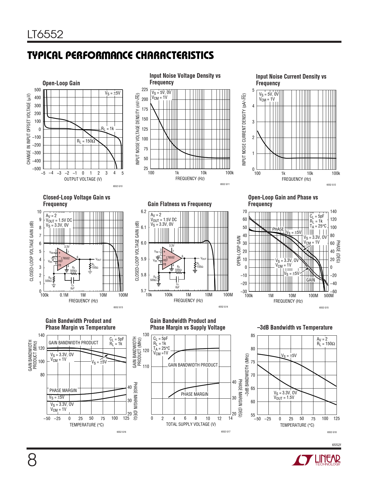 LT6552 WUTYPICAL PERFOR A CE CHARACTERISTICSInput Noise Voltage Density vsInput Noise Current Density vsOpen-Loop GainFrequencyFrequency 500 225 5 V V S = ±5V S = 5V, 0V VS = 5V, 0V µV) 400 √Hz) V 200 CM = 1V √Hz) VCM = 1V 300 4 175 200 150 100 3 0 RL = 1k 125 –100 100 2 RL = 150Ω –200 75 –300 1 50 –400 CHANGE IN INPUT OFFSET VOLTAGE ( INPUT NOISE VOLTAGE DENSITY (nV/ INPUT NOISE CURRENT DENSITY (pA/ –500 25 0 –5 –4 –3 –2 –1 0 1 2 3 4 5 100 1k 10k 100k 100 1k 10k 100k OUTPUT VOLTAGE (V) FREQUENCY (Hz) FREQUENCY (Hz) 6552 G11 6552 G12 6552 G10 Closed-Loop Voltage Gain vsOpen-Loop Gain and Phase vsFrequencyGain Flatness vs FrequencyFrequency 10 6.2 70 140 A A V = 2 V = 2 CL = 5pF 9 V 60 120 VOUT = 1.5V DC OUT = 1.5V DC RL = 1k V VS = 3.3V, 0V 8 S = 3.3V, 0V 6.1 50 TA = 25°C 100 PHASE VS = ±5V 7 40 80 VS = 3.3V, OV PHASE (DEG) 6 6.0 30 VCM = 1V 60 3.3V 3.3V 5 3 3 V 7 V 7 IN + 20 40 IN + 2 2 – 6 – 6 LT6552 4 LT6552 1 VOUT 5.9 1 VOUT V REF 10 20 V REF DC V DC 8 S = 3.3V, OV 8 R FB R FB L 4 L OPEN-LOOP GAIN V 3 4 R R F 150Ω CM = 1V F 150Ω 0 0 500Ω 500Ω 2 5.8 VS = ±5V R –10 –20 R G CLOSED-LOOP VOLTAGE GAIN (dB) G 500 CLOSED-LOOP VOLTAGE GAIN (dB) 500Ω Ω GAIN 1 C C F –20 –40 F 8pF 8pF 0 5.7 –30 –60 100k 0.1M 1M 10M 100M 10k 100k 1M 10M 100M 100k 1M 10M 100M 500M FREQUENCY (Hz) FREQUENCY (Hz) FREQUENCY (Hz) 6552 G13 6552 G14 6552 G15 Gain Bandwidth Product andGain Bandwidth Product andPhase Margin vs TemperaturePhase Margin vs Supply Voltage–3dB Bandwidth vs Temperature 140 130 85 CL = 5pF CL = 5pF AV = 2 GAIN BANDWIDTH PRODUCT RL = 1k RL = 1k RL = 150Ω 120 TA = 25°C 80 120 V V S = 3.3V, OV CM =1V VS = ±5V V 100 CM = 1V V 75 S = ±5V PRODUCT (MHz) GAIN BANDWIDTH PRODUCT PRODUCT (MHz) GAIN BANDWIDTH 110 GAIN BANDWIDTH 80 70 PHASE MARGIN (DEG) PHASE MARGIN (DEG) 40 40 65 PHASE MARGIN 3dB BANDWIDTH (MHz) V PHASE MARGIN – S = 3.3V, OV VS = ±5V 30 V 30 OUT = 1.5V 60 VS = 3.3V, OV VCM = 1V 20 20 55 –50 –25 0 25 50 75 100 125 0 2 4 6 8 10 12 14 –50 –25 0 25 50 75 100 125 TEMPERATURE (°C) TOTAL SUPPLY VOLTAGE (V) TEMPERATURE (°C) 6552 G16 6552 G17 6552 G18 6552f 8