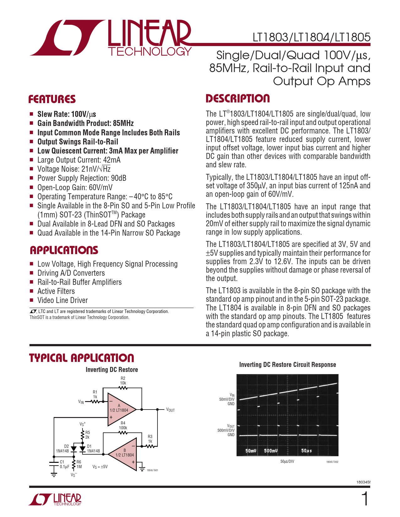 LT1803/LT1804/LT1805 Single/Dual/Quad 100V/µs, 85MHz, Rail-to-Rail Input and Output Op Amps