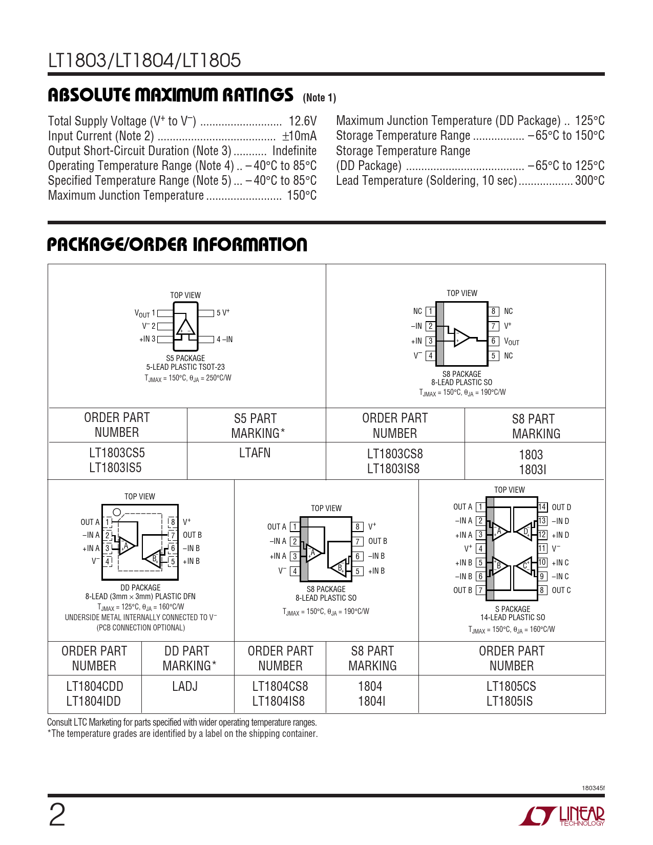 LT1803/LT1804/LT1805 WWWUABSOLUTE MAXIMUM RATINGS (Note 1) Total Supply Voltage (V+ to V–) ... 12.6V Maximum Junction Temperature (DD Package) .. 125°C Input Current (Note 2) ... ±10mA Storage Temperature Range ... – 65°C to 150°C Output Short-Circuit Duration (Note 3) ... Indefinite Storage Temperature Range Operating Temperature Range (Note 4) .. – 40°C to 85°C (DD Package) ... – 65°C to 125°C Specified Temperature Range (Note 5) ... – 40°C to 85°C Lead Temperature (Soldering, 10 sec).. 300°C Maximum Junction Temperature ... 150°C UWUPACKAGE/ORDER INFORMATION TOP VIEW TOP VIEW V 5 V+ NC 1 8 NC OUT 1 V– 2 –IN 2 7 V+ + – – +IN 3 4 –IN +IN 3 + 6 VOUT S5 PACKAGE V– 4 5 NC 5-LEAD PLASTIC TSOT-23 S8 PACKAGE TJMAX = 150°C, θJA = 250°C/W 8-LEAD PLASTIC SO TJMAX = 150°C, θJA = 190°C/W ORDER PART S5 PART ORDER PART S8 PART NUMBER MARKING* NUMBER MARKING LT1803CS5 LTAFN LT1803CS8 1803 LT1803IS5 LT1803IS8 1803I TOP VIEW TOP VIEW OUT A 1 14 TOP VIEW OUT D OUT A 1 8 V+ –IN A 2 13 –IN D OUT A 1 8 V+ – – A –IN A 2 7 OUT B +IN A 3 D + + 12 +IN D – –IN A 2 7 OUT B +IN A 3 A + 6 –IN B – V+ 4 11 V – – +IN A A 3 + 6 –IN B V– 4 B+ 5 +IN B – +IN B 5 + + 10 +IN C B C B+ – – V– 4 5 +IN B –IN B 6 9 –IN C DD PACKAGE S8 PACKAGE OUT B 7 8 OUT C 8-LEAD (3mm × 3mm) PLASTIC DFN 8-LEAD PLASTIC SO TJMAX = 125°C, θJA = 160°C/W S PACKAGE TJMAX = 150°C, θJA = 190°C/W UNDERSIDE METAL INTERNALLY CONNECTED TO V– 14-LEAD PLASTIC SO (PCB CONNECTION OPTIONAL) TJMAX = 150°C, θJA = 160°C/W ORDER PART DD PART ORDER PART S8 PART ORDER PART NUMBER MARKING* NUMBER MARKING NUMBER LT1804CDD LADJ LT1804CS8 1804 LT1805CS LT1804IDD LT1804IS8 1804I LT1805IS Consult LTC Marketing for parts specified with wider operating temperature ranges. *The temperature grades are identified by a label on the shipping container. 180345f 2
