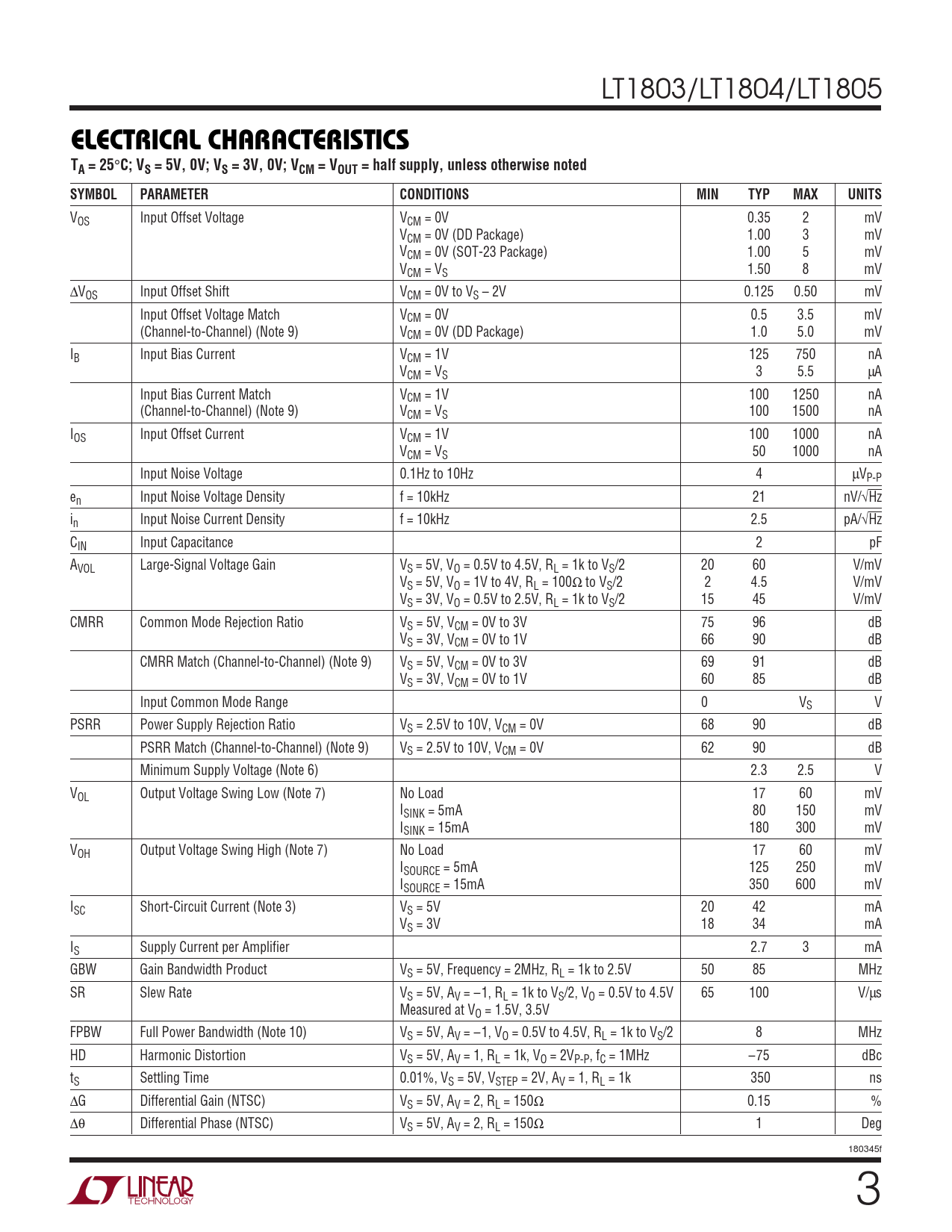 VOS Input Offset Voltage VCM = 0V 0.35 2 mV VCM = 0V (DD Package) 1.00 3 mV VCM = 0V (SOT-23 Package) 1.00 5 mV VCM = VS 1.50 8 mV ∆VOS Input Offset Shift VCM = 0V to VS – 2V 0.125 0.50 mV Input Offset Voltage Match VCM = 0V 0.5 3.5 mV (Channel-to-Channel) (Note 9) VCM = 0V (DD Package) 1.0 5.0 mV IB Input Bias Current VCM = 1V 125 750 nA VCM = VS 3 5.5 µA Input Bias Current Match VCM = 1V 100 1250 nA (Channel-to-Channel) (Note 9) VCM = VS 100 1500 nA IOS Input Offset Current VCM = 1V 100 1000 nA VCM = VS 50 1000 nA Input Noise Voltage 0.1Hz to 10Hz 4 µVP-P en Input Noise Voltage Density f = 10kHz 21 nV/√Hz in Input Noise Current Density f = 10kHz 2.5 pA/√Hz CIN Input Capacitance 2 pF AVOL Large-Signal Voltage Gain VS = 5V, VO = 0.5V to 4.5V, RL = 1k to VS/2 20 60 V/mV VS = 5V, VO = 1V to 4V, RL = 100Ω to VS/2 2 4.5 V/mV VS = 3V, VO = 0.5V to 2.5V, RL = 1k to VS/2 15 45 V/mV CMRR Common Mode Rejection Ratio VS = 5V, VCM = 0V to 3V 75 96 dB VS = 3V, VCM = 0V to 1V 66 90 dB CMRR Match (Channel-to-Channel) (Note 9) VS = 5V, VCM = 0V to 3V 69 91 dB VS = 3V, VCM = 0V to 1V 60 85 dB Input Common Mode Range 0␣ ␣ VS V PSRR Power Supply Rejection Ratio VS = 2.5V to 10V, VCM = 0V 68 90 dB PSRR Match (Channel-to-Channel) (Note 9) VS = 2.5V to 10V, VCM = 0V 62 90 dB Minimum Supply Voltage (Note 6) 2.3 2.5 V VOL Output Voltage Swing Low (Note 7) No Load 17 60 mV ISINK = 5mA 80 150 mV ISINK = 15mA 180 300 mV VOH Output Voltage Swing High (Note 7) No Load 17 60 mV ISOURCE = 5mA 125 250 mV ISOURCE = 15mA 350 600 mV ISC Short-Circuit Current (Note 3) VS = 5V 20 42 mA VS = 3V 18 34 mA IS Supply Current per Amplifier 2.7 3 mA GBW Gain Bandwidth Product VS = 5V, Frequency = 2MHz, RL = 1k to 2.5V 50 85 MHz SR Slew Rate VS = 5V, AV = –1, RL = 1k to VS/2, VO = 0.5V to 4.5V 65 100 V/µs Measured at VO = 1.5V, 3.5V FPBW Full Power Bandwidth (Note 10) VS = 5V, AV = –1, VO = 0.5V to 4.5V, RL = 1k to VS/2 8 MHz HD Harmonic Distortion VS = 5V, AV = 1, RL = 1k, VO = 2VP-P, fC = 1MHz –75 dBc tS Settling Time 0.01%, VS = 5V, VSTEP = 2V, AV = 1, RL = 1k 350 ns ∆G Differential Gain (NTSC) VS = 5V, AV = 2, RL = 150Ω 0.15 % ∆θ Differential Phase (NTSC) VS = 5V, AV = 2, RL = 150Ω 1 Deg 180345f 3