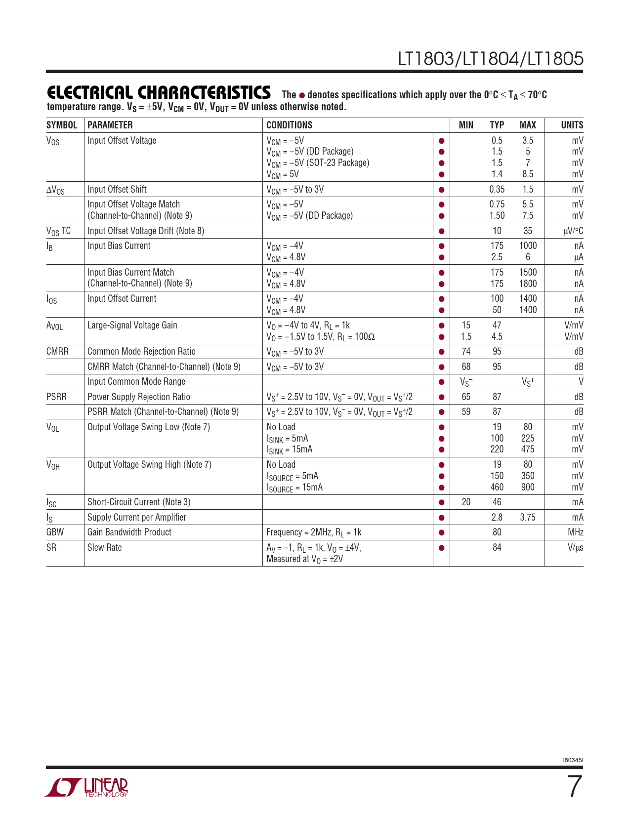 VOS Input Offset Voltage VCM = –5V ● 0.5 3.5 mV VCM = –5V (DD Package) ● 1.5 5 mV VCM = –5V (SOT-23 Package) ● 1.5 7 mV VCM = 5V ● 1.4 8.5 mV ∆VOS Input Offset Shift VCM = –5V to 3V ● 0.35 1.5 mV Input Offset Voltage Match VCM = –5V ● 0.75 5.5 mV (Channel-to-Channel) (Note 9) VCM = –5V (DD Package) ● 1.50 7.5 mV VOS TC Input Offset Voltage Drift (Note 8) ● 10 35 µV/°C IB Input Bias Current VCM = –4V ● 175 1000 nA VCM = 4.8V ● 2.5 6 µA Input Bias Current Match VCM = –4V ● 175 1500 nA (Channel-to-Channel) (Note 9) VCM = 4.8V ● 175 1800 nA IOS Input Offset Current VCM = –4V ● 100 1400 nA VCM = 4.8V ● 50 1400 nA AVOL Large-Signal Voltage Gain VO = –4V to 4V, RL = 1k ● 15 47 V/mV VO = –1.5V to 1.5V, RL = 100Ω ● 1.5 4.5 V/mV CMRR Common Mode Rejection Ratio VCM = –5V to 3V ● 74 95 dB CMRR Match (Channel-to-Channel) (Note 9) VCM = –5V to 3V ● 68 95 dB Input Common Mode Range ● V – + S VS V PSRR Power Supply Rejection Ratio V + – + S = 2.5V to 10V, VS = 0V, VOUT = VS /2 ● 65 87 dB PSRR Match (Channel-to-Channel) (Note 9) V + – + S = 2.5V to 10V, VS = 0V, VOUT = VS /2 ● 59 87 dB VOL Output Voltage Swing Low (Note 7) No Load ● 19 80 mV ISINK = 5mA ● 100 225 mV ISINK = 15mA ● 220 475 mV VOH Output Voltage Swing High (Note 7) No Load ● 19 80 mV ISOURCE = 5mA ● 150 350 mV ISOURCE = 15mA ● 460 900 mV ISC Short-Circuit Current (Note 3) ● 20 46 mA IS Supply Current per Amplifier ● 2.8 3.75 mA GBW Gain Bandwidth Product Frequency = 2MHz, RL = 1k ● 80 MHz SR Slew Rate AV = –1, RL = 1k, VO = ±4V, ● 84 V/µs Measured at VO = ±2V 180345f 7