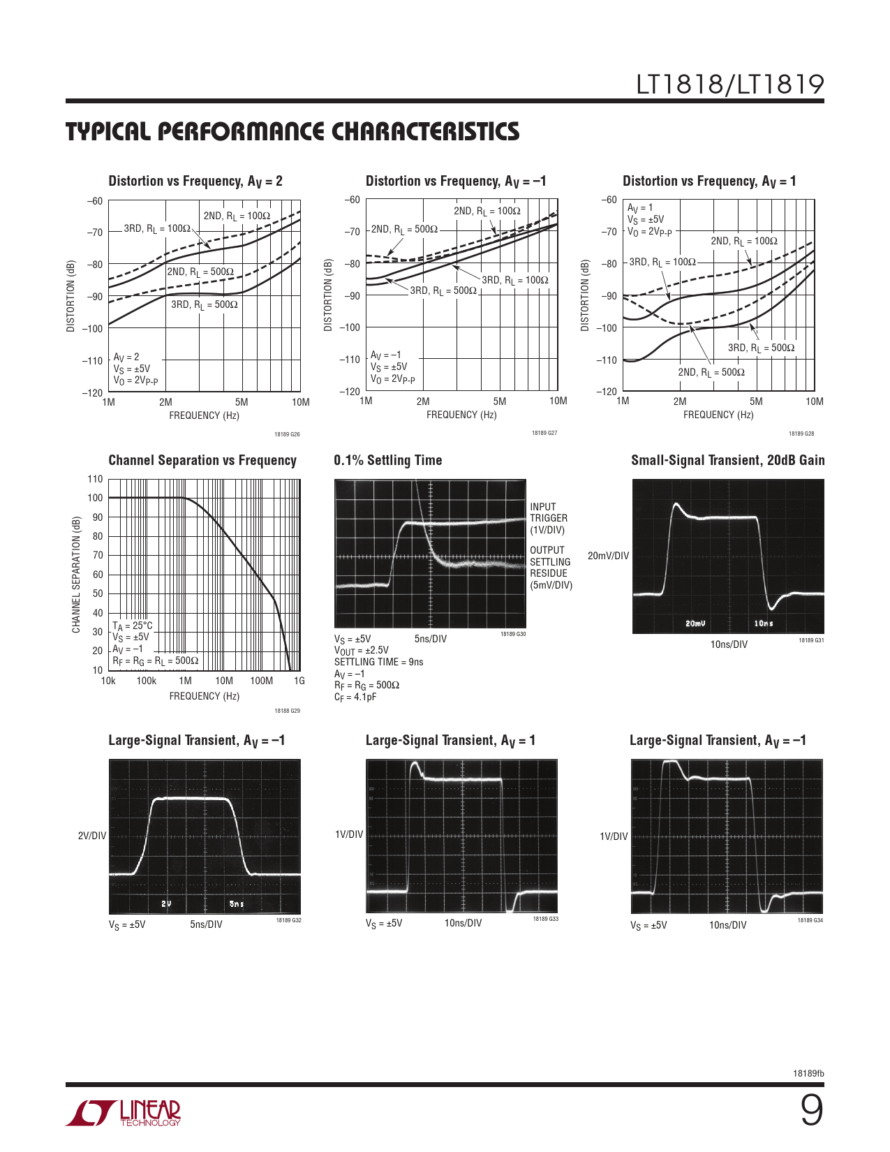 LT1818/LT1819 TYPICAL PERFORMANCE CHARACTERISTICSDistortion vs Frequency, A V = 2Distortion vs Frequency, A V = –1Distortion vs Frequency, A V = 1 –60 –60 –60 AV = 1 2ND, R 2ND, RL = 100Ω L = 100Ω VS = ±5V –70 3RD, RL = 100Ω –70 2ND, RL = 500Ω –70 VO = 2VP-P 2ND, RL = 100Ω –80 –80 –80 3RD, RL = 100Ω 2ND, RL = 500Ω 3RD, RL = 100Ω 3RD, R –90 –90 L = 500Ω –90 3RD, RL = 500Ω DISTORTION (dB) –100 DISTORTION (dB) –100 DISTORTION (dB) –100 3RD, R A L = 500Ω –110 AV = 2 –110 V = –1 –110 V V S = ±5V S = ±5V 2ND, RL = 500Ω V V O = 2VP-P O = 2VP-P –120 –120 –120 1M 2M 5M 10M 1M 2M 5M 10M 1M 2M 5M 10M FREQUENCY (Hz) FREQUENCY (Hz) FREQUENCY (Hz) 18189 G26 18189 G27 18189 G28 Channel Separation vs Frequency0.1% Settling TimeSmall-Signal Transient, 20dB Gain 110 100 INPUT 90 TRIGGER (1V/DIV) 80 OUTPUT 70 20mV/DIV SETTLING 60 RESIDUE (5mV/DIV) 50 40 CHANNEL SEPARATION (dB) T 30 A = 25°C V 18189 G30 S = ±5V VS = ±5V 5ns/DIV 18189 G31 10ns/DIV 20 AV = –1 VOUT = ±2.5V RF = RG = RL = 500Ω SETTLING TIME = 9ns 10 A 10k 100k 1M 10M 100M 1G V = –1 RF = RG = 500Ω FREQUENCY (Hz) CF = 4.1pF 18188 G29 Large-Signal Transient, A V = –1Large-Signal Transient, A V = 1Large-Signal Transient, A V = –1 2V/DIV 1V/DIV 1V/DIV 18189 G32 18189 G33 V 5ns/DIV 18189 G34 S = ±5V V 10ns/DIV S = ±5V V 10ns/DIV S = ±5V 18189fb 9 Document Outline FEATURES DESCRIPTION APPLICATIONS TYPICAL APPLICATION ABSOLUTE MAXIMUM RATINGS PIN CONFIGURATION ORDER INFORMATION E LECTRICAL CHARACTERISTICS TYPICAL PERFORMANCE CHARACTERISTICS APPLICATIONS INFORMATION TYPICAL APPLICATION SIMPLIFIED SCHEMATIC PACKAGE DESCRIPTION REVISION HISTORY TYPICAL APPLICATION RELATED PARTS