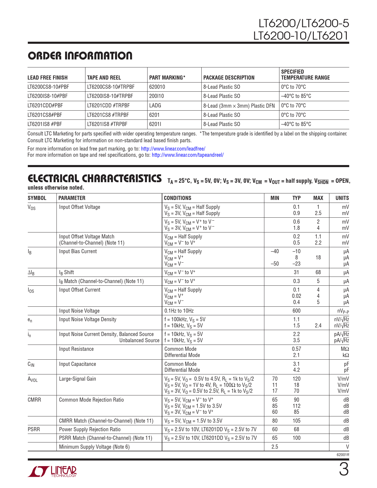 LT6200CS8-10#PBF LT6200CS8-10#TRPBF 620010 8-Lead Plastic SO 0°C to 70°C LT6200IS8-10#PBF LT6200IS8-10#TRPBF 200I10 8-Lead Plastic SO –40°C to 85°C LT6201CDD#PBF LT6201CDD #TRPBF LADG 8-Lead (3mm × 3mm) Plastic DFN 0°C to 70°C LT6201CS8#PBF LT6201CS8 #TRPBF 6201 8-Lead Plastic SO 0°C to 70°C LT6201IS8 #PBF LT6201IS8 #TRPBF 6201I 8-Lead Plastic SO –40°C to 85°C Consult LTC Marketing for parts specified with wider operating temperature ranges. *The temperature grade is identified by a label on the shipping container. Consult LTC Marketing for information on non-standard lead based finish parts. For more information on lead free part marking, go to: http://www.linear.com/leadfree/ For more information on tape and reel specifications, go to: http://www.linear.com/tapeandreel/