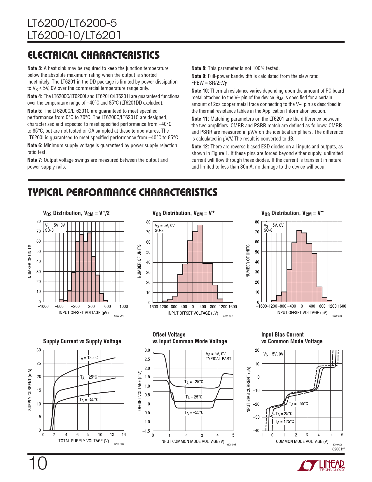 LT6200/LT6200-5 LT6200-10/LT6201 elecTrical characTerisTics Note 3: A heat sink may be required to keep the junction temperature Note 8: This parameter is not 100% tested. below the absolute maximum rating when the output is shorted Note 9: Full-power bandwidth is calculated from the slew rate: indefinitely. The LT6201 in the DD package is limited by power dissipation FPBW = SR/2πVP to VS ≤ 5V, 0V over the commercial temperature range only. Note 10: Thermal resistance varies depending upon the amount of PC board Note 4: The LT6200C/LT6200I and LT6201C/LT6201I are guaranteed functional metal attached to the V– pin of the device. θJA is specified for a certain over the temperature range of –40°C and 85°C (LT6201DD excluded). amount of 2oz copper metal trace connecting to the V– pin as described in Note 5: The LT6200C/LT6201C are guaranteed to meet specified the thermal resistance tables in the Application Information section. performance from 0°C to 70°C. The LT6200C/LT6201C are designed, Note 11: Matching parameters on the LT6201 are the difference between characterized and expected to meet specified performance from –40°C the two amplifiers. CMRR and PSRR match are defined as follows: CMRR to 85°C, but are not tested or QA sampled at these temperatures. The and PSRR are measured in µV/V on the identical amplifiers. The difference LT6200I is guaranteed to meet specified performance from –40°C to 85°C. is calculated in µV/V. The result is converted to dB. Note 6: Minimum supply voltage is guaranteed by power supply rejection Note 12: There are reverse biased ESD diodes on all inputs and outputs, as ratio test. shown in Figure 1. If these pins are forced beyond either supply, unlimited Note 7: Output voltage swings are measured between the output and current will flow through these diodes. If the current is transient in nature power supply rails. and limited to less than 30mA, no damage to the device will occur. Typical perForMance characTerisTicsVOS Distribution, VCM = V+/2VOS Distribution, VCM = V+VOS Distribution, VCM = V– 80 80 80 VS = 5V, 0V VS = 5V, 0V VS = 5V, 0V 70 SO-8 70 SO-8 70 SO-8 60 60 60 50 50 50 40 40 40 30 30 30 NUMBER OF UNITS NUMBER OF UNITS NUMBER OF UNITS 20 20 20 10 10 10 0 0 0 –1000 –600 –200 200 600 1000 –1600–1200 –800 –400 0 400 800 1200 1600 –1600–1200 –800 –400 0 400 800 1200 1600 INPUT OFFSET VOLTAGE (µV) INPUT OFFSET VOLTAGE (µV) INPUT OFFSET VOLTAGE (µV) 6200 G01 6200 G02 6200 G03 Offset VoltageInput Bias CurrentSupply Current vs Supply Voltagevs Input Common Mode Voltagevs Common Mode Voltage 30 3.0 20 VS = 5V, 0V V T S = 5V, 0V A = 125°C 2.5 TYPICAL PART 25 10 2.0 20 TA = 25°C 1.5 0 TA = 125°C 1.0 15 –10 0.5 T T A = 25°C A = –55°C 10 0 –20 TA = –55°C SUPPLY CURRENT (mA) OFFSET VOLTAGE (mV) –0.5 TA = –55°C INPUT BIAS CURRENT (µA) T 5 –30 A = 25°C –1.0 TA = 125°C 0 –1.5 –40 0 2 4 6 8 10 12 14 0 1 2 3 4 5 –1 0 1 2 3 4 5 6 TOTAL SUPPLY VOLTAGE (V) INPUT COMMON MODE VOLTAGE (V) COMMON MODE VOLTAGE (V) 6200 G04 6200 G05 6200 G06 62001ff 10 Document Outline Features Applications Description Typical Application Absolute Maximum Ratings Pin Configuration Order Information Electrical Characteristics Typical Performance Characteristics Applications Information Package Description Revision History Typical Application Related Parts