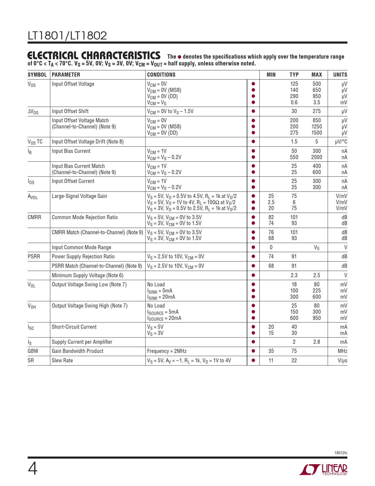 LT1801/LT1802 ELECTRICAL CHARACTERISTICSThe l denotes the specifi cations which apply over the temperature rangeof 0°C < TA < 70°C. VS = 5V, 0V; VS = 3V, 0V; VCM = VOUT = half supply, unless otherwise noted.SYMBOL PARAMETERCONDITIONSMINTYPMAXUNITS VOS Input Offset Voltage VCM = 0V l 125 500 μV VCM = 0V (MS8) l 140 650 μV VCM = 0V (DD) l 290 950 μV VCM = VS l 0.6 3.5 mV ΔVOS Input Offset Shift VCM = 0V to VS – 1.5V l 30 275 μV Input Offset Voltage Match VCM = 0V l 200 850 μV (Channel-to-Channel) (Note 9) VCM = 0V (MS8) l 200 1250 μV VCM = 0V (DD) l 275 1500 μV VOS TC Input Offset Voltage Drift (Note 8) l 1.5 5 μV/°C IB Input Bias Current VCM = 1V l 50 300 nA VCM = VS – 0.2V l 550 2000 nA Input Bias Current Match VCM = 1V l 25 400 nA (Channel-to-Channel) (Note 9) VCM = VS – 0.2V l 25 600 nA IOS Input Offset Current VCM = 1V l 25 300 nA VCM = VS – 0.2V l 25 300 nA AVOL Large-Signal Voltage Gain VS = 5V, VO = 0.5V to 4.5V, RL = 1k at VS/2 l 25 75 V/mV VS = 5V, VO = 1V to 4V, RL = 100Ω at VS/2 l 2.5 6 V/mV VS = 3V, VO = 0.5V to 2.5V, RL = 1k at VS/2 l 20 75 V/mV CMRR Common Mode Rejection Ratio VS = 5V, VCM = 0V to 3.5V l 82 101 dB VS = 3V, VCM = 0V to 1.5V l 74 93 dB CMRR Match (Channel-to-Channel) (Note 9) VS = 5V, VCM = 0V to 3.5V l 76 101 dB VS = 3V, VCM = 0V to 1.5V l 68 93 dB Input Common Mode Range l 0 VS V PSRR Power Supply Rejection Ratio VS = 2.5V to 10V, VCM = 0V l 74 91 dB PSRR Match (Channel-to-Channel) (Note 9) VS = 2.5V to 10V, VCM = 0V l 68 91 dB Minimum Supply Voltage (Note 6) l 2.3 2.5 V VOL Output Voltage Swing Low (Note 7) No Load l 18 80 mV ISINK = 5mA l 100 225 mV ISINK = 20mA l 300 600 mV VOH Output Voltage Swing High (Note 7) No Load l 25 80 mV ISOURCE = 5mA l 150 300 mV ISOURCE = 20mA l 600 950 mV ISC Short-Circuit Current VS = 5V l 20 40 mA VS = 3V l 15 30 mA IS Supply Current per Amplifi er l 2 2.8 mA GBW Gain Bandwidth Product Frequency = 2MHz l 35 75 MHz SR Slew Rate VS = 5V, AV = – 1, RL = 1k, VO = 1V to 4V l 11 22 V/μs 18012fc 4