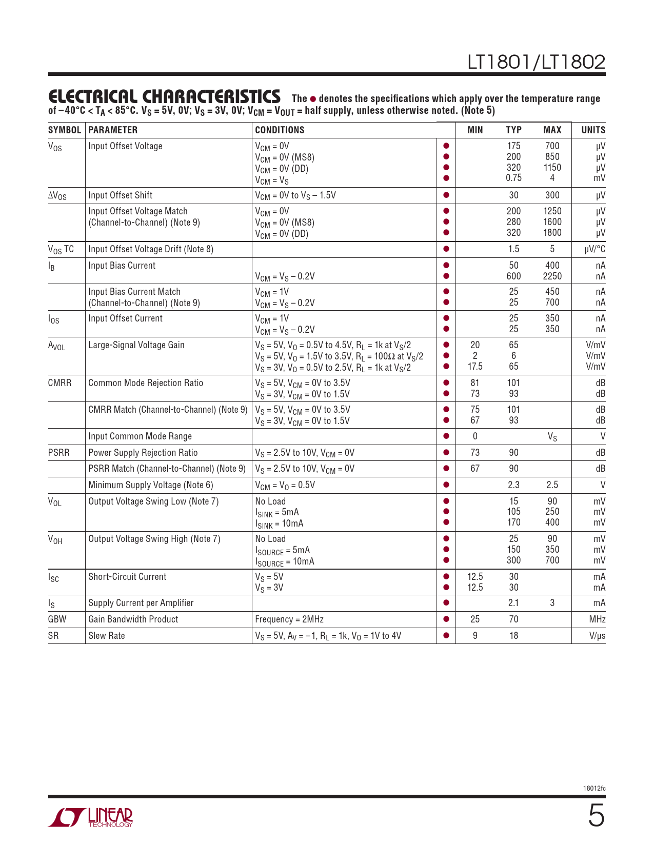 VOS Input Offset Voltage VCM = 0V l 175 700 μV V l CM = 0V (MS8) 200 850 μV V l CM = 0V (DD) 320 1150 μV V l 0.75 4 mV CM = VS ΔVOS Input Offset Shift VCM = 0V to VS – 1.5V l 30 300 μV Input Offset Voltage Match VCM = 0V l 200 1250 μV (Channel-to-Channel) (Note 9) V l CM = 0V (MS8) 280 1600 μV V l CM = 0V (DD) 320 1800 μV VOS TC Input Offset Voltage Drift (Note 8) l 1.5 5 μV/°C IB Input Bias Current l 50 400 nA VCM = VS – 0.2V l 600 2250 nA Input Bias Current Match VCM = 1V l 25 450 nA (Channel-to-Channel) (Note 9) V l CM = VS – 0.2V 25 700 nA IOS Input Offset Current VCM = 1V l 25 350 nA V l CM = VS – 0.2V 25 350 nA AVOL Large-Signal Voltage Gain VS = 5V, VO = 0.5V to 4.5V, RL = 1k at VS/2 l 20 65 V/mV V l S = 5V, VO = 1.5V to 3.5V, RL = 100Ω at VS/2 2 6 V/mV V l S = 3V, VO = 0.5V to 2.5V, RL = 1k at VS/2 17.5 65 V/mV CMRR Common Mode Rejection Ratio VS = 5V, VCM = 0V to 3.5V l 81 101 dB V l S = 3V, VCM = 0V to 1.5V 73 93 dB CMRR Match (Channel-to-Channel) (Note 9) VS = 5V, VCM = 0V to 3.5V l 75 101 dB V l S = 3V, VCM = 0V to 1.5V 67 93 dB Input Common Mode Range l 0 VS V PSRR Power Supply Rejection Ratio VS = 2.5V to 10V, VCM = 0V l 73 90 dB PSRR Match (Channel-to-Channel) (Note 9) VS = 2.5V to 10V, VCM = 0V l 67 90 dB Minimum Supply Voltage (Note 6) VCM = VO = 0.5V l 2.3 2.5 V VOL Output Voltage Swing Low (Note 7) No Load l 15 90 mV I l SINK = 5mA 105 250 mV I l SINK = 10mA 170 400 mV VOH Output Voltage Swing High (Note 7) No Load l 25 90 mV I l SOURCE = 5mA 150 350 mV I l SOURCE = 10mA 300 700 mV ISC Short-Circuit Current VS = 5V l 12.5 30 mA VS = 3V l 12.5 30 mA IS Supply Current per Amplifi er l 2.1 3 mA GBW Gain Bandwidth Product Frequency = 2MHz l 25 70 MHz SR Slew Rate VS = 5V, AV = – 1, RL = 1k, VO = 1V to 4V l 9 18 V/μs 18012fc 5