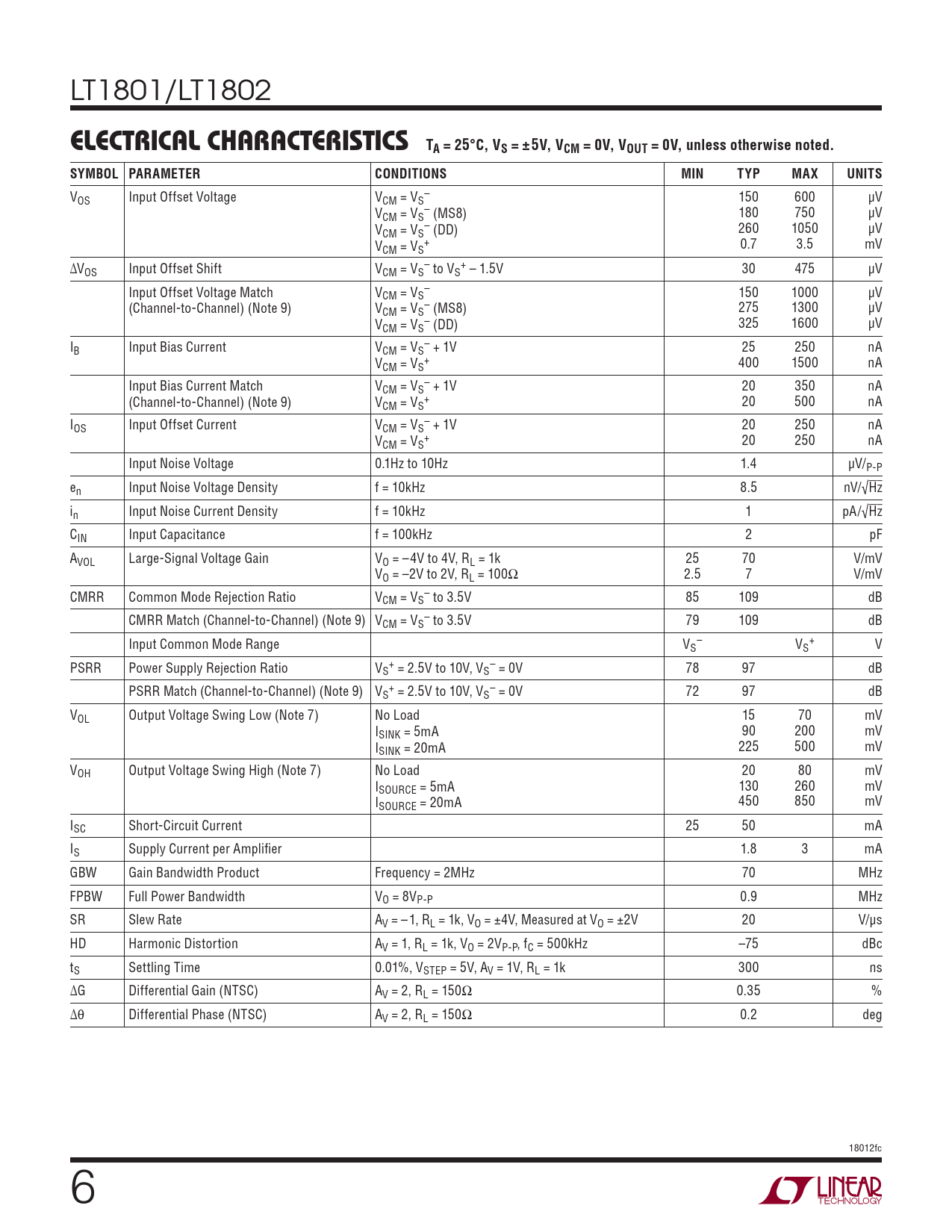 V – OS Input Offset Voltage VCM = VS 150 600 μV V – CM = VS (MS8) 180 750 μV V – CM = VS (DD) 260 1050 μV V + 0.7 3.5 mV CM = VS ΔV – + OS Input Offset Shift VCM = VS to VS – 1.5V 30 475 μV Input Offset Voltage Match V – CM = VS 150 1000 μV (Channel-to-Channel) (Note 9) V – CM = VS (MS8) 275 1300 μV V – CM = VS (DD) 325 1600 μV I – B Input Bias Current VCM = VS + 1V 25 250 nA V + CM = VS 400 1500 nA Input Bias Current Match V – CM = VS + 1V 20 350 nA (Channel-to-Channel) (Note 9) V + CM = VS 20 500 nA I – OS Input Offset Current VCM = VS + 1V 20 250 nA V + CM = VS 20 250 nA Input Noise Voltage 0.1Hz to 10Hz 1.4 μV/P-P en Input Noise Voltage Density f = 10kHz 8.5 nV/√Hz in Input Noise Current Density f = 10kHz 1 pA/√Hz CIN Input Capacitance f = 100kHz 2 pF AVOL Large-Signal Voltage Gain VO = –4V to 4V, RL = 1k 25 70 V/mV VO = –2V to 2V, RL = 100Ω 2.5 7 V/mV CMRR Common Mode Rejection Ratio V – CM = VS to 3.5V 85 109 dB CMRR Match (Channel-to-Channel) (Note 9) V – CM = VS to 3.5V 79 109 dB Input Common Mode Range V – + S VS V PSRR Power Supply Rejection Ratio V + – S = 2.5V to 10V, VS = 0V 78 97 dB PSRR Match (Channel-to-Channel) (Note 9) V + – S = 2.5V to 10V, VS = 0V 72 97 dB VOL Output Voltage Swing Low (Note 7) No Load 15 70 mV ISINK = 5mA 90 200 mV ISINK = 20mA 225 500 mV VOH Output Voltage Swing High (Note 7) No Load 20 80 mV ISOURCE = 5mA 130 260 mV ISOURCE = 20mA 450 850 mV ISC Short-Circuit Current 25 50 mA IS Supply Current per Amplifi er 1.8 3 mA GBW Gain Bandwidth Product Frequency = 2MHz 70 MHz FPBW Full Power Bandwidth VO = 8VP-P 0.9 MHz SR Slew Rate AV = –1, RL = 1k, VO = ±4V, Measured at VO = ±2V 20 V/μs HD Harmonic Distortion AV = 1, RL = 1k, VO = 2VP-P, fC = 500kHz –75 dBc tS Settling Time 0.01%, VSTEP = 5V, AV = 1V, RL = 1k 300 ns ΔG Differential Gain (NTSC) AV = 2, RL = 150Ω 0.35 % Δθ Differential Phase (NTSC) AV = 2, RL = 150Ω 0.2 deg 18012fc 6
