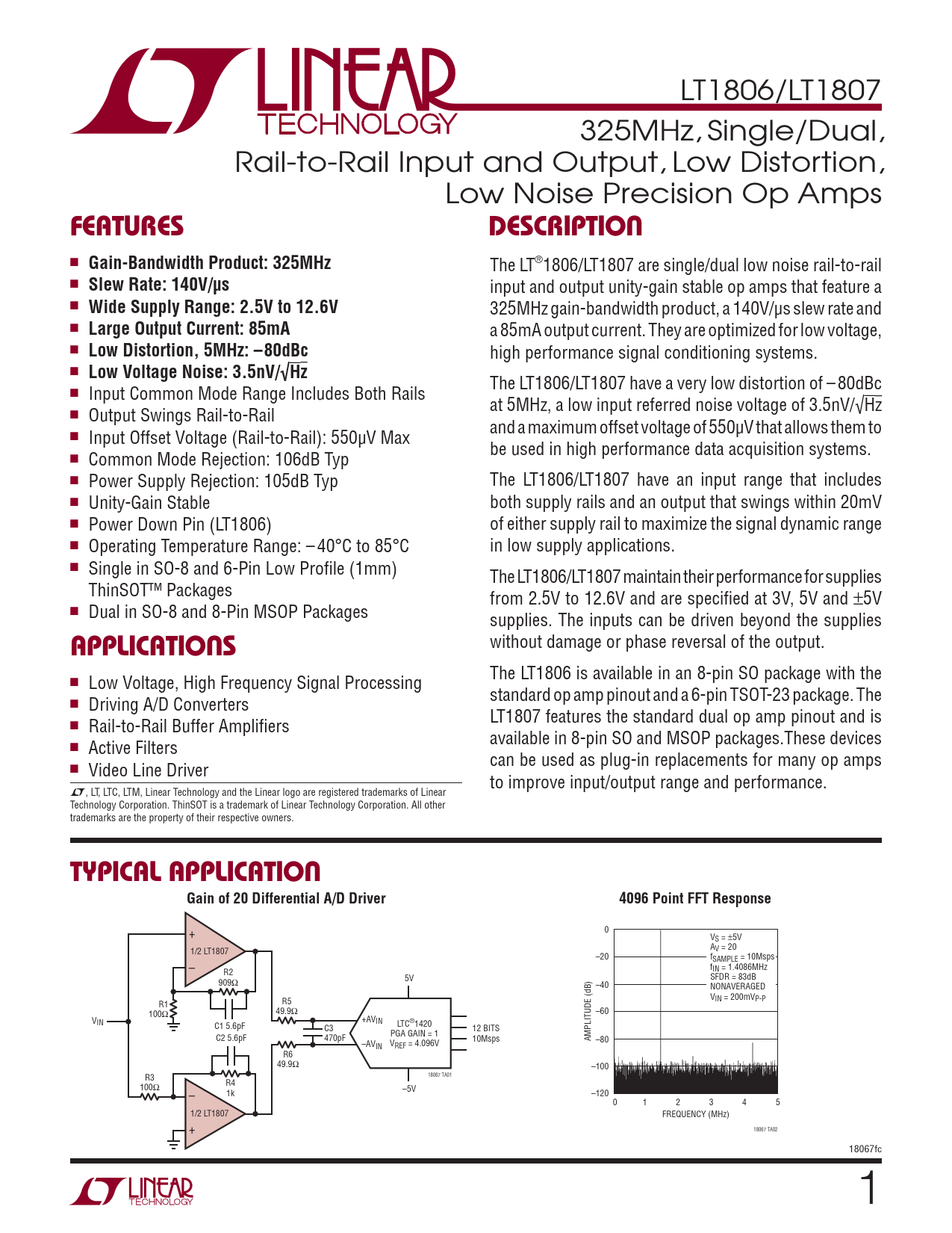 LT1806/LT1807 325MHz, Single/Dual, Rail-to-Rail Input and Output, Low Distortion, Low Noise Precision Op Amps