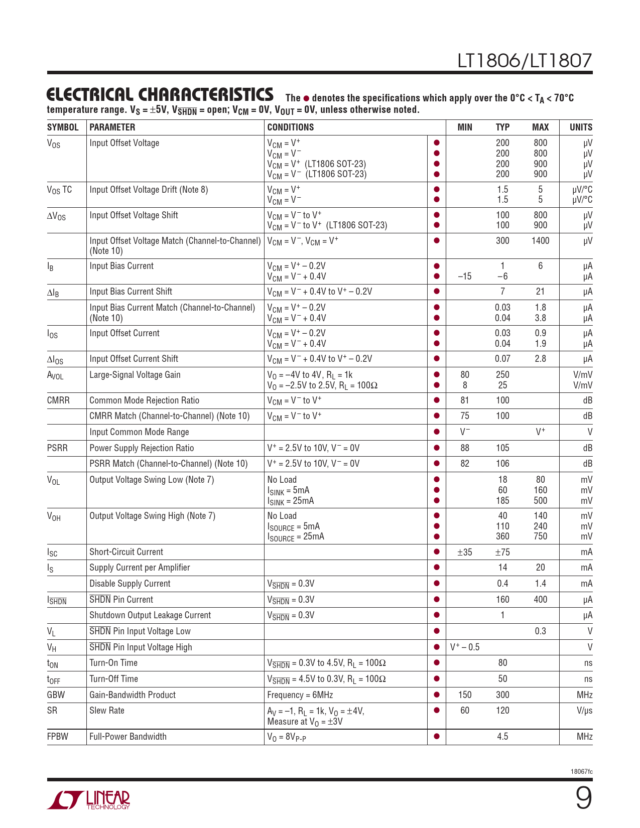 LT1806/LT1807 ThELECTRICAL CHARACTERISTICSe l denotes the specifi cations which apply over the 0°C < TA < 70°Ctemperature range. VS = ± 5V, VSHDN = open; VCM = 0V, VOUT = 0V, unless otherwise noted.SYMBOLPARAMETERCONDITIONSMINTYPMAXUNITS VOS Input Offset Voltage VCM = V+ l 200 800 μV VCM = V – l 200 800 μV VCM = V+ (LT1806 SOT-23) l 200 900 μV VCM = V – (LT1806 SOT-23) l 200 900 μV VOS TC Input Offset Voltage Drift (Note 8) VCM = V+ l 1.5 5 μV/°C VCM = V – l 1.5 5 μV/°C ΔV l OS Input Offset Voltage Shift VCM = V – to V+ 100 800 μV VCM = V – to V+ (LT1806 SOT-23) l 100 900 μV Input Offset Voltage Match (Channel-to-Channel) VCM = V –, VCM = V+ l 300 1400 μV (Note 10) IB Input Bias Current VCM = V+ – 0.2V l 1 6 μA VCM = V – + 0.4V l –15 – 6 μA ΔIB Input Bias Current Shift VCM = V – + 0.4V to V+ – 0.2V l 7 21 μA Input Bias Current Match (Channel-to-Channel) VCM = V+ – 0.2V l 0.03 1.8 μA (Note 10) VCM = V – + 0.4V l 0.04 3.8 μA IOS Input Offset Current VCM = V+ – 0.2V l 0.03 0.9 μA VCM = V – + 0.4V l 0.04 1.9 μA ΔIOS Input Offset Current Shift VCM = V – + 0.4V to V+ – 0.2V l 0.07 2.8 μA AVOL Large-Signal Voltage Gain VO = –4V to 4V, RL = 1k l 80 250 V/mV VO = –2.5V to 2.5V, RL = 100Ω l 8 25 V/mV CMRR Common Mode Rejection Ratio VCM = V – to V+ l 81 100 dB CMRR Match (Channel-to-Channel) (Note 10) VCM = V – to V+ l 75 100 dB Input Common Mode Range l V – V+ V PSRR Power Supply Rejection Ratio V+ = 2.5V to 10V, V – = 0V l 88 105 dB PSRR Match (Channel-to-Channel) (Note 10) V+ = 2.5V to 10V, V – = 0V l 82 106 dB VOL Output Voltage Swing Low (Note 7) No Load l 18 80 mV ISINK = 5mA l 60 160 mV ISINK = 25mA l 185 500 mV VOH Output Voltage Swing High (Note 7) No Load l 40 140 mV ISOURCE = 5mA l 110 240 mV ISOURCE = 25mA l 360 750 mV ISC Short-Circuit Current l ±35 ±75 mA IS Supply Current per Amplifi er l 14 20 mA Disable Supply Current VSHDN = 0.3V l 0.4 1.4 mA ISHDN SHDN Pin Current VSHDN = 0.3V l 160 400 μA Shutdown Output Leakage Current VSHDN = 0.3V l 1 μA VL SHDN Pin Input Voltage Low l 0.3 V VH SHDN Pin Input Voltage High l V+ – 0.5 V tON Turn-On Time VSHDN = 0.3V to 4.5V, RL = 100Ω l 80 ns tOFF Turn-Off Time VSHDN = 4.5V to 0.3V, RL = 100Ω l 50 ns GBW Gain-Bandwidth Product Frequency = 6MHz l 150 300 MHz SR Slew Rate A l V = –1, RL = 1k, VO = ± 4V, 60 120 V/μs Measure at VO = ±3V FPBW Full-Power Bandwidth VO = 8VP-P l 4.5 MHz 18067fc 9