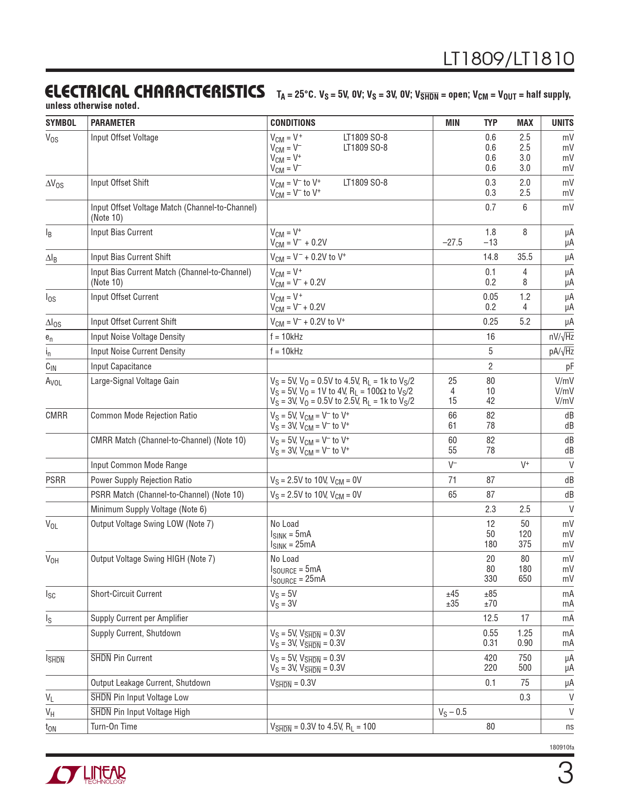 VOS Input Offset Voltage VCM = V + LT1809 SO-8 0.6 2.5 mV VCM = V– LT1809 SO-8 0.6 2.5 mV VCM = V+ 0.6 3.0 mV VCM = V– 0.6 3.0 mV ΔVOS Input Offset Shift VCM = V– to V+ LT1809 SO-8 0.3 2.0 mV VCM = V– to V+ 0.3 2.5 mV Input Offset Voltage Match (Channel-to-Channel) 0.7 6 mV (Note 10) IB Input Bias Current VCM = V+ 1.8 8 μA VCM = V– + 0.2V –27.5 –13 μA ΔIB Input Bias Current Shift VCM = V – + 0.2V to V+ 14.8 35.5 μA Input Bias Current Match (Channel-to-Channel) VCM = V+ 0.1 4 μA (Note 10) VCM = V– + 0.2V 0.2 8 μA IOS Input Offset Current VCM = V + 0.05 1.2 μA VCM = V– + 0.2V 0.2 4 μA ΔIOS Input Offset Current Shift VCM = V– + 0.2V to V+ 0.25 5.2 μA en Input Noise Voltage Density f = 10kHz 16 nV/√Hz in Input Noise Current Density f = 10kHz 5 pA/√Hz CIN Input Capacitance 2 pF AVOL Large-Signal Voltage Gain VS = 5V, VO = 0.5V to 4.5V, RL = 1k to VS/2 25 80 V/mV VS = 5V, VO = 1V to 4V, RL = 100Ω to VS/2 4 10 V/mV VS = 3V, VO = 0.5V to 2.5V, RL = 1k to VS/2 15 42 V/mV CMRR Common Mode Rejection Ratio VS = 5V, VCM = V– to V+ 66 82 dB VS = 3V, VCM = V– to V+ 61 78 dB CMRR Match (Channel-to-Channel) (Note 10) VS = 5V, VCM = V– to V+ 60 82 dB VS = 3V, VCM = V– to V+ 55 78 dB Input Common Mode Range V– V+ V PSRR Power Supply Rejection Ratio VS = 2.5V to 10V, VCM = 0V 71 87 dB PSRR Match (Channel-to-Channel) (Note 10) VS = 2.5V to 10V, VCM = 0V 65 87 dB Minimum Supply Voltage (Note 6) 2.3 2.5 V VOL Output Voltage Swing LOW (Note 7) No Load 12 50 mV ISINK = 5mA 50 120 mV ISINK = 25mA 180 375 mV VOH Output Voltage Swing HIGH (Note 7) No Load 20 80 mV ISOURCE = 5mA 80 180 mV ISOURCE = 25mA 330 650 mV ISC Short-Circuit Current VS = 5V ±45 ±85 mA VS = 3V ±35 ±70 mA IS Supply Current per Amplifi er 12.5 17 mA Supply Current, Shutdown VS = 5V, VSHDN = 0.3V 0.55 1.25 mA VS = 3V, VSHDN = 0.3V 0.31 0.90 mA ISHDN SHDN Pin Current VS = 5V, VSHDN = 0.3V 420 750 μA VS = 3V, VSHDN = 0.3V 220 500 μA Output Leakage Current, Shutdown VSHDN = 0.3V 0.1 75 μA VL SHDN Pin Input Voltage Low 0.3 V VH SHDN Pin Input Voltage High VS – 0.5 V tON Turn-On Time VSHDN = 0.3V to 4.5V, RL = 100 80 ns 180910fa 3
