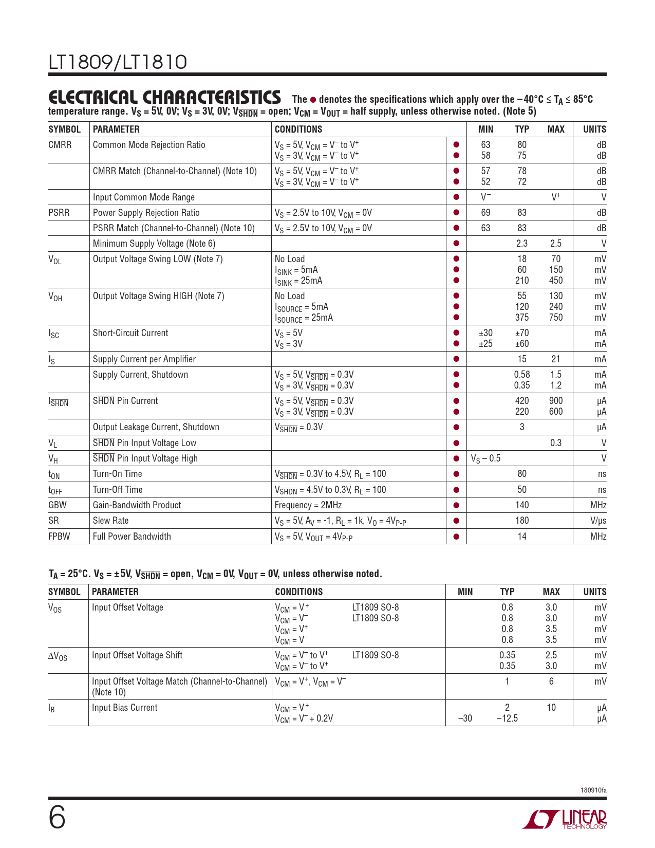 VOS Input Offset Voltage VCM = V + LT1809 SO-8 0.8 3.0 mV VCM = V– LT1809 SO-8 0.8 3.0 mV VCM = V+ 0.8 3.5 mV VCM = V– 0.8 3.5 mV ΔVOS Input Offset Voltage Shift VCM = V– to V+ LT1809 SO-8 0.35 2.5 mV VCM = V– to V+ 0.35 3.0 mV Input Offset Voltage Match (Channel-to-Channel) VCM = V+, VCM = V– 1 6 mV (Note 10) IB Input Bias Current VCM = V + 2 10 μA VCM = V– + 0.2V –30 –12.5 μA 180910fa 6
