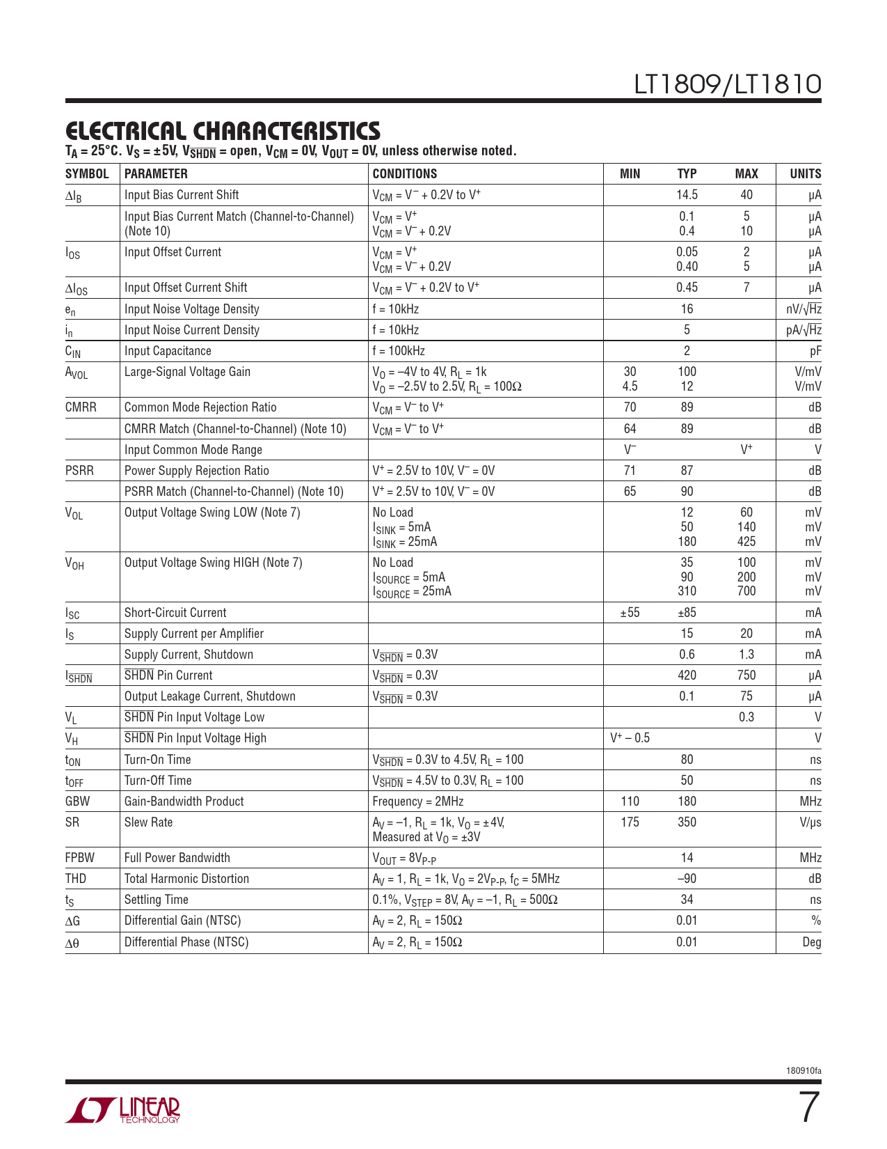 ΔIB Input Bias Current Shift VCM = V – + 0.2V to V+ 14.5 40 μA Input Bias Current Match (Channel-to-Channel) VCM = V+ 0.1 5 μA (Note 10) VCM = V– + 0.2V 0.4 10 μA IOS Input Offset Current VCM = V+ 0.05 2 μA VCM = V– + 0.2V 0.40 5 μA ΔIOS Input Offset Current Shift VCM = V– + 0.2V to V+ 0.45 7 μA en Input Noise Voltage Density f = 10kHz 16 nV/√Hz in Input Noise Current Density f = 10kHz 5 pA/√Hz CIN Input Capacitance f = 100kHz 2 pF AVOL Large-Signal Voltage Gain VO = –4V to 4V, RL = 1k 30 100 V/mV VO = –2.5V to 2.5V, RL = 100Ω 4.5 12 V/mV CMRR Common Mode Rejection Ratio VCM = V– to V+ 70 89 dB CMRR Match (Channel-to-Channel) (Note 10) VCM = V– to V+ 64 89 dB Input Common Mode Range V– V+ V PSRR Power Supply Rejection Ratio V+ = 2.5V to 10V, V– = 0V 71 87 dB PSRR Match (Channel-to-Channel) (Note 10) V+ = 2.5V to 10V, V– = 0V 65 90 dB VOL Output Voltage Swing LOW (Note 7) No Load 12 60 mV ISINK = 5mA 50 140 mV ISINK = 25mA 180 425 mV VOH Output Voltage Swing HIGH (Note 7) No Load 35 100 mV ISOURCE = 5mA 90 200 mV ISOURCE = 25mA 310 700 mV ISC Short-Circuit Current ±55 ±85 mA IS Supply Current per Amplifi er 15 20 mA Supply Current, Shutdown VSHDN = 0.3V 0.6 1.3 mA ISHDN SHDN Pin Current VSHDN = 0.3V 420 750 μA Output Leakage Current, Shutdown VSHDN = 0.3V 0.1 75 μA VL SHDN Pin Input Voltage Low 0.3 V VH SHDN Pin Input Voltage High V+ – 0.5 V tON Turn-On Time VSHDN = 0.3V to 4.5V, RL = 100 80 ns tOFF Turn-Off Time VSHDN = 4.5V to 0.3V, RL = 100 50 ns GBW Gain-Bandwidth Product Frequency = 2MHz 110 180 MHz SR Slew Rate AV = –1, RL = 1k, VO = ± 4V, 175 350 V/μs Measured at VO = ±3V FPBW Full Power Bandwidth VOUT = 8VP-P 14 MHz THD Total Harmonic Distortion AV = 1, RL = 1k, VO = 2VP-P, fC = 5MHz –90 dB tS Settling Time 0.1%, VSTEP = 8V, AV = –1, RL = 500Ω 34 ns ΔG Differential Gain (NTSC) AV = 2, RL = 150Ω 0.01 % Δθ Differential Phase (NTSC) AV = 2, RL = 150Ω 0.01 Deg 180910fa 7